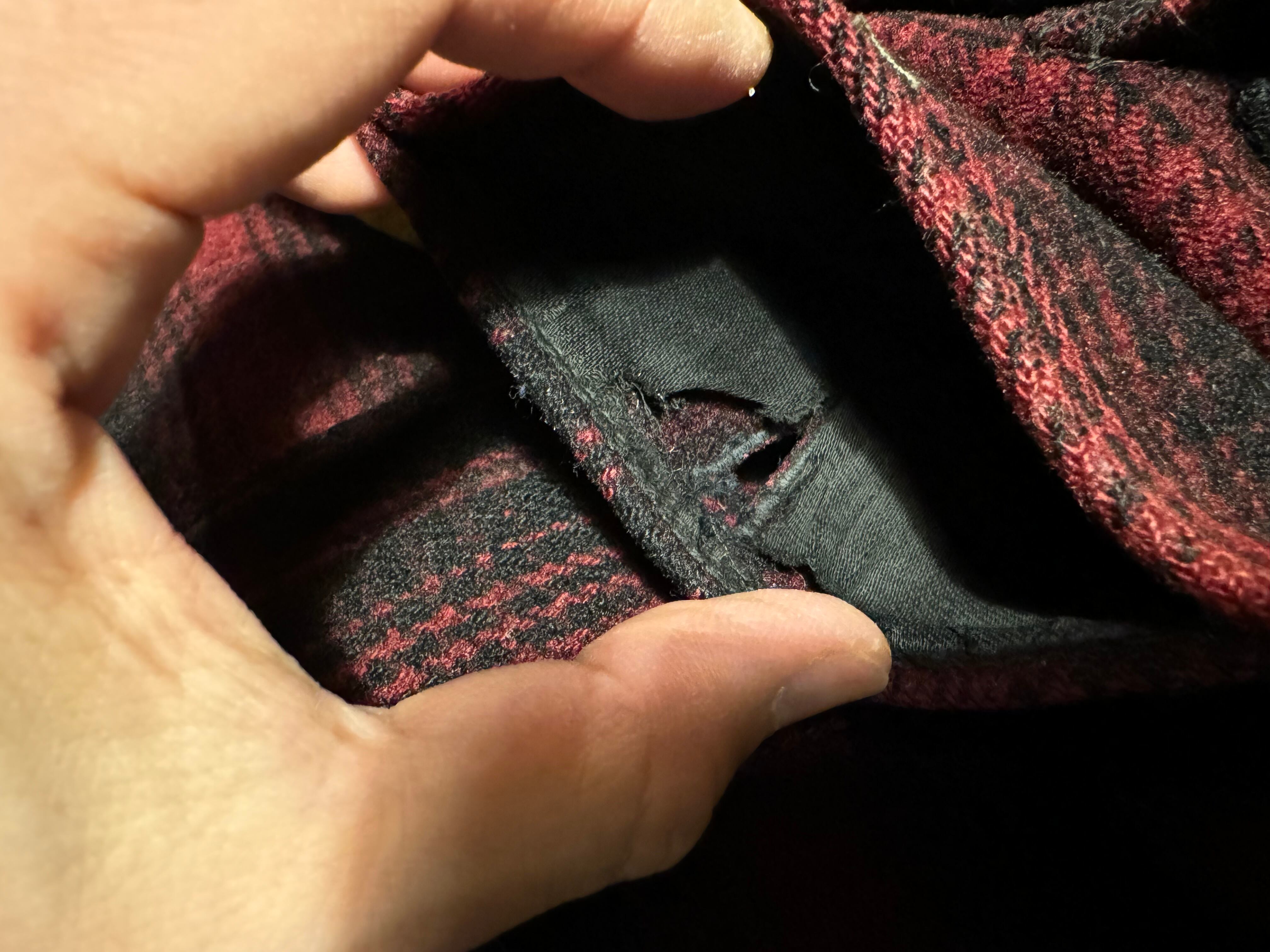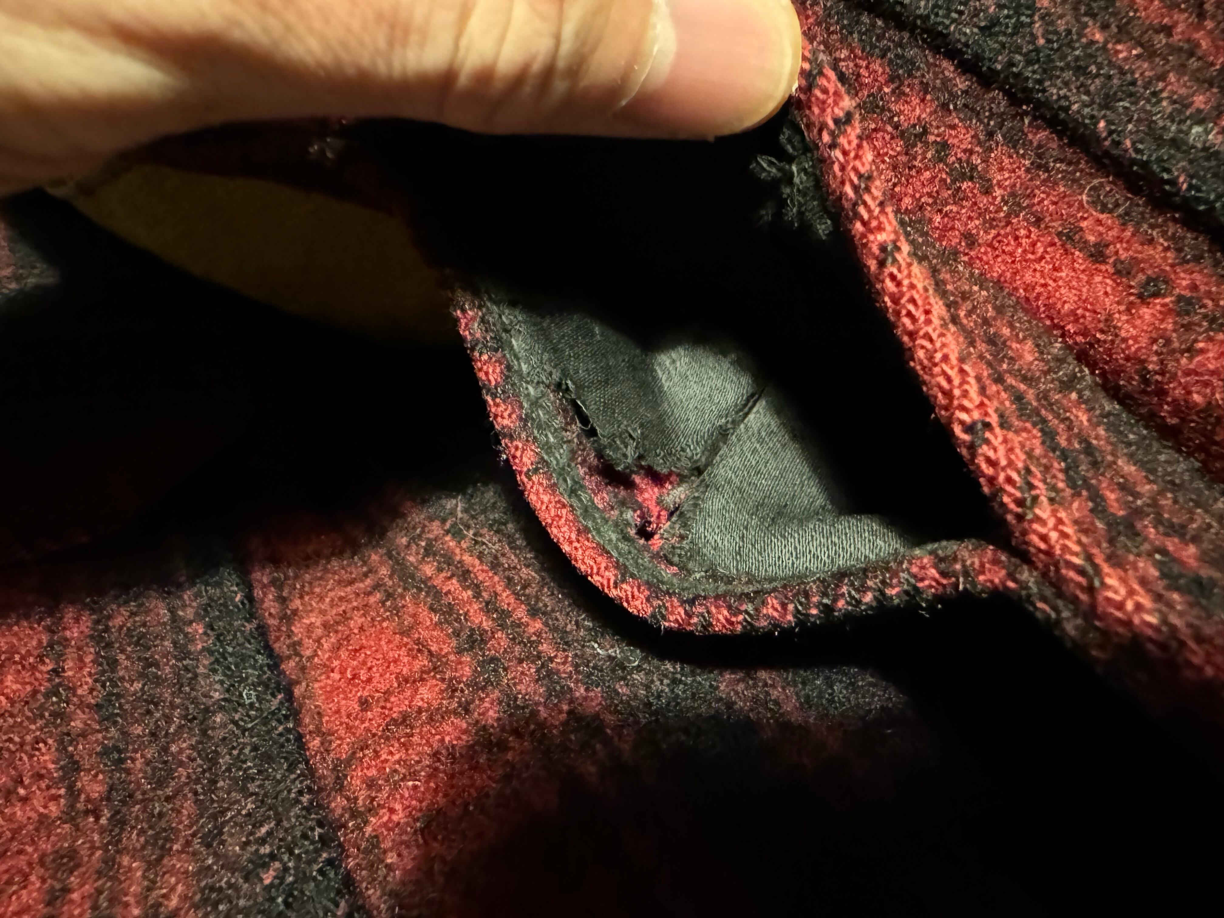 *前立てで隠れていて普通に着用するには見えない箇所ですが、第3、第4ボタンのボタンホールの裏地生地が少し裂けています。ボタンの開閉には問題ありません。10〜11枚目の画像をご確認ください。