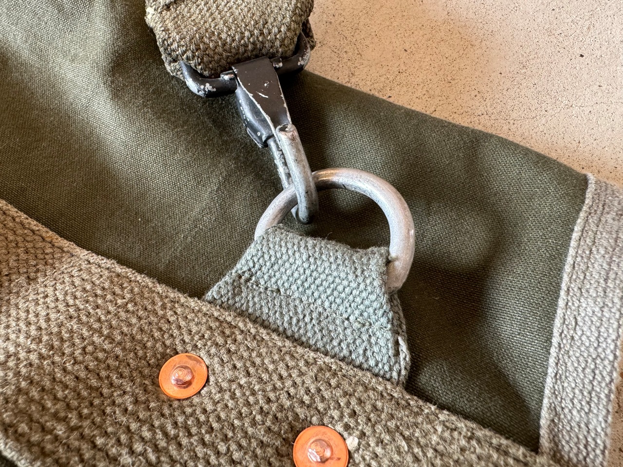 開口部をとめる、内側についたフックとD環は50年代フランス軍で使われていた物。