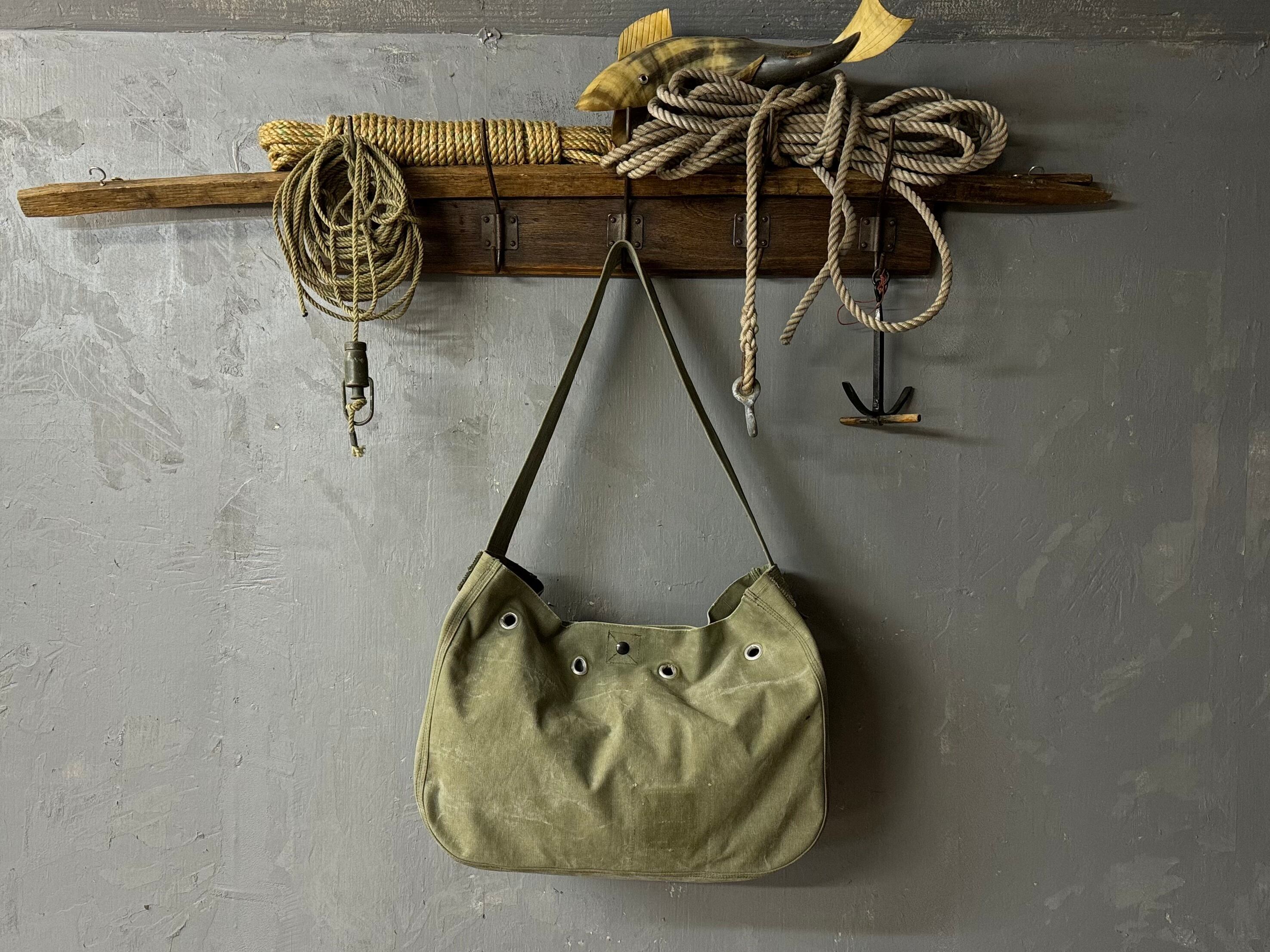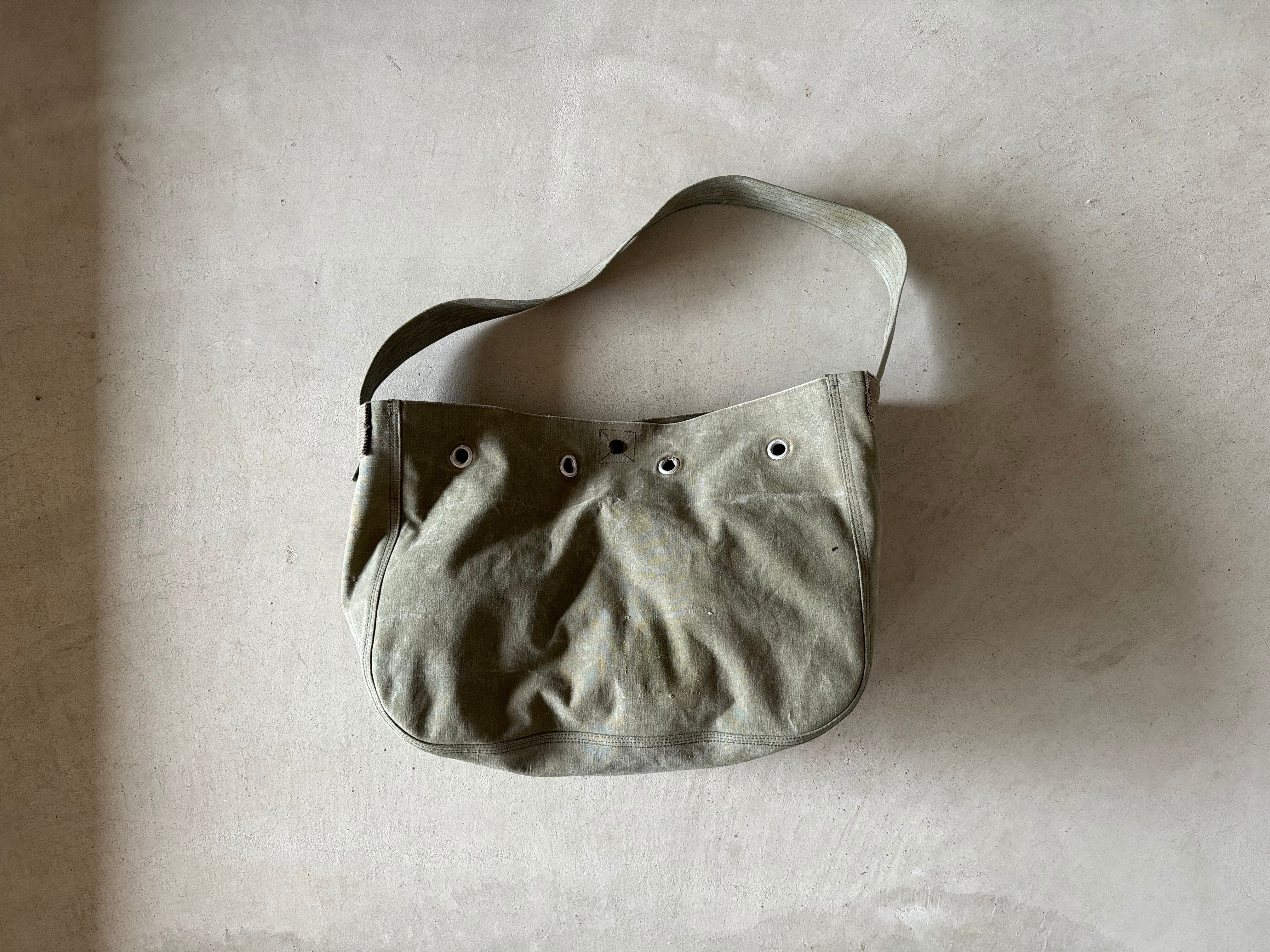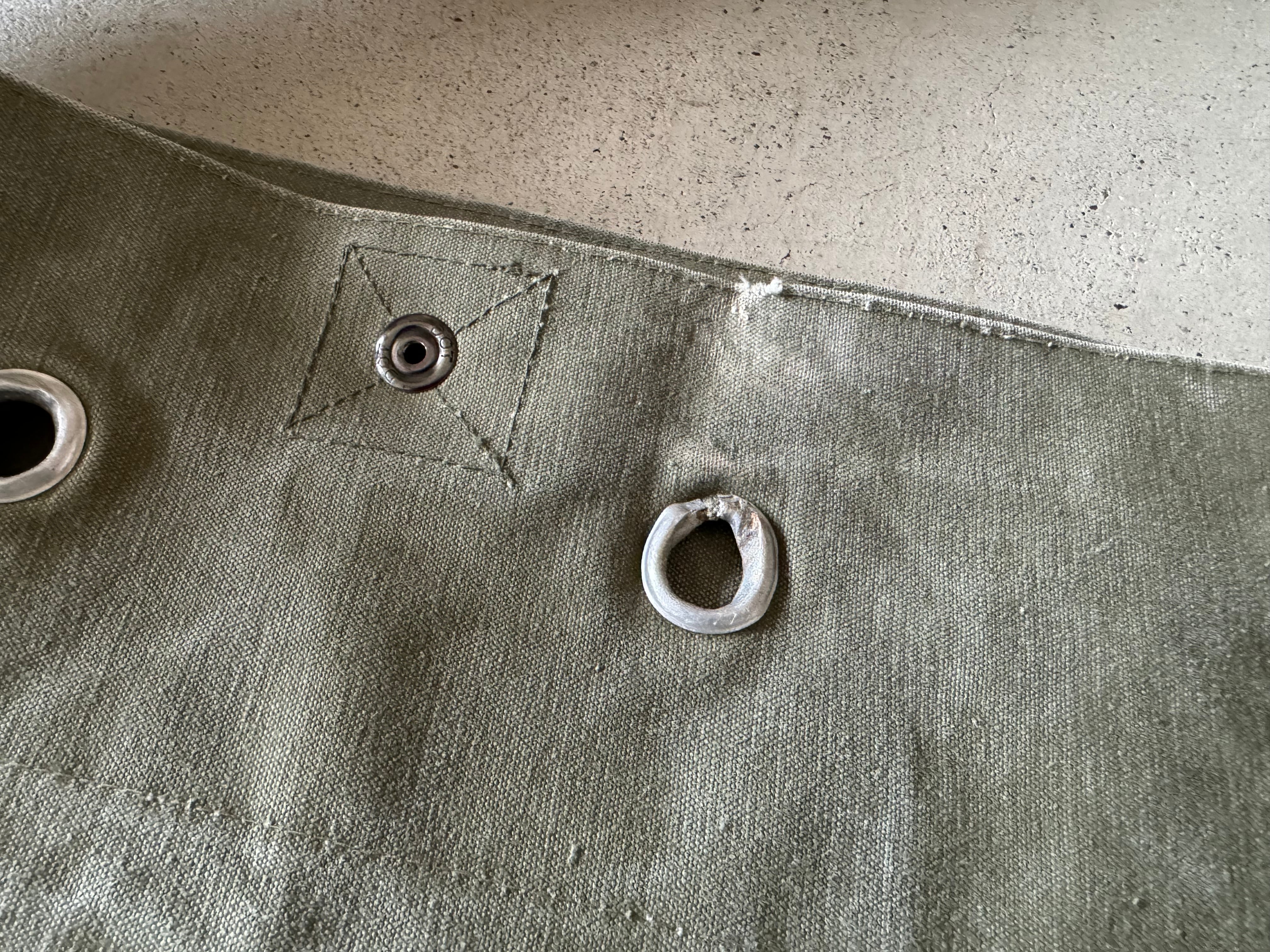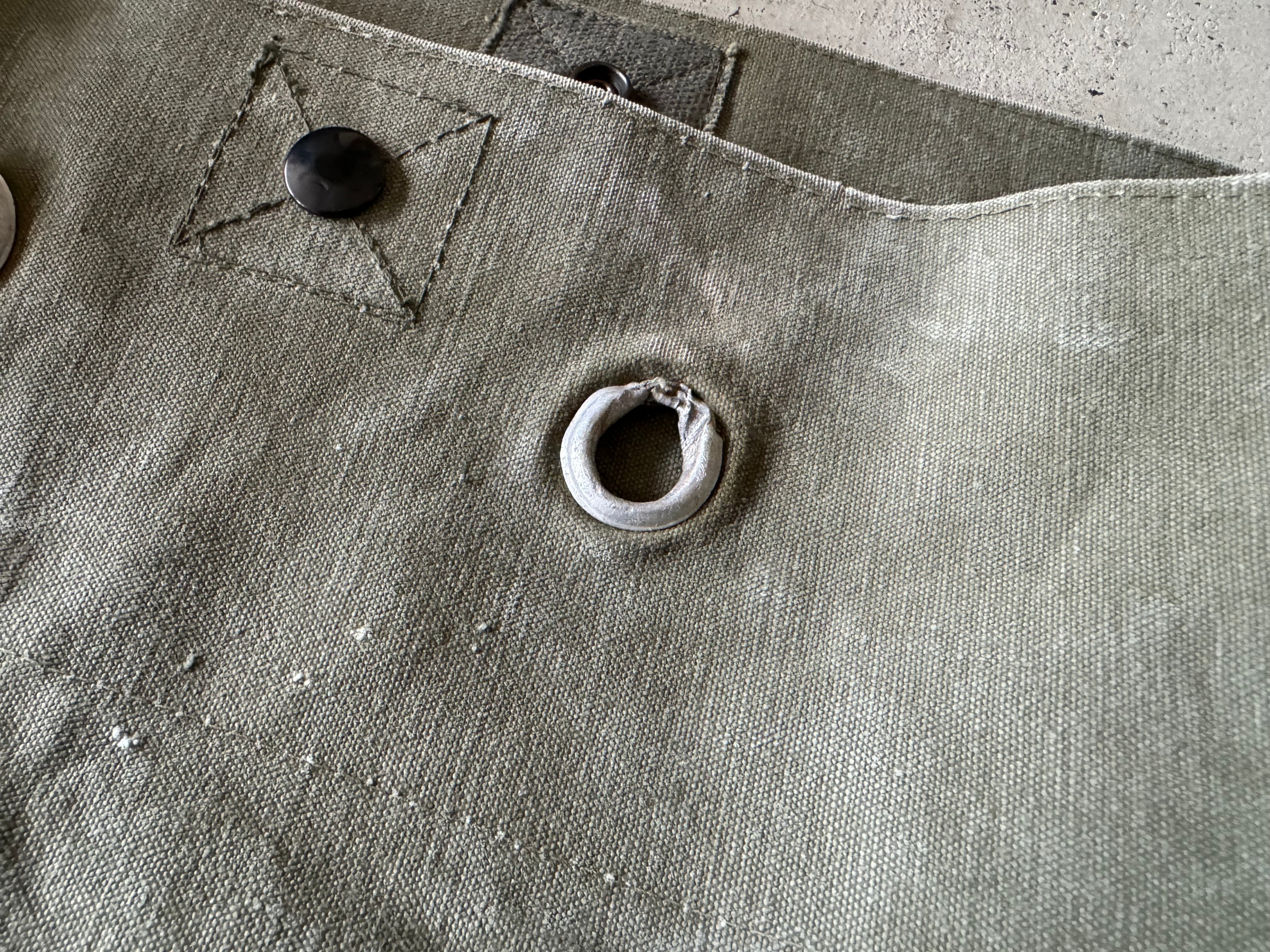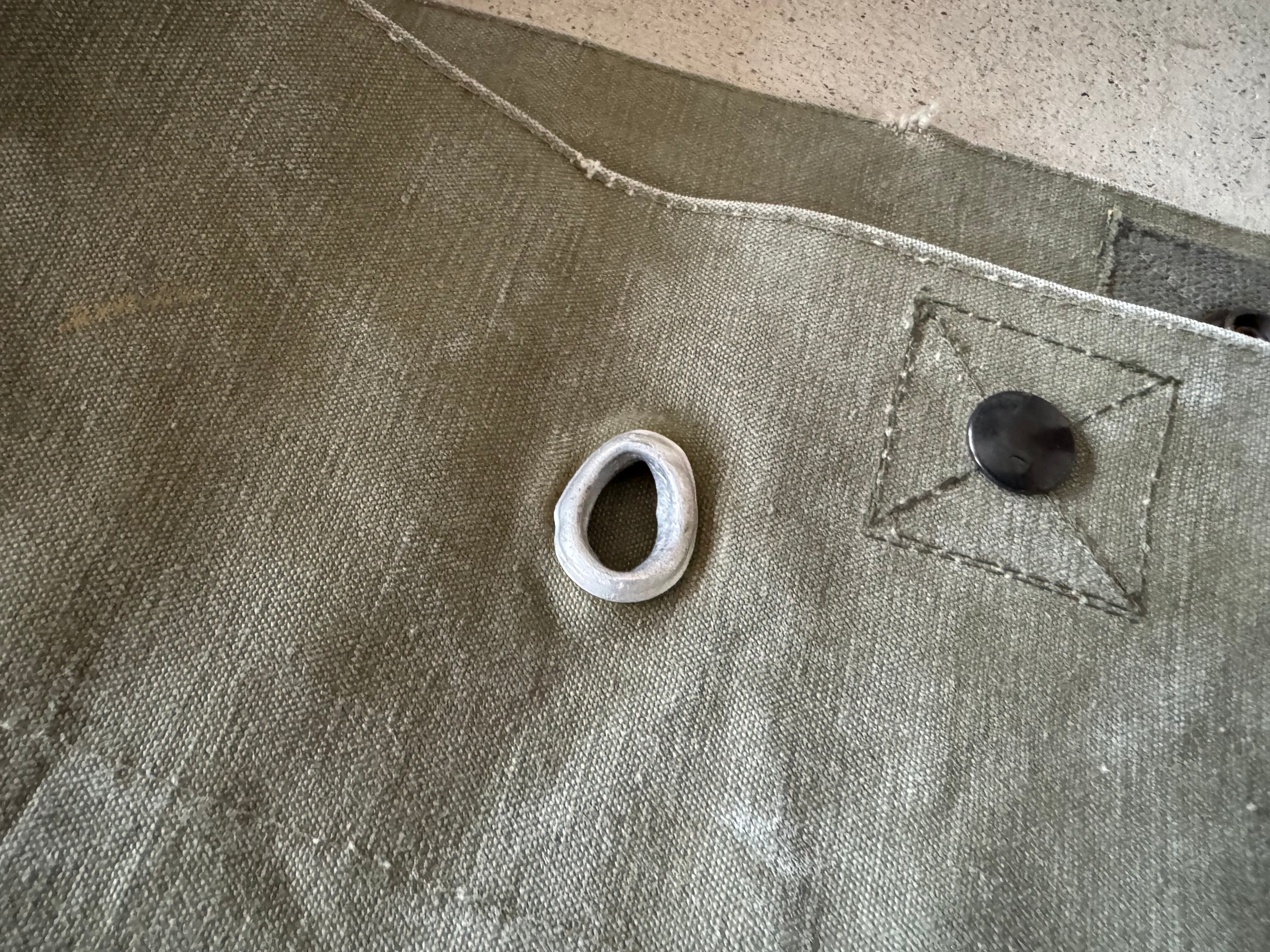 ボディーの生地は詳細不明のユーロミリタリーのダッフルバッグ。素材はガシッと丈夫なコットンキャンバス素材で、ヴィンテージの雰囲気満載です。開口部にはアルミ素材のハトメ。ヴィンテージ感溢れる仕様です。