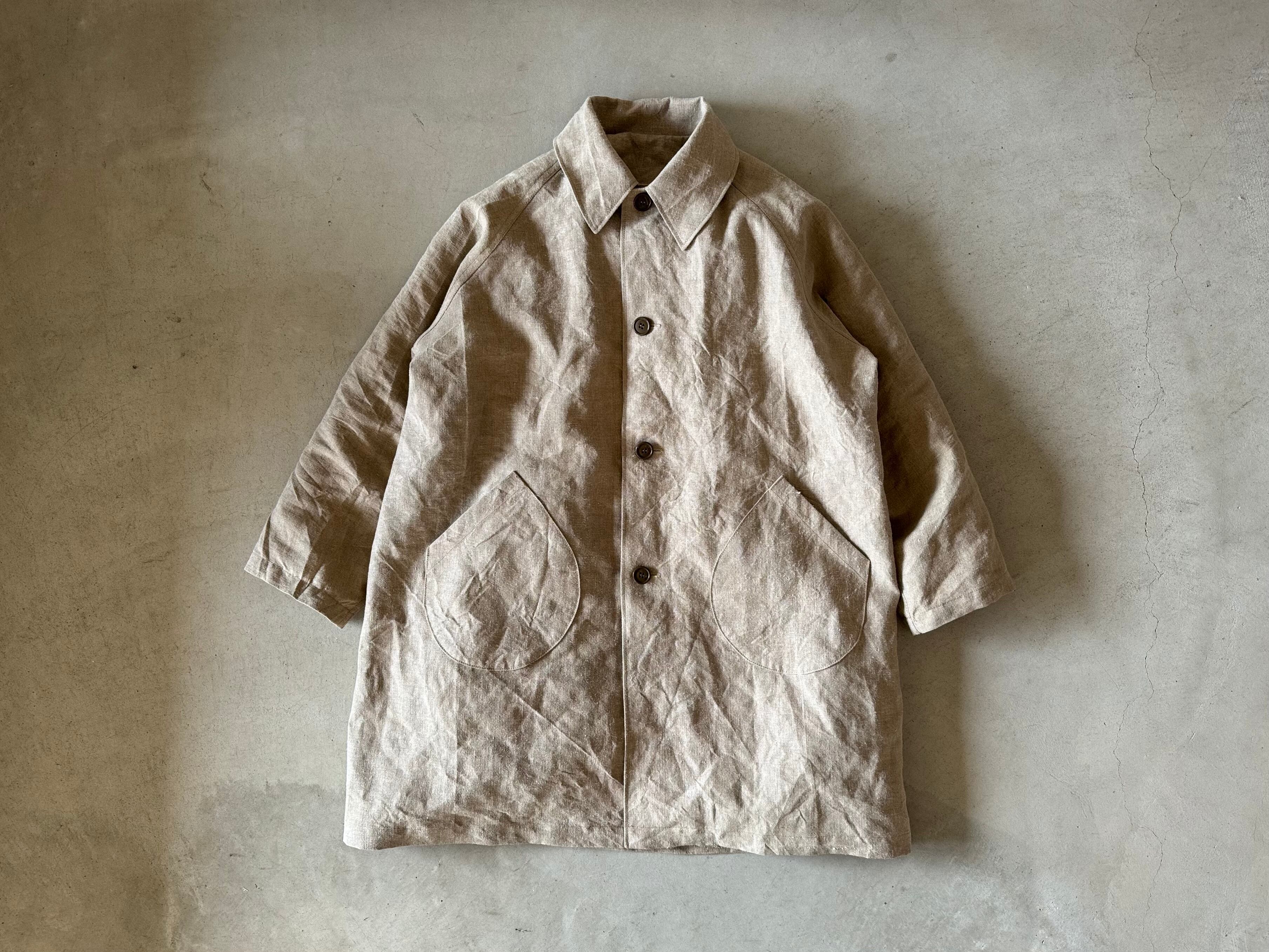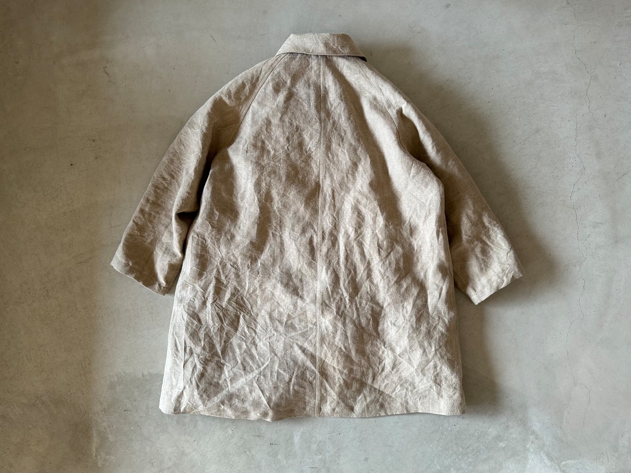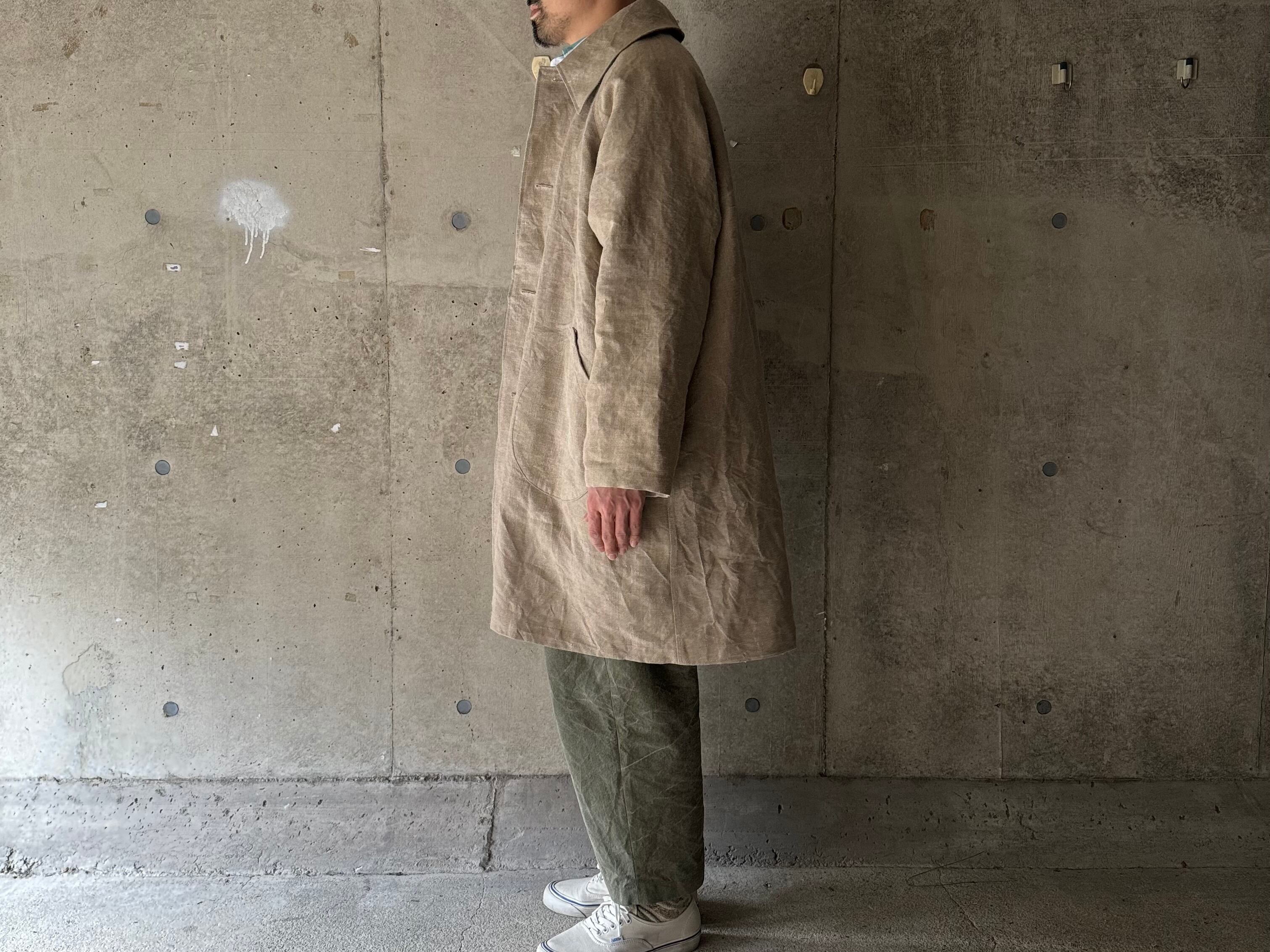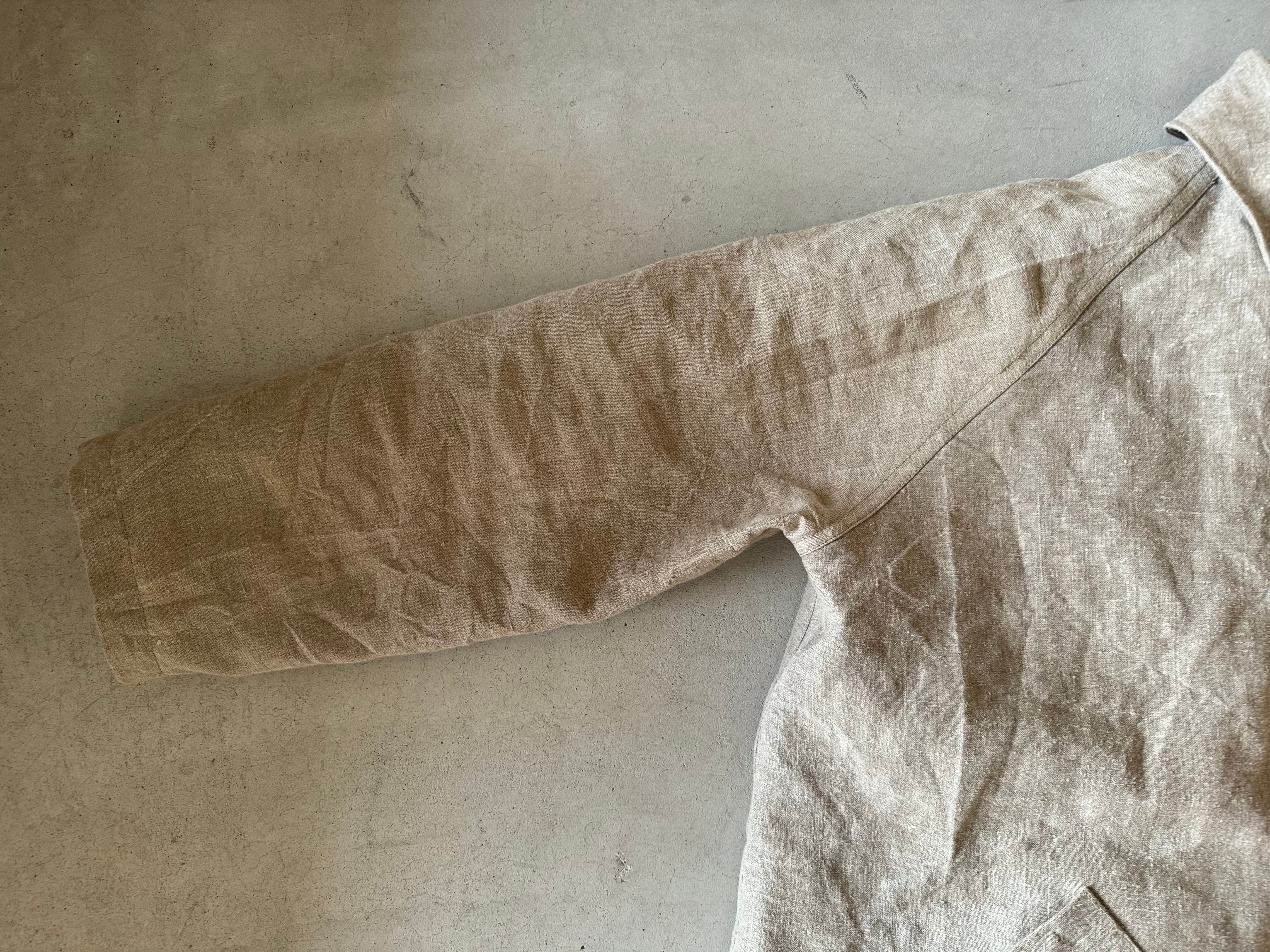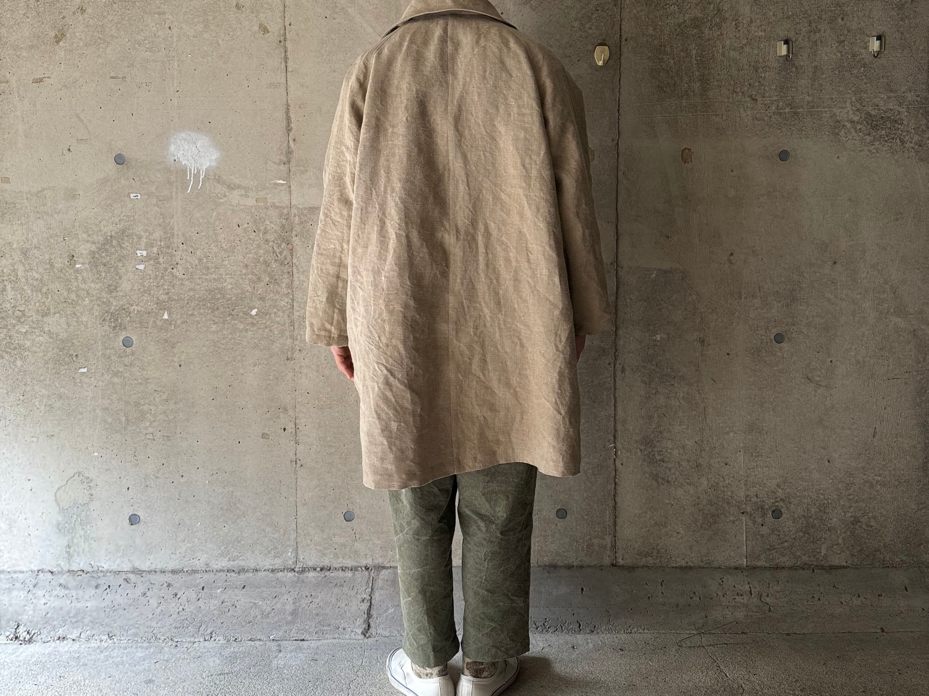 ヴィンテージのリネン生地でオーバーサイズで着用する、一枚袖のコートを作りました。ハリのある厚めのリネン素材で、独特な生地感があるスプリングコートです。