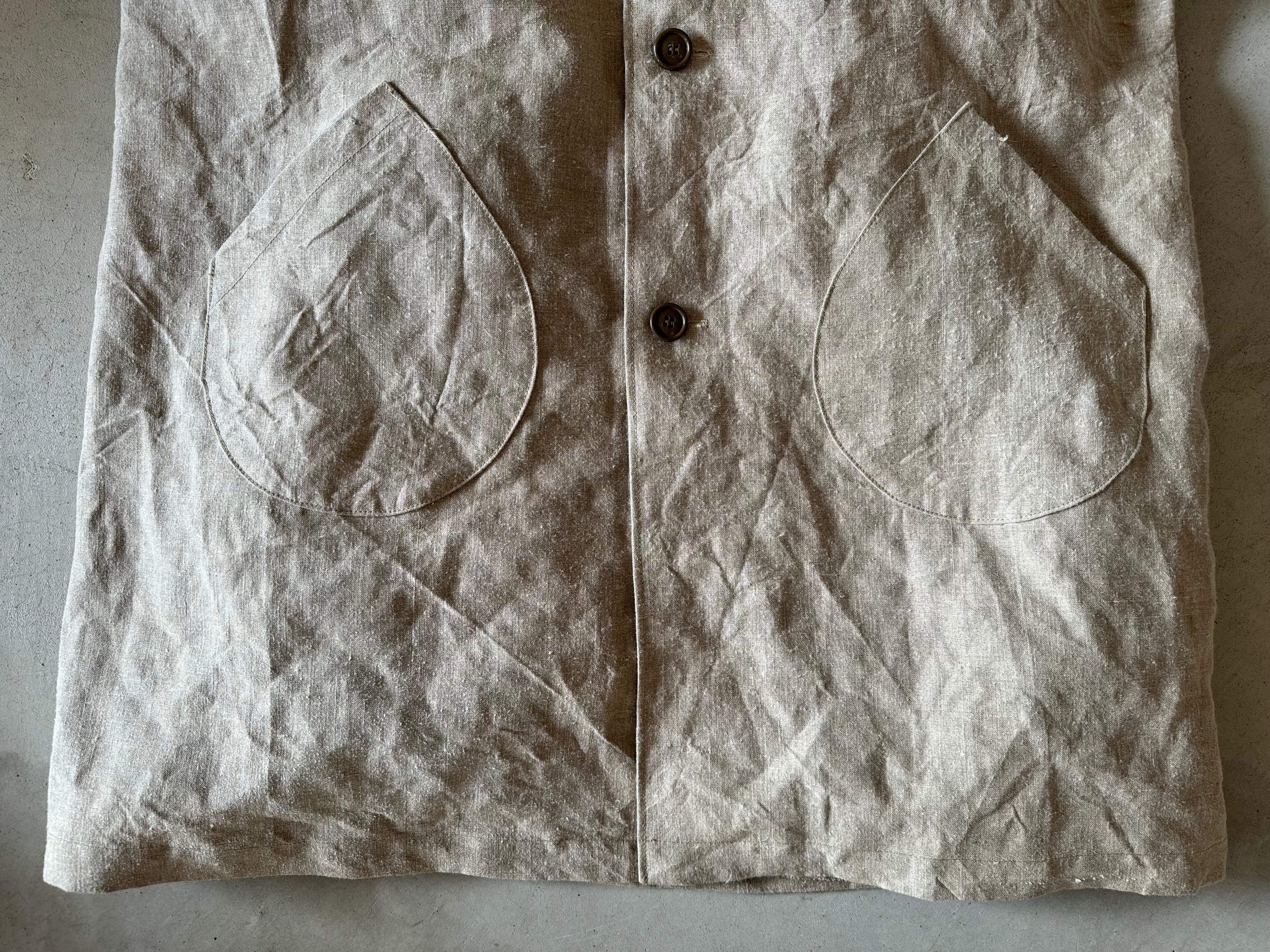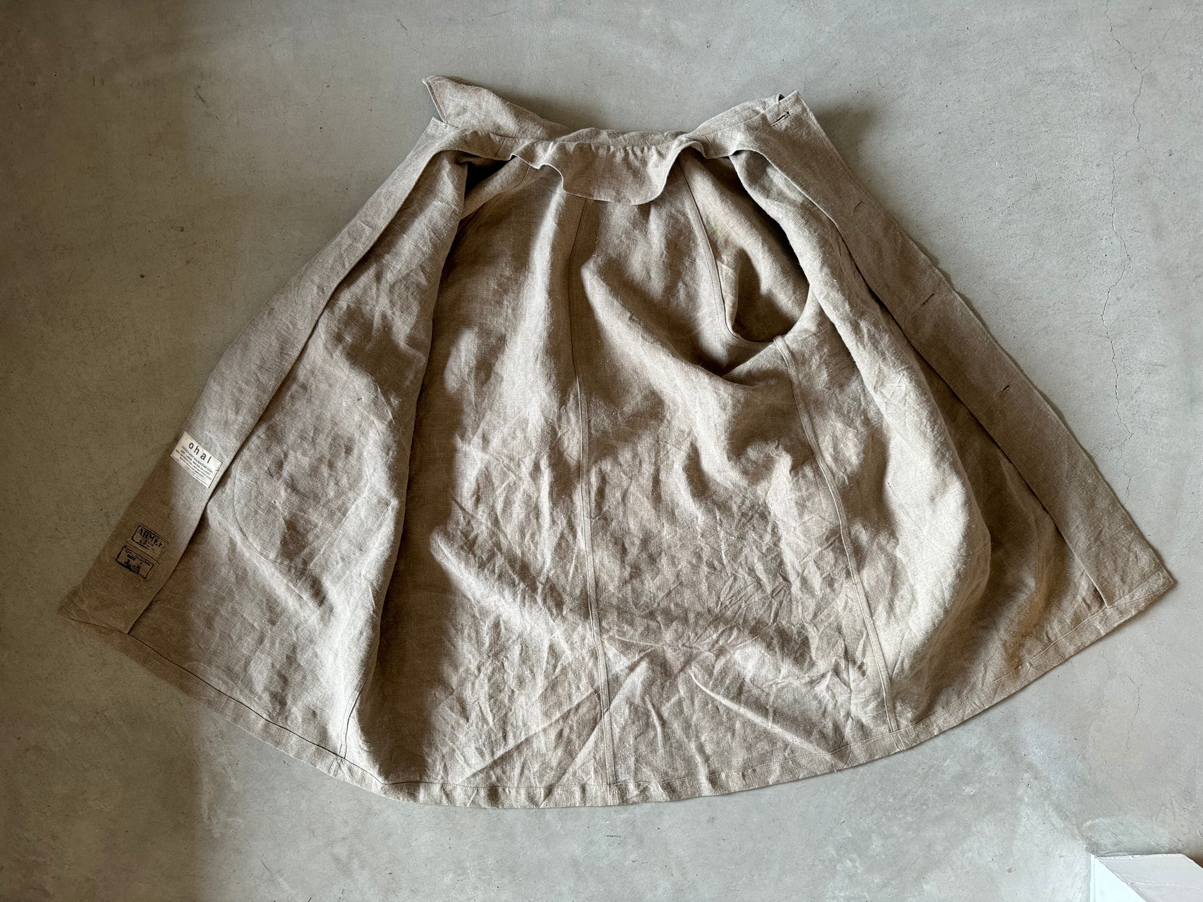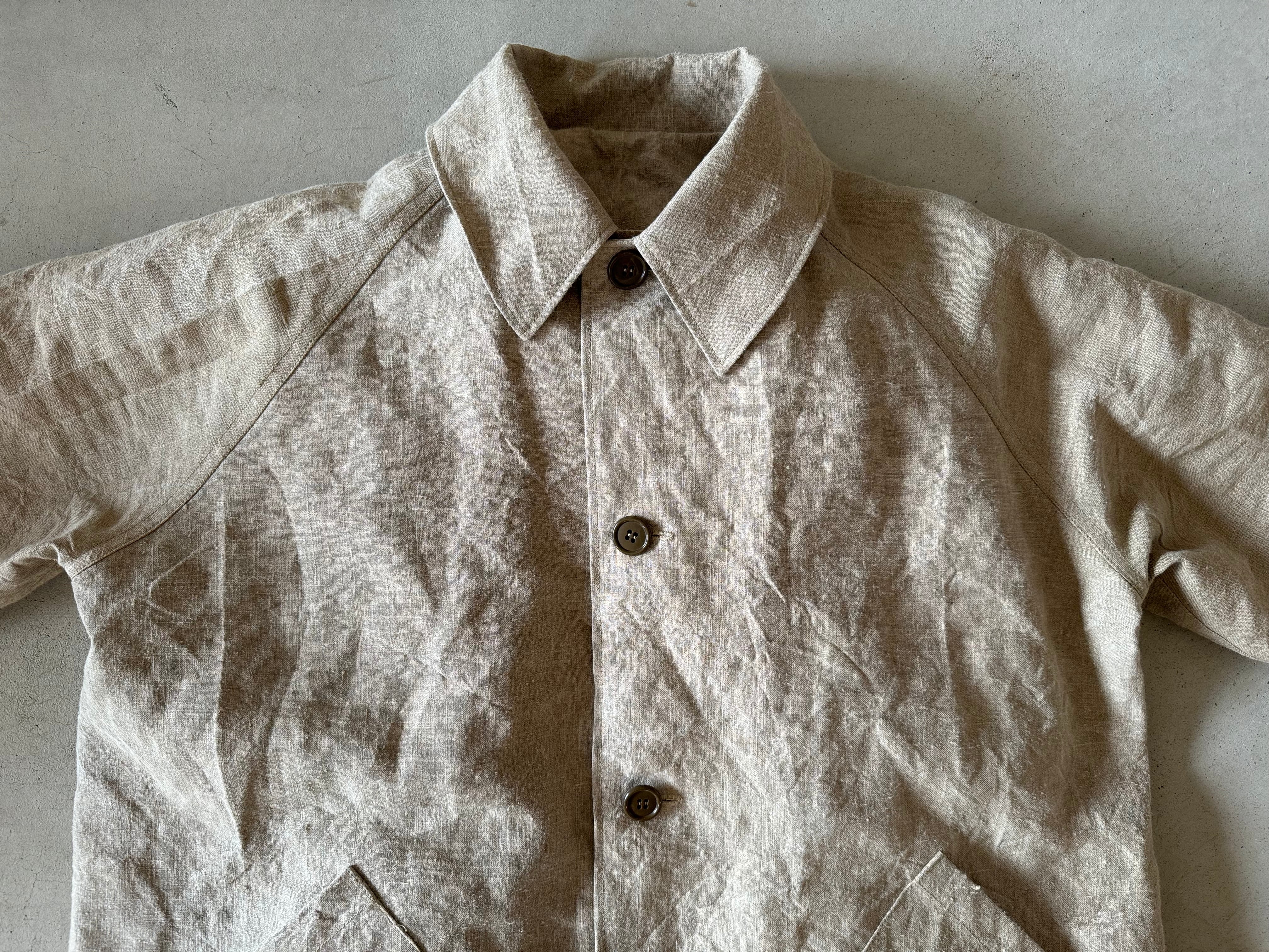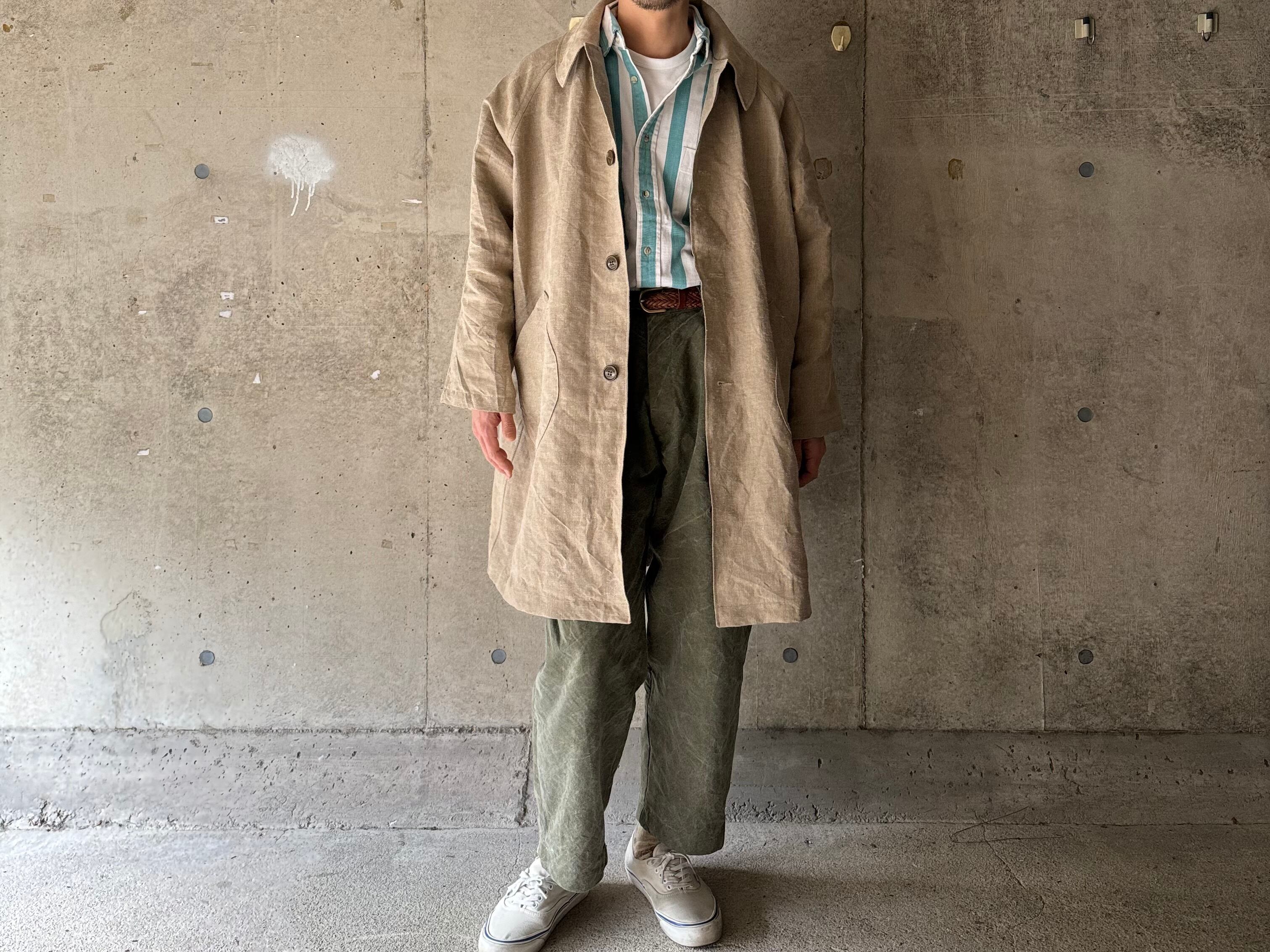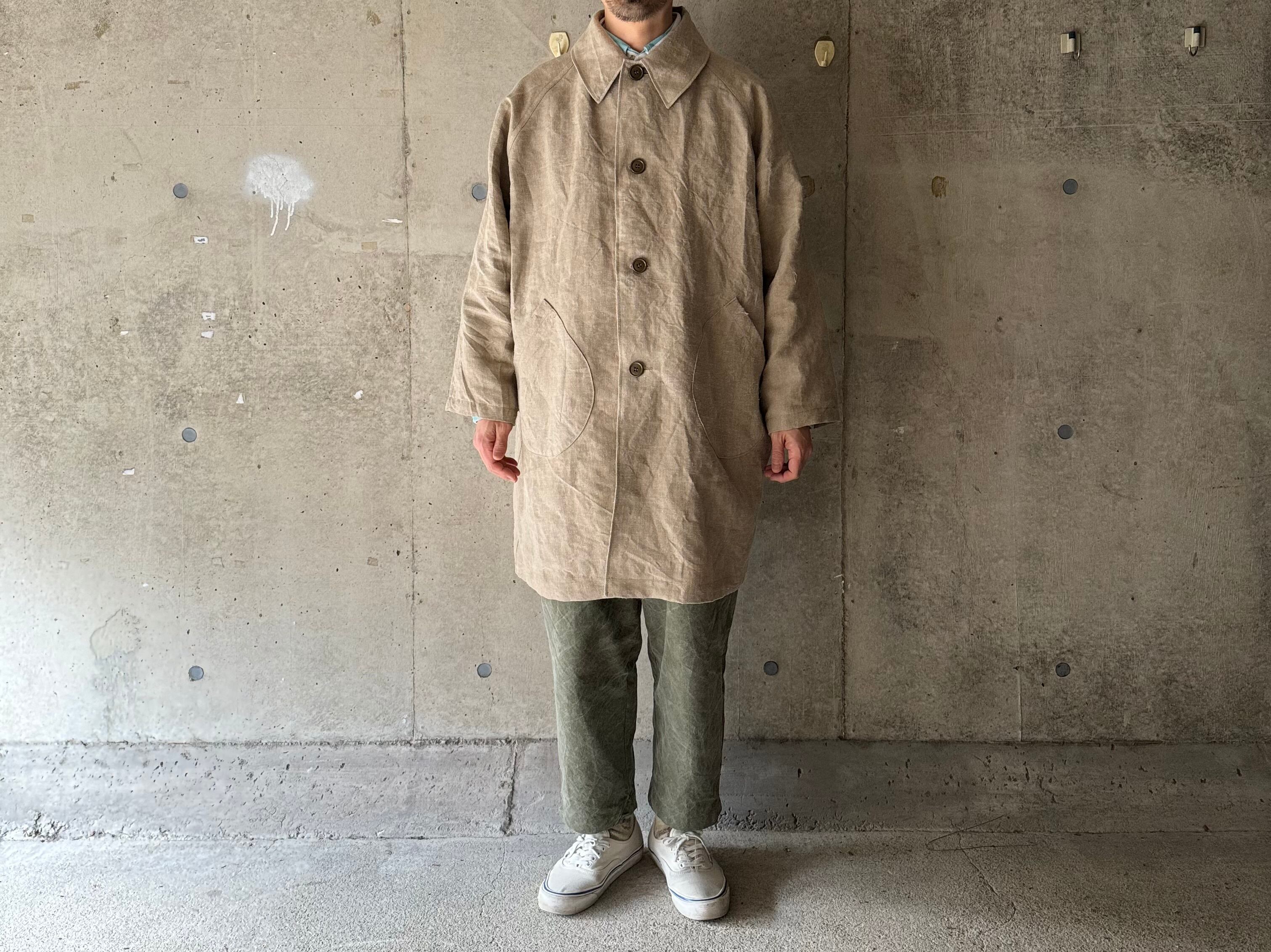 ヴィンテージのリネン生地でオーバーサイズで着用する、一枚袖のコートを作りました。ハリのある厚めのリネン素材で、独特な生地感があるスプリングコートです。