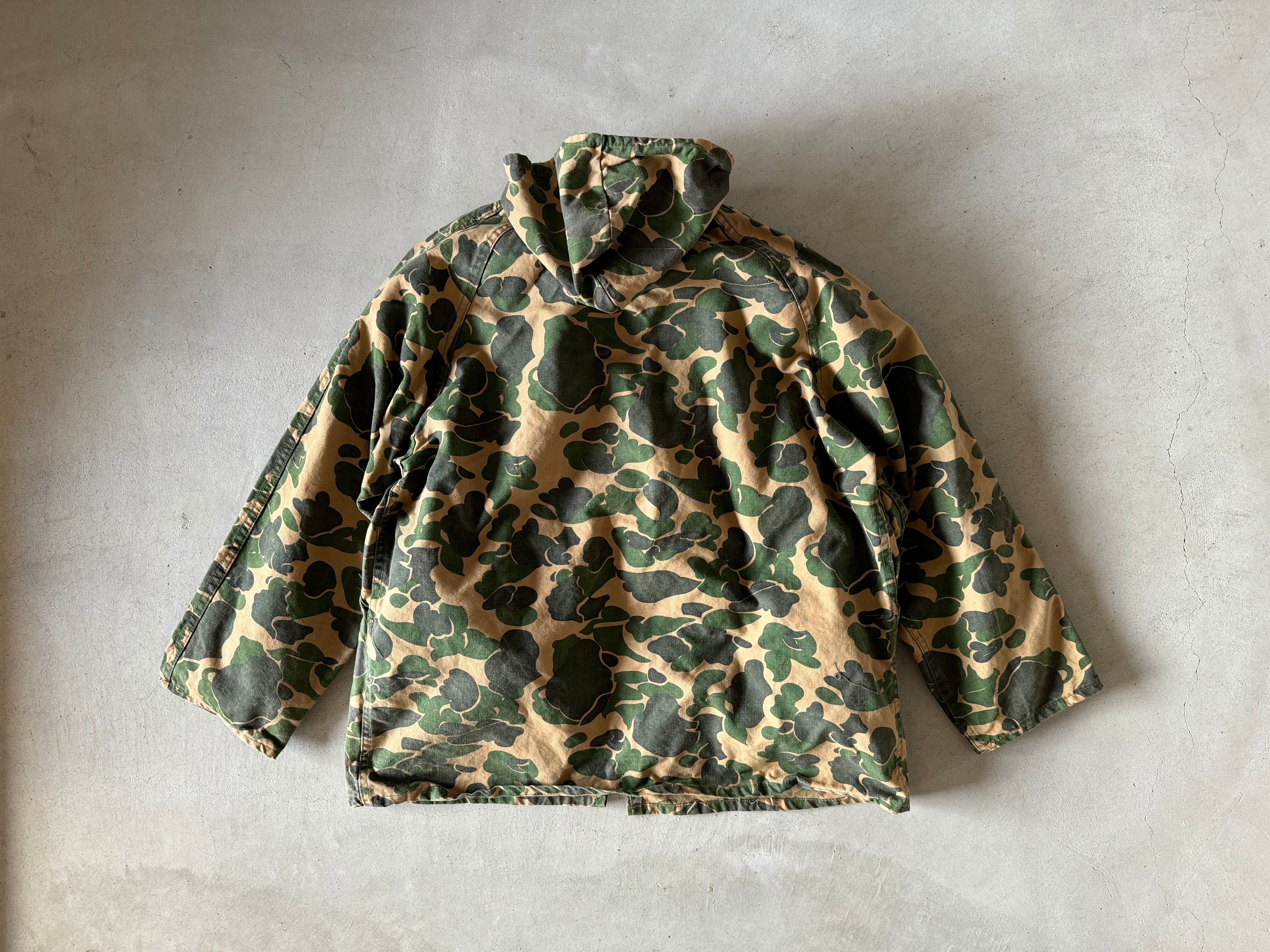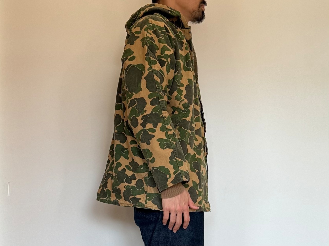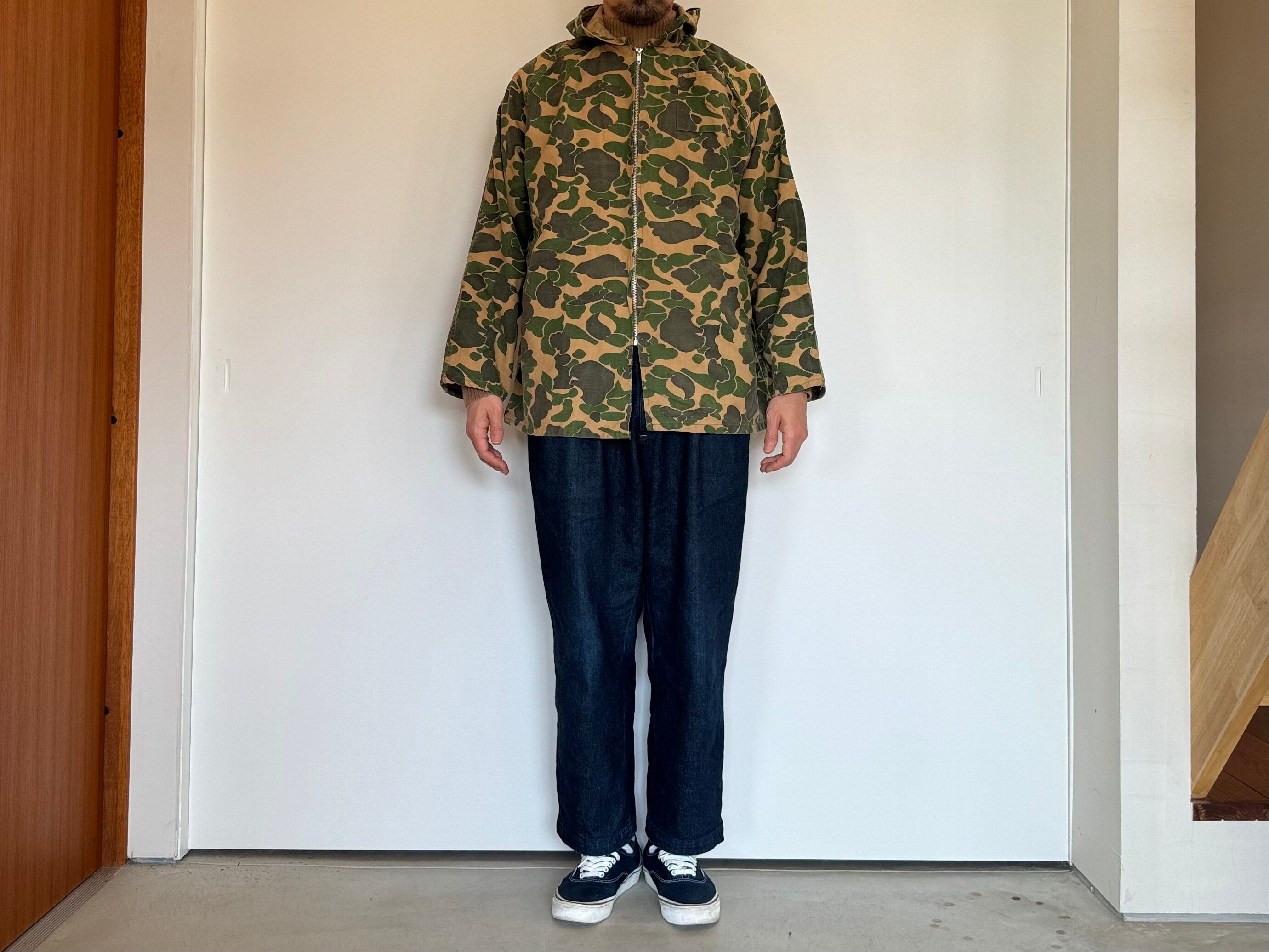 ハンティングジャケットなどはよく見かけますが、こちらのパーカージャケットは珍しいかと思います。着方としてはオーバーコートで腰のポケットはスルーポケット仕様となっております。6枚目の画像をご確認ください。