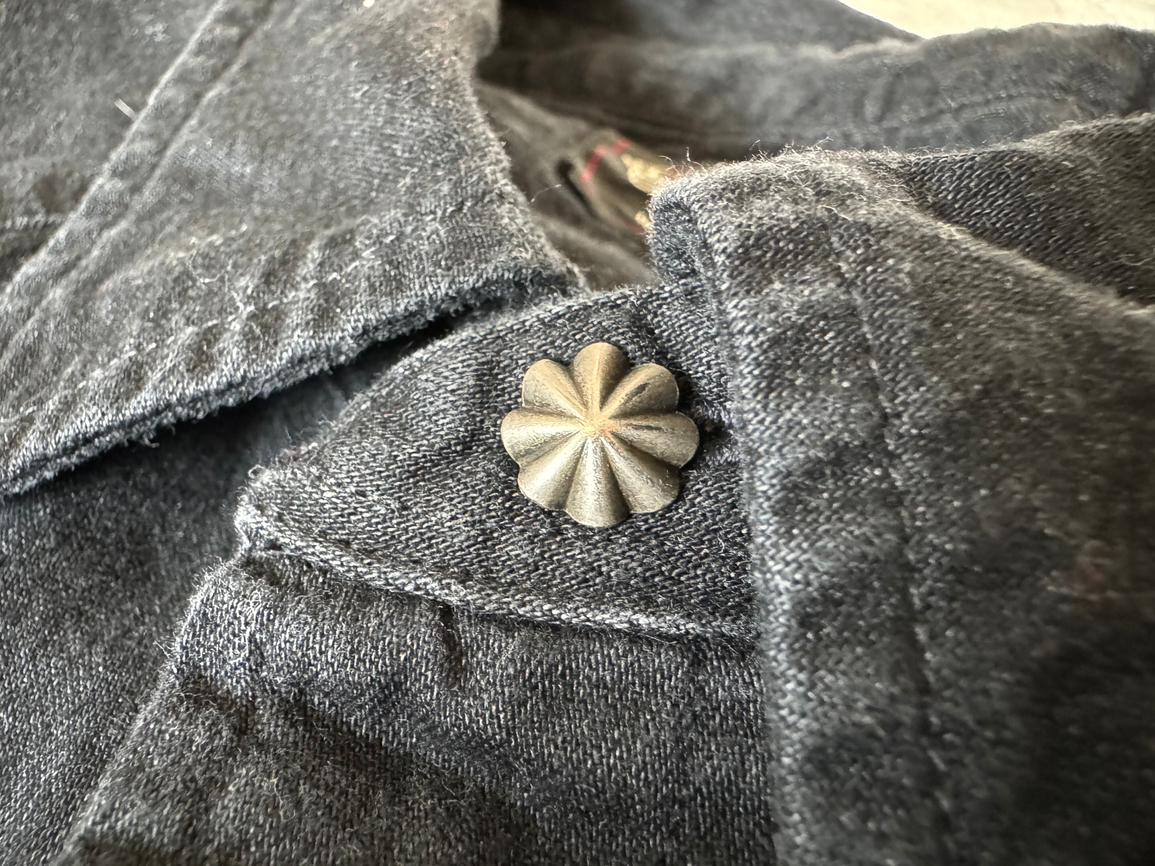 トップがコンチョボタンで、他は菱形のスナップボタン。黒に染めたシャンブレー?のような生地です。