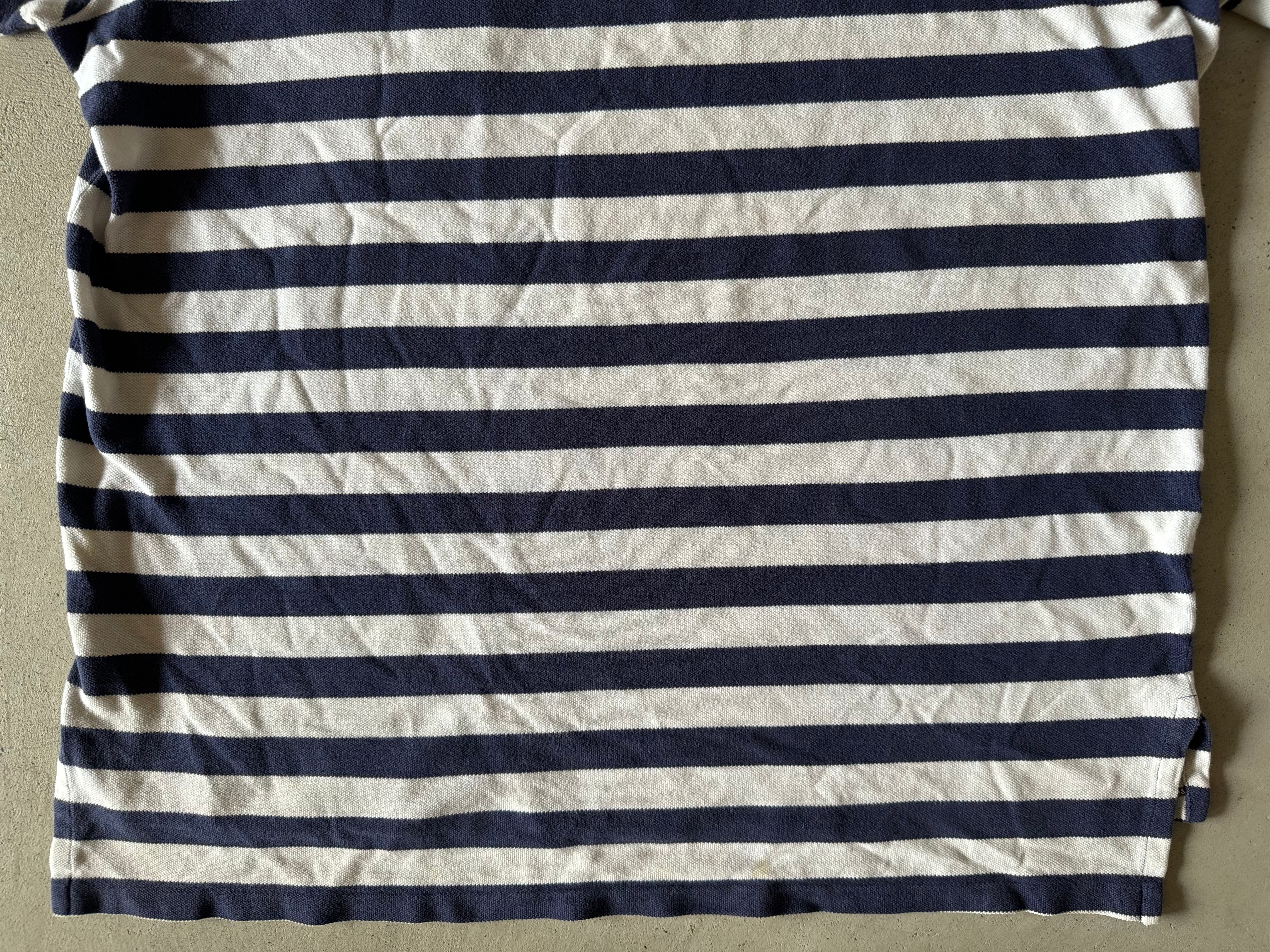 マリンな雰囲気漂う、ネイビー×ホワイトのボーダーポロシャツ。一番合わせやすそうな、ど定番のボーダー柄ですが、アメリカ製の物となると、なかなか出てこない一着です。ポニーはスソに縫われています。