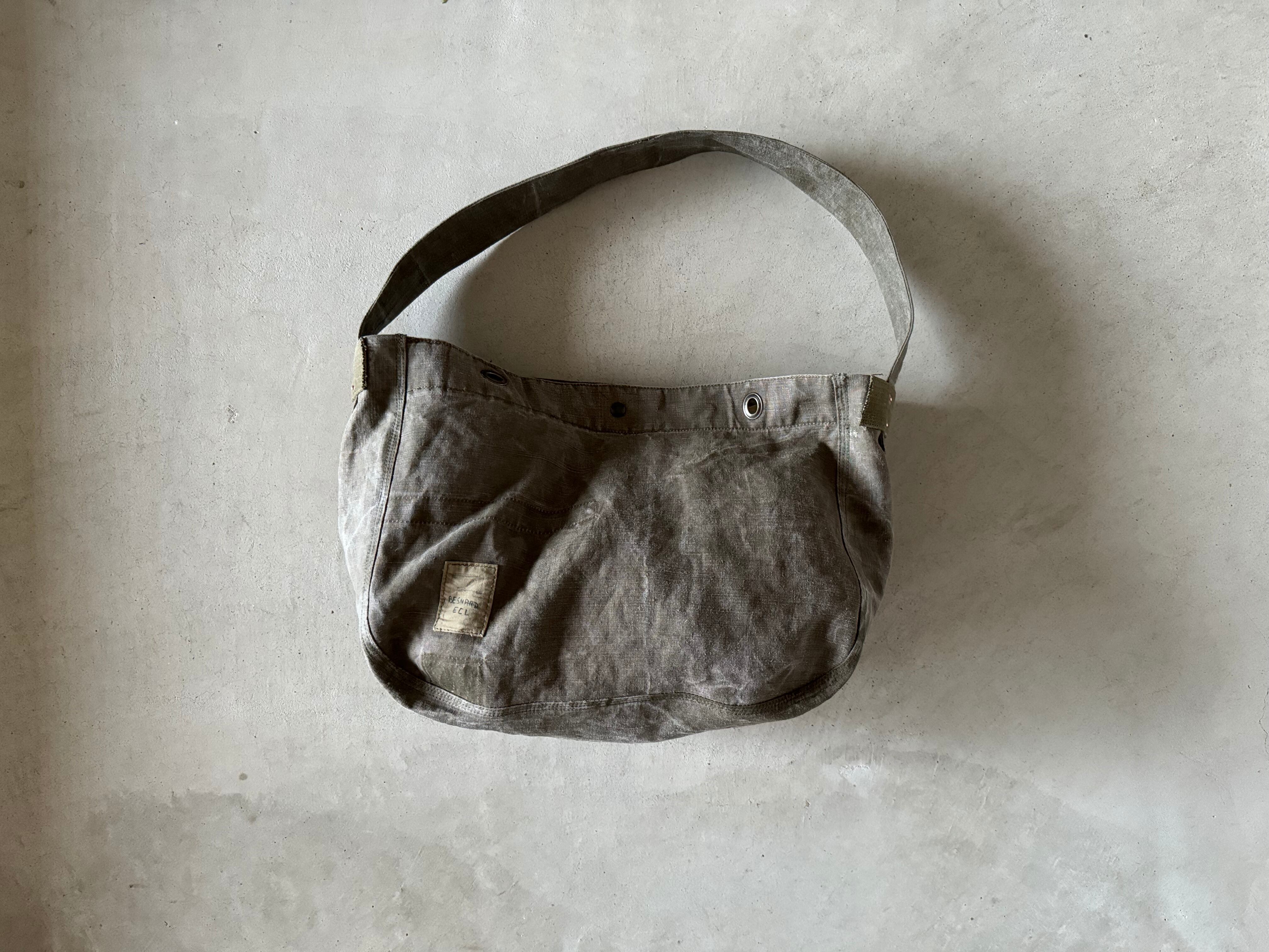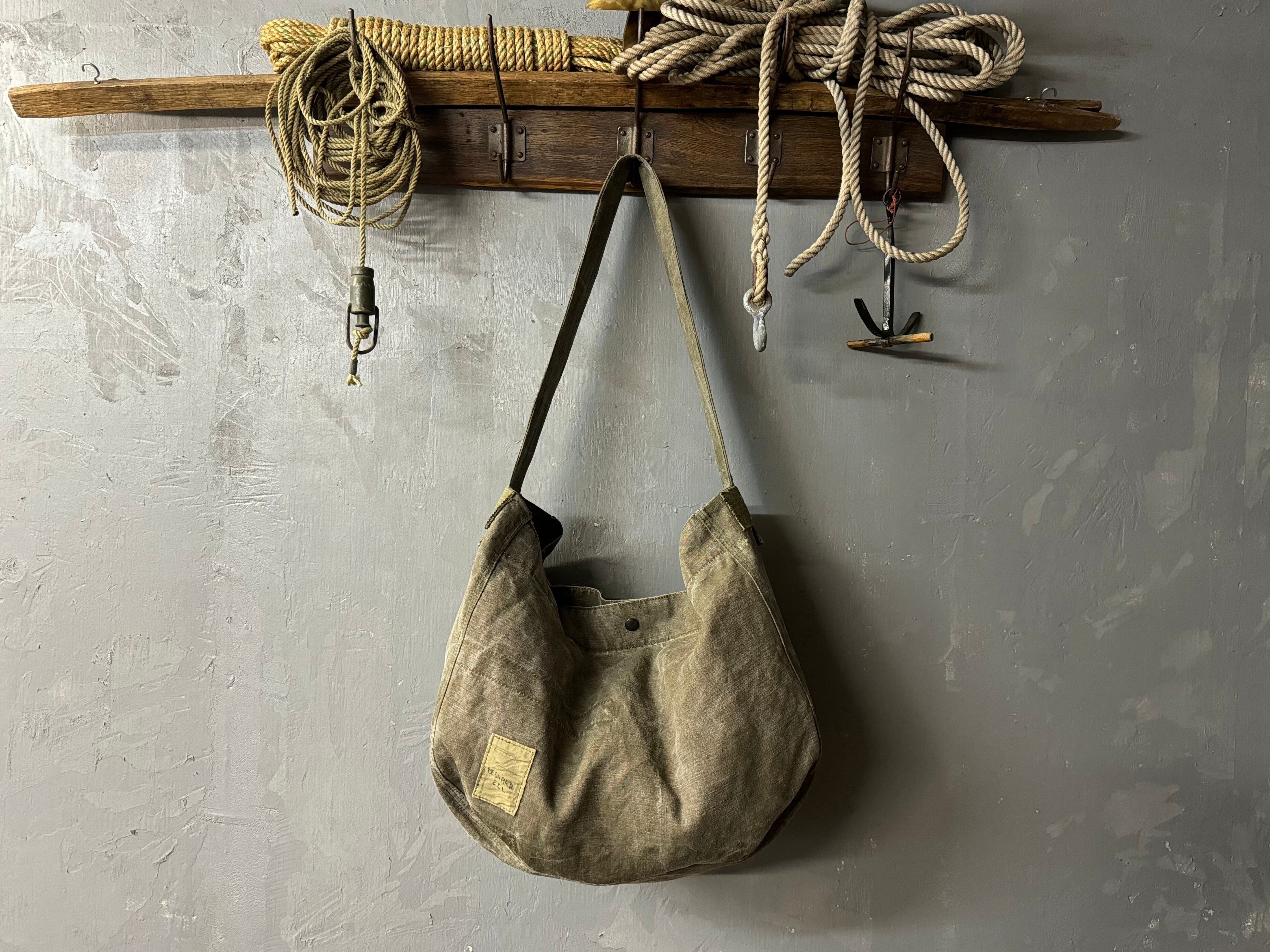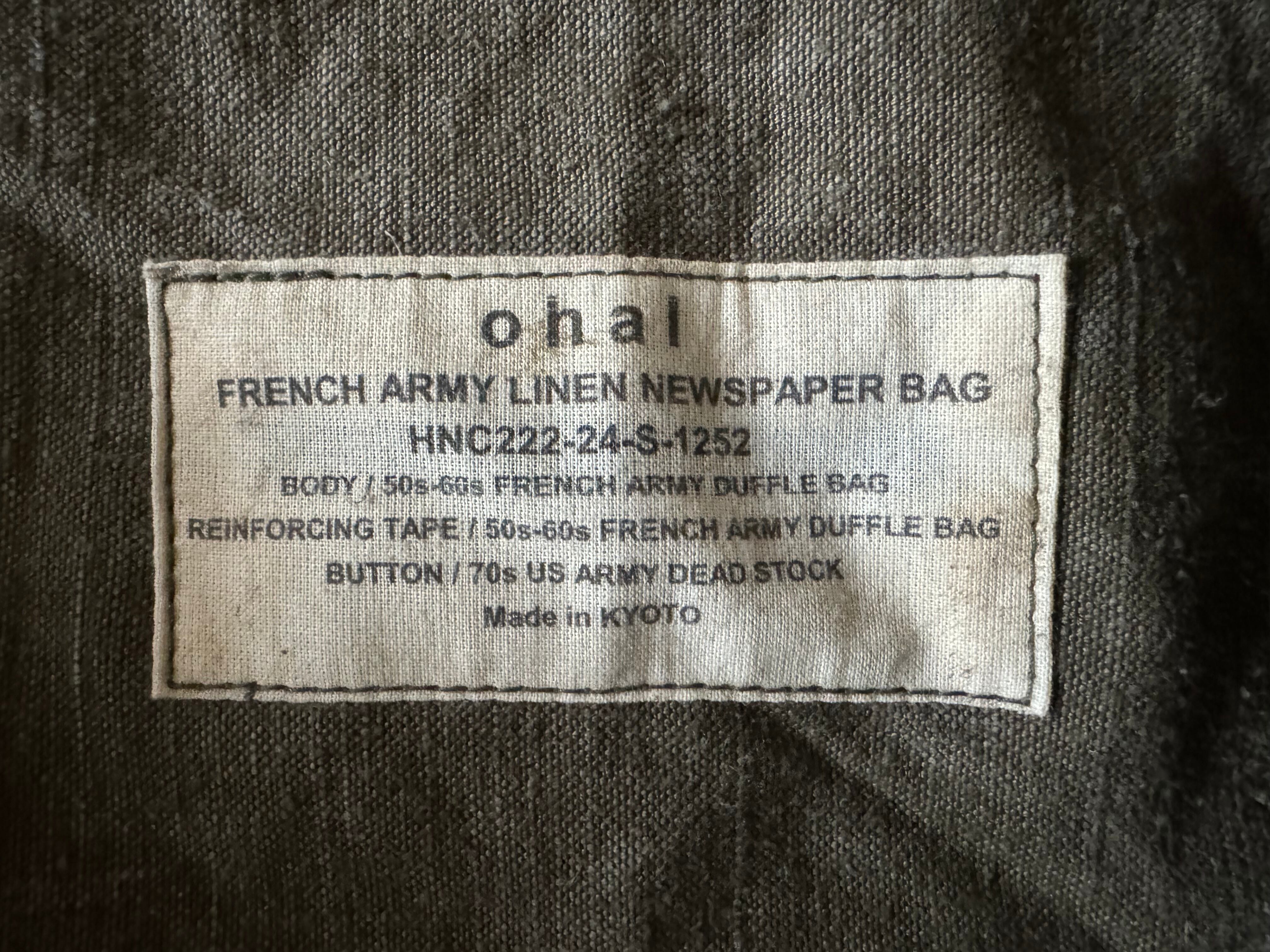 ボディーの生地は50〜60年代頃、フランス軍のダッフルバッグ。リネン素材で、独特のクタッとした素材感、そして開口部についている楕円形のハトメなど、ヴィンテージを感じさせるディテールが盛り込まれています。