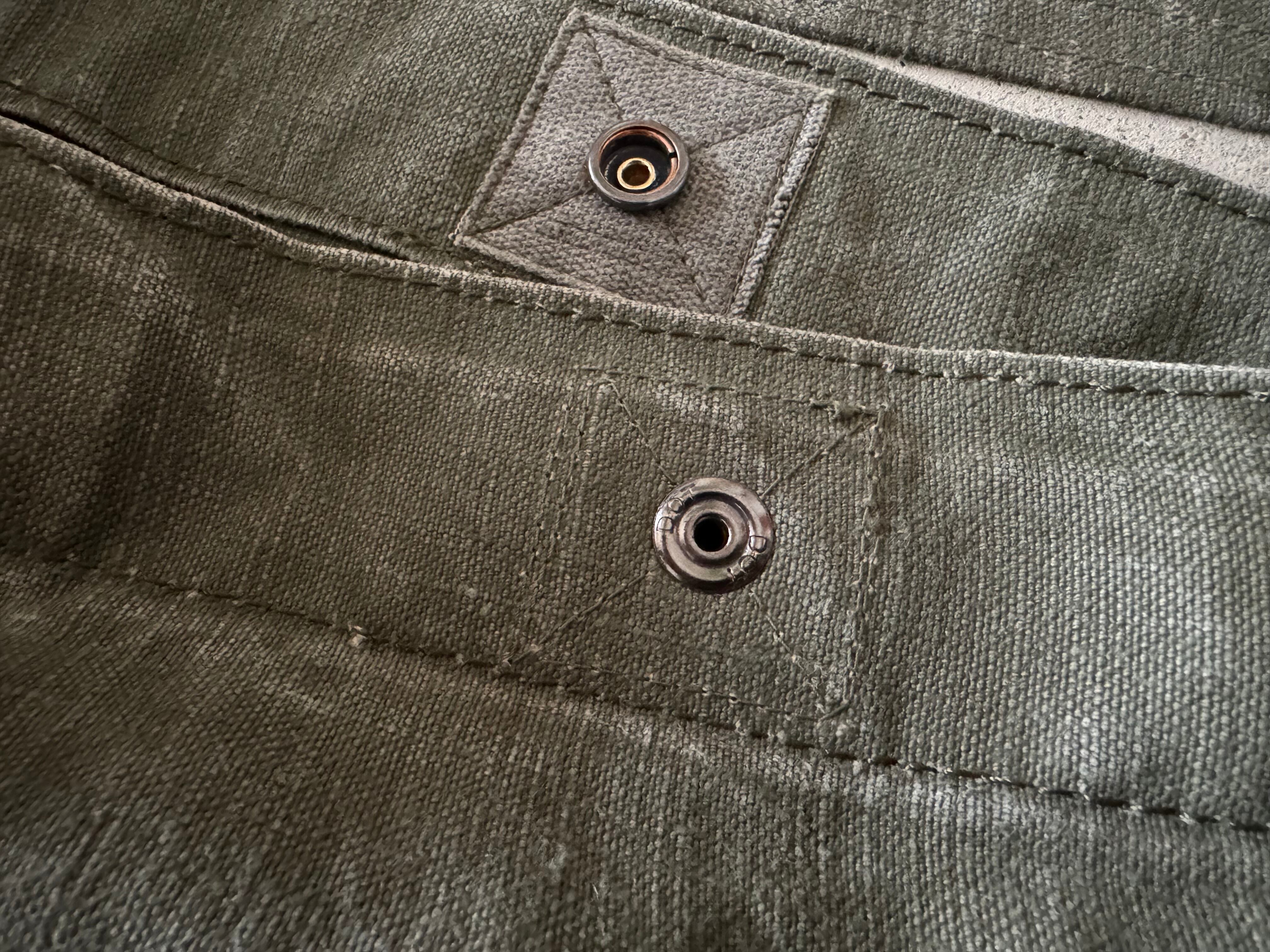 開口部についているスナップボタンは、70年代、スコービル社が米軍に納入したデッドストックのドットボタンを使用してます。『DOT』の刻印も玄人にはグッとくるところかと。。。