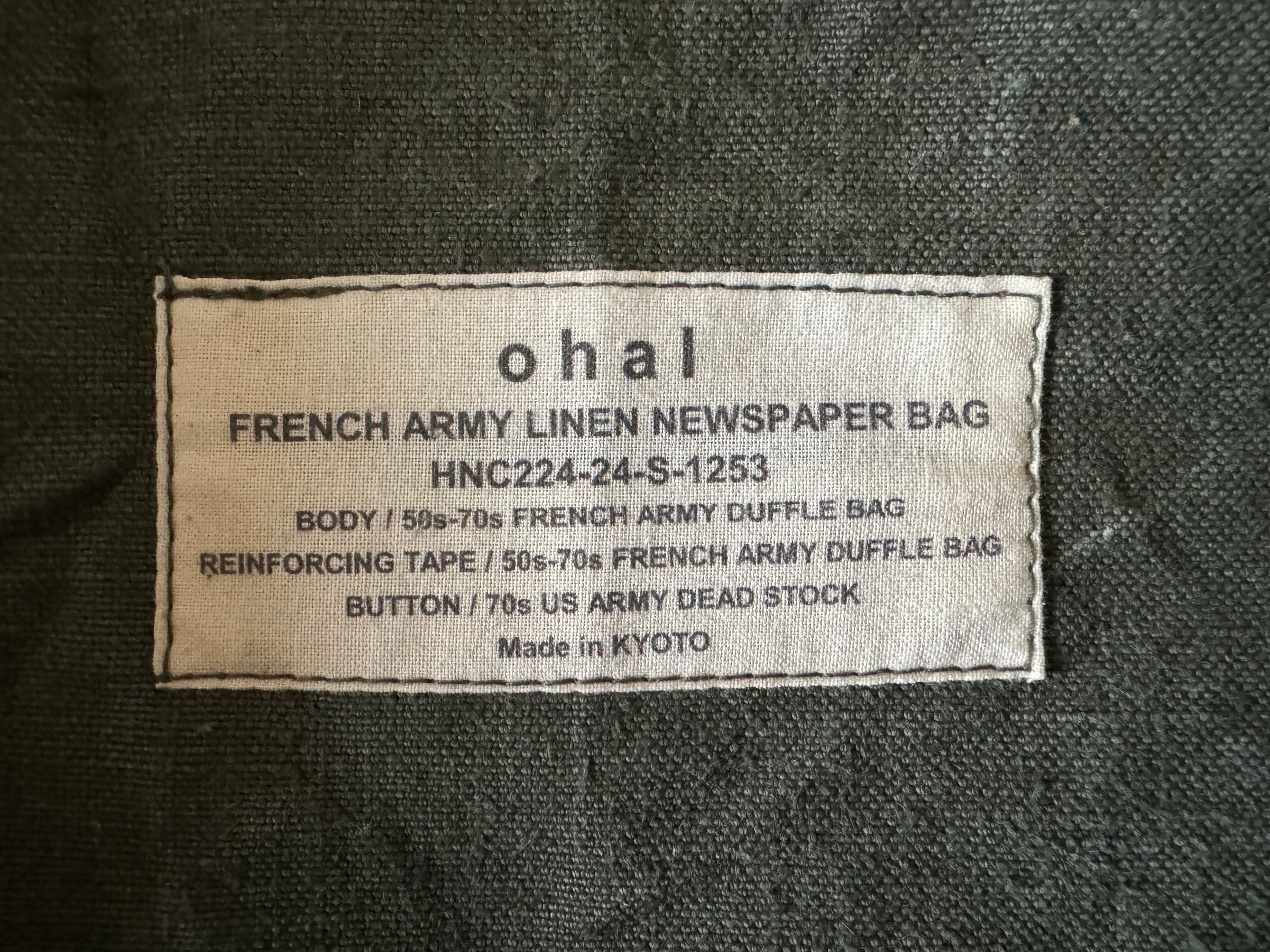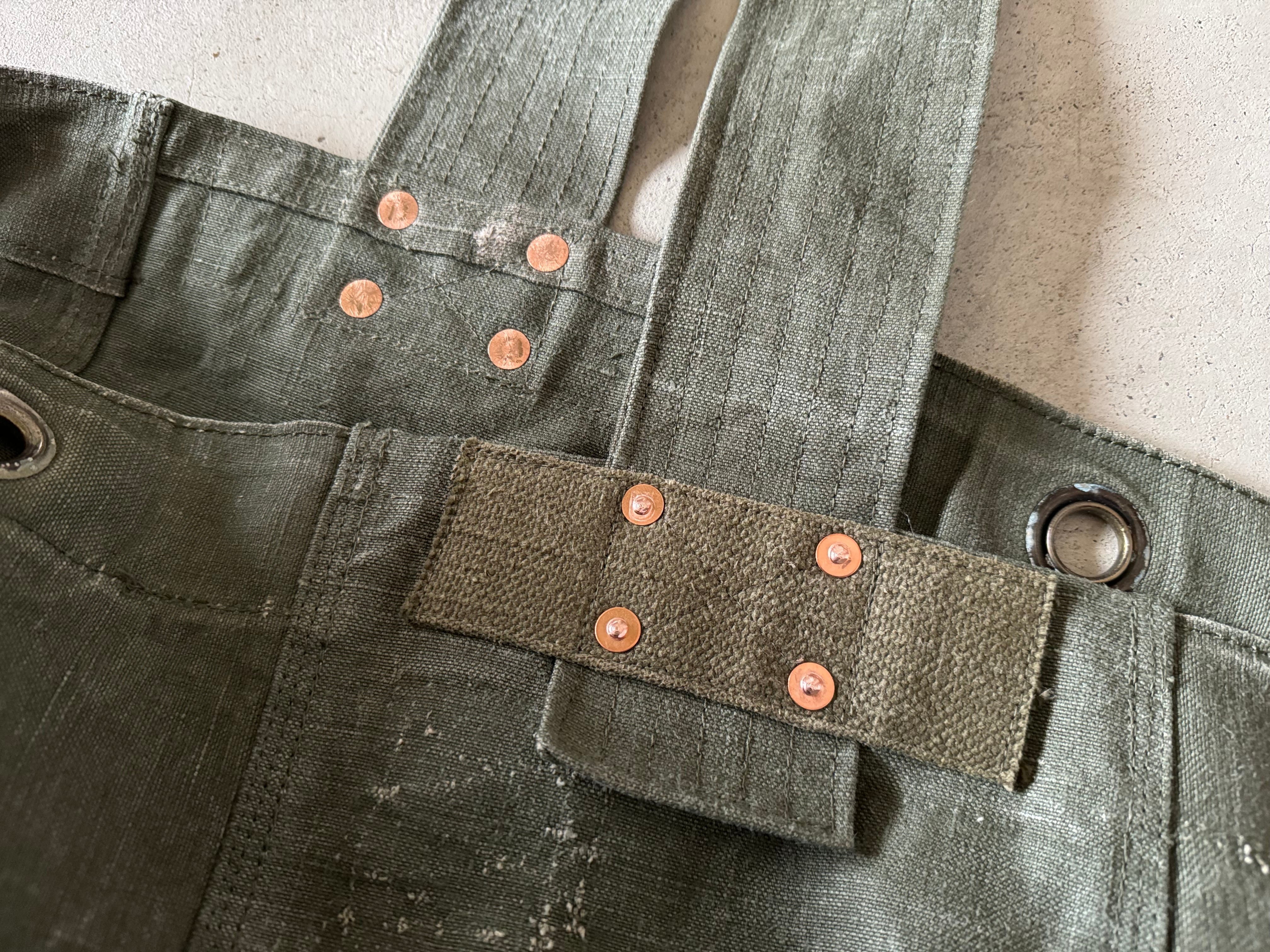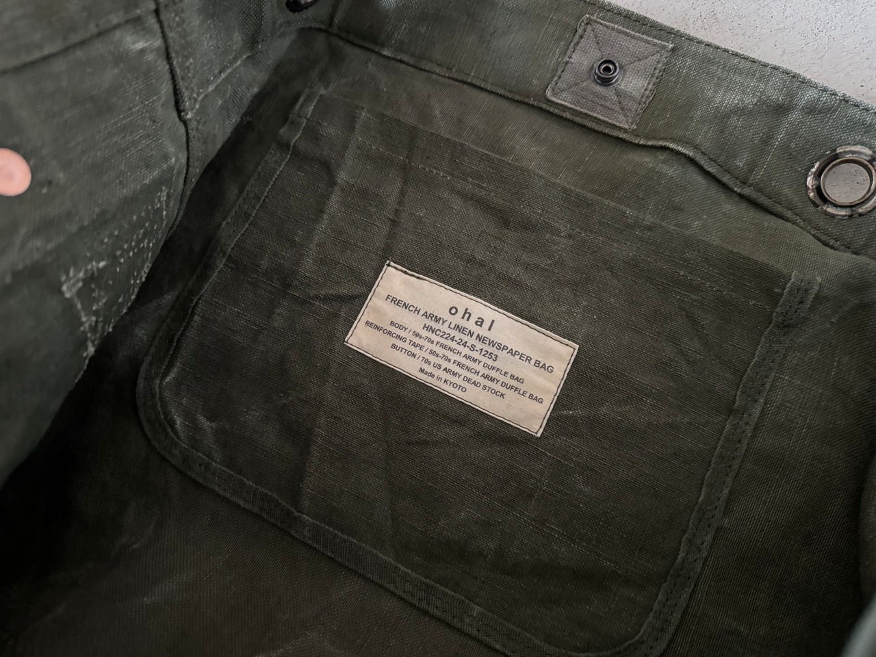 ボディーの生地は60〜70年代頃、フランス軍のダッフルバッグ。リネン素材で、独特のクタッとした素材感、そして開口部についているハトメなど、ヴィンテージを感じさせるディテールが盛り込まれています。