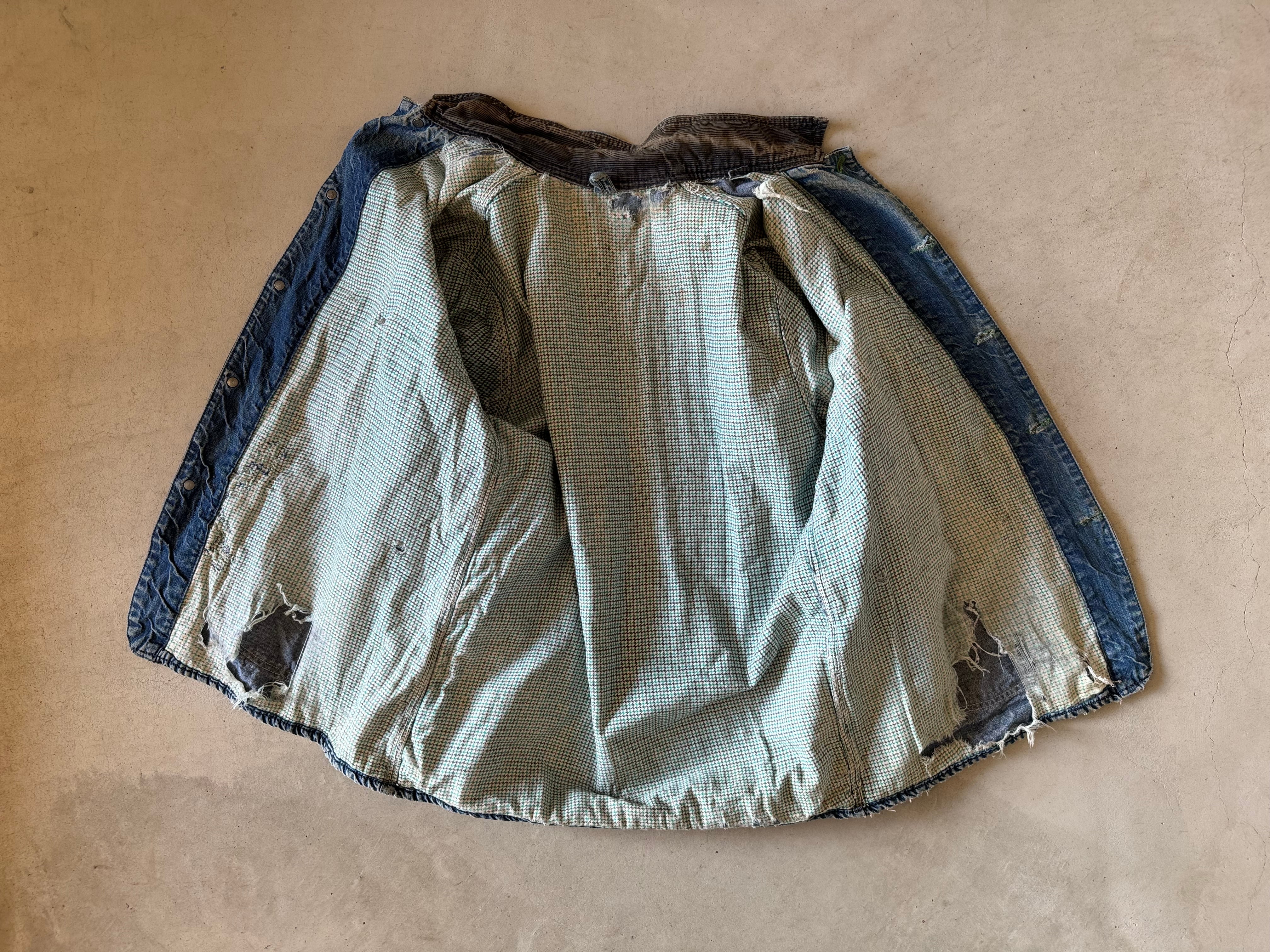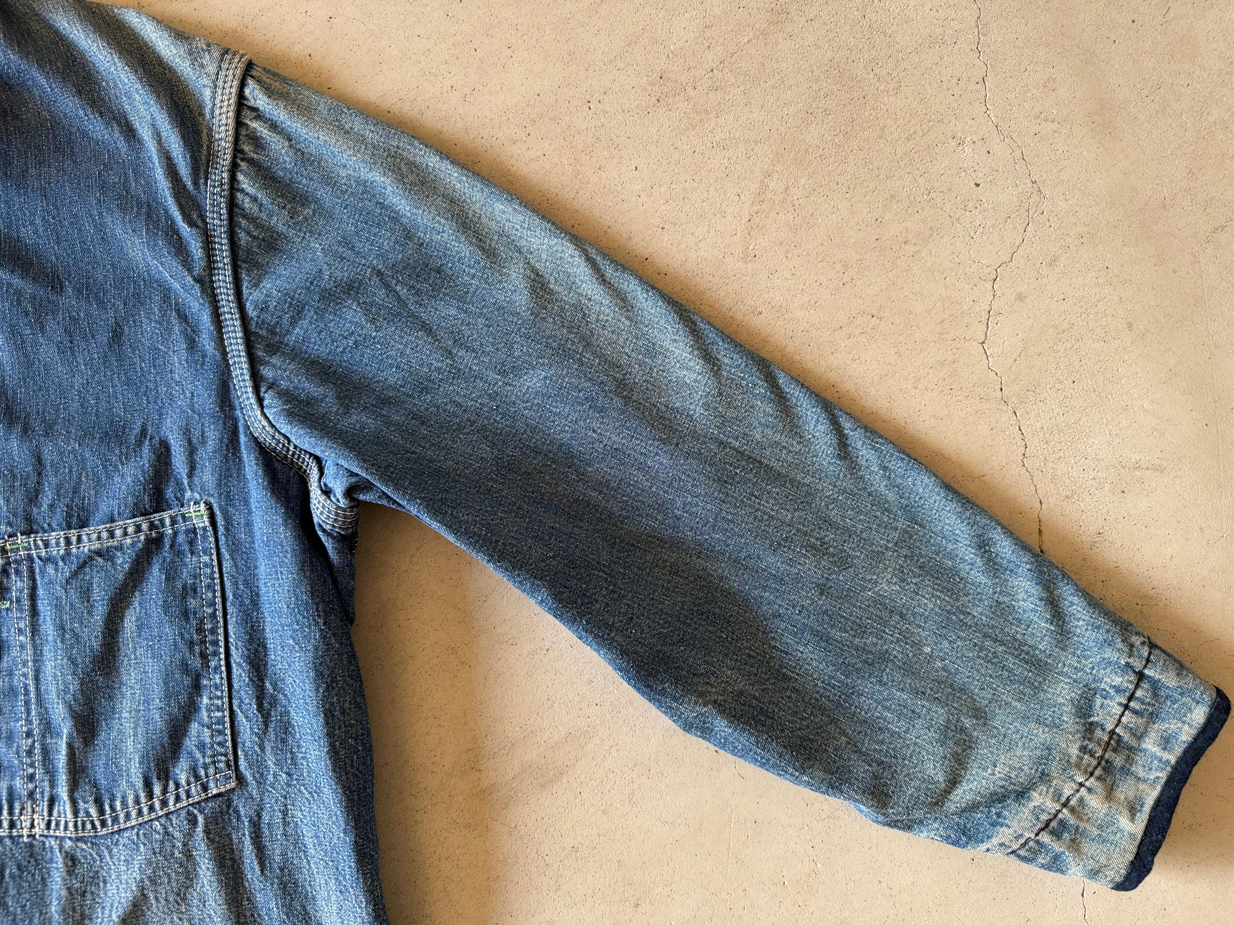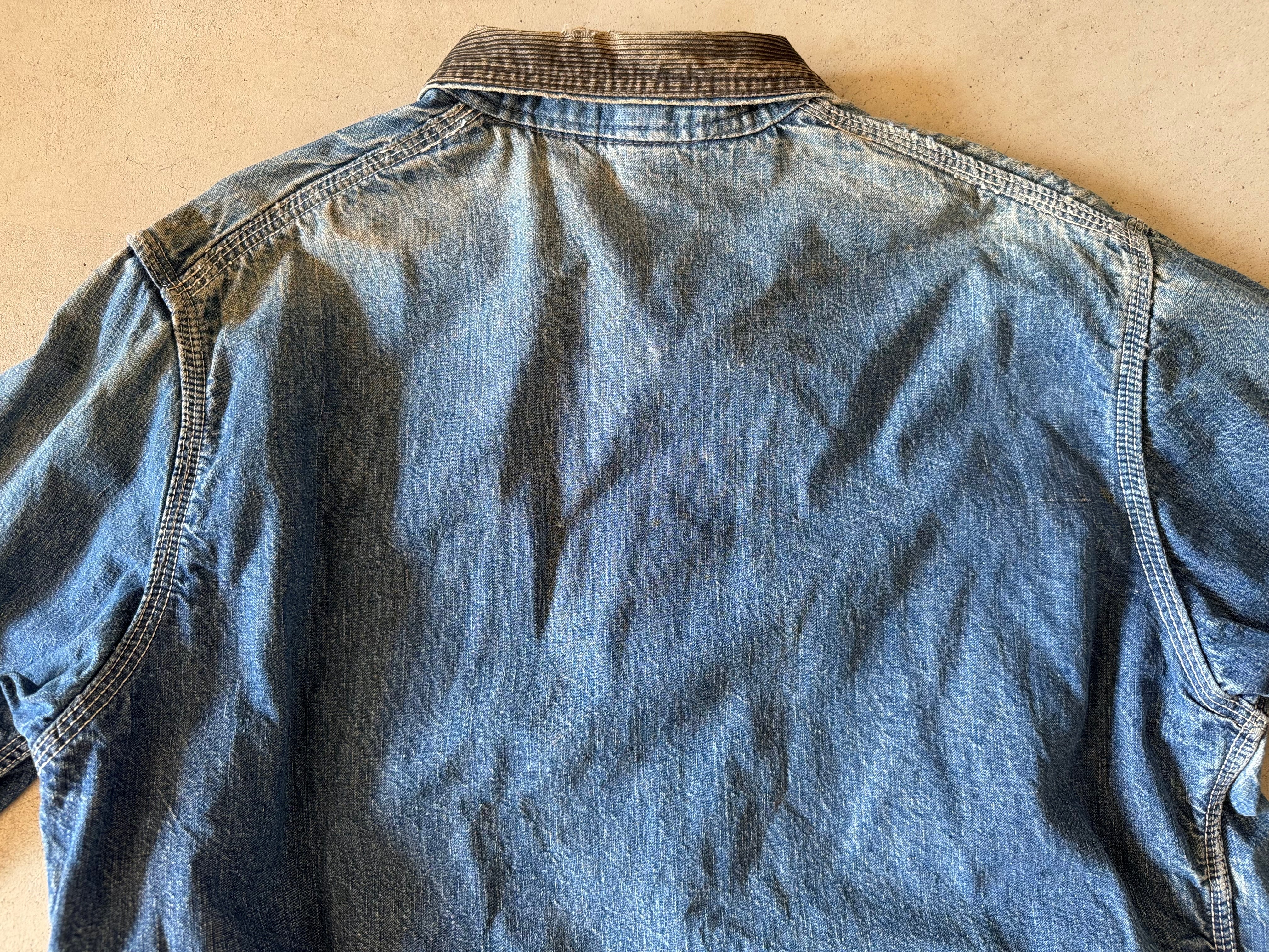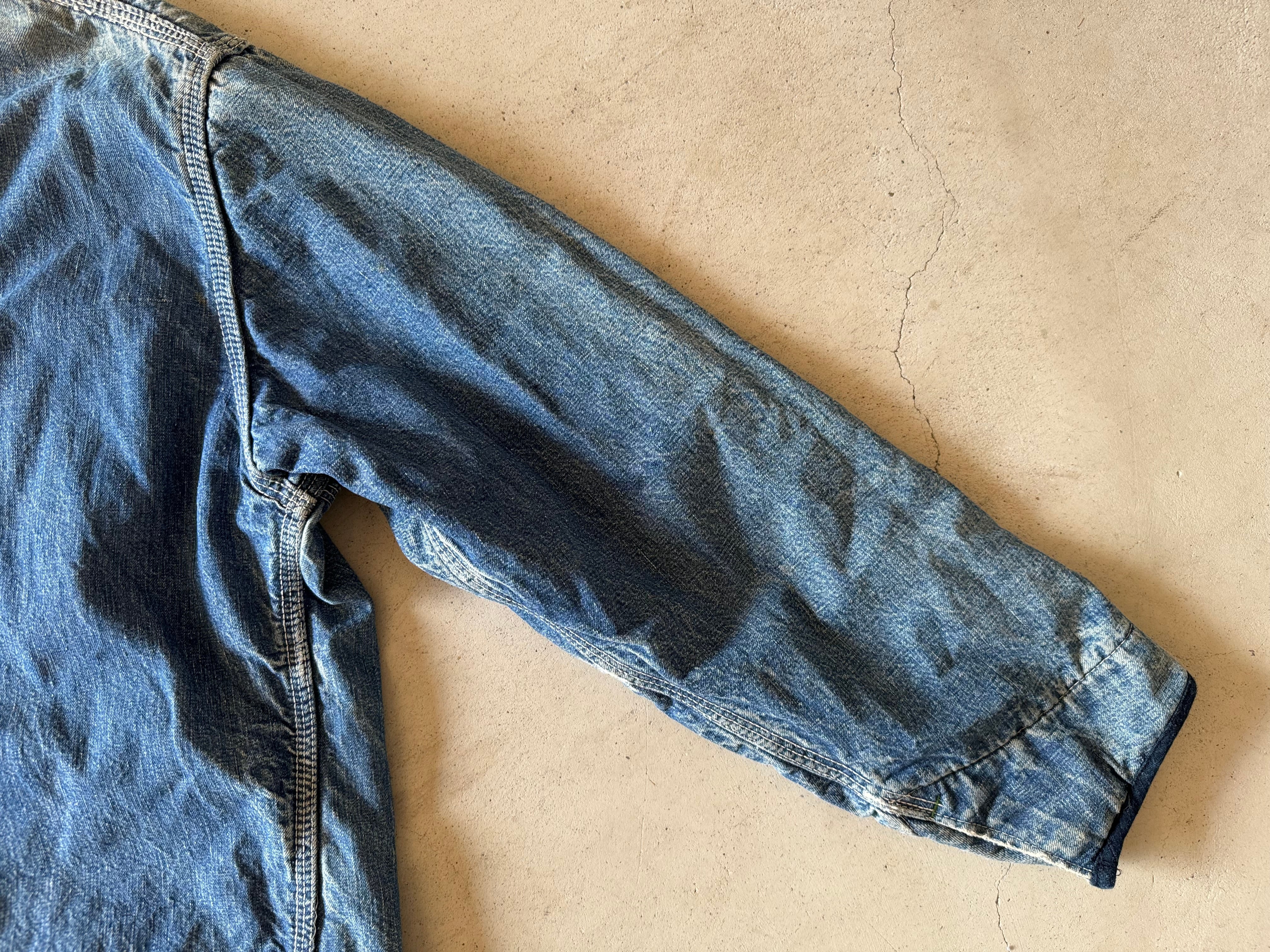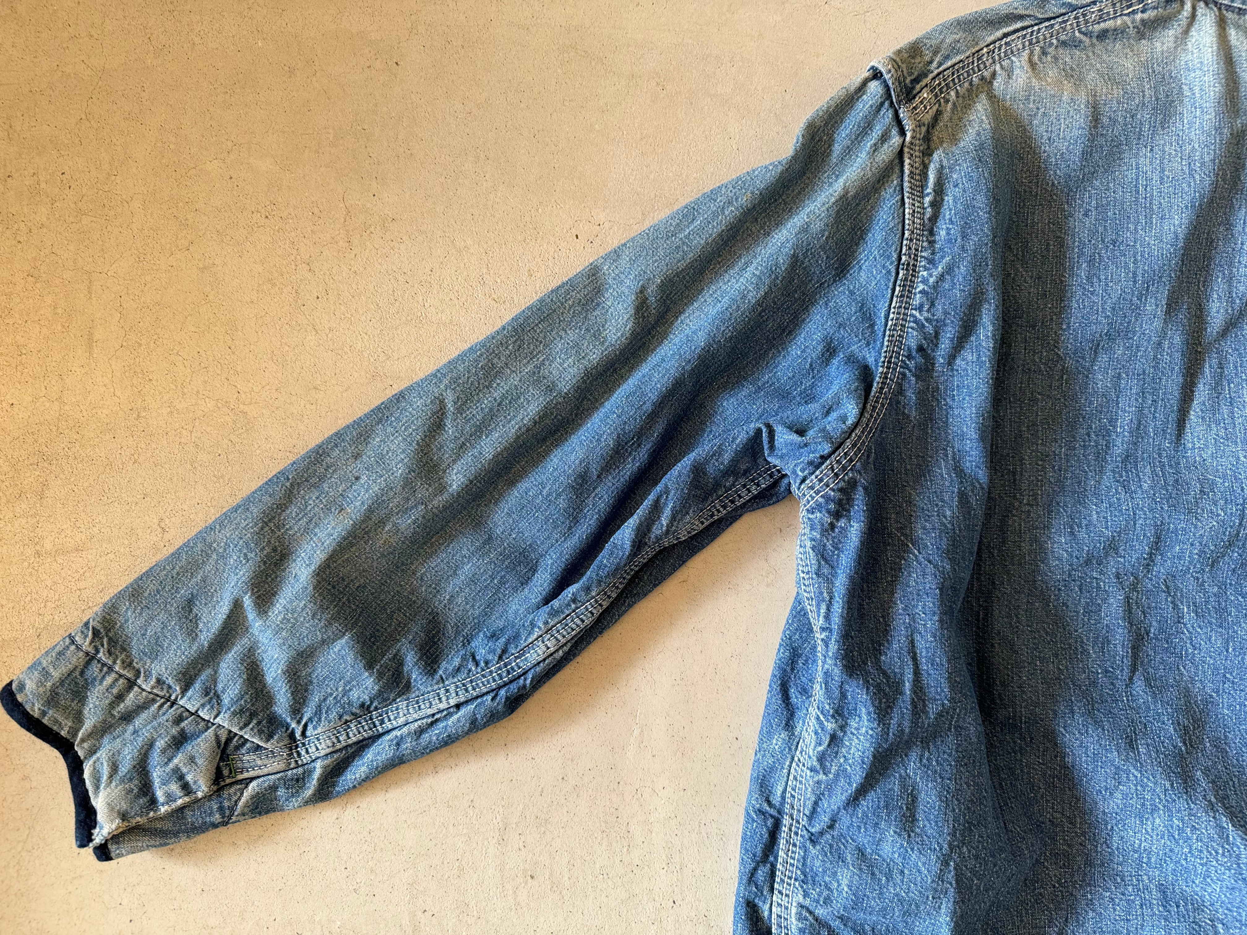 これぞ古着の醍醐味である、良い色落ちをしたデニムのカバーオール。コーデュロイで切り替えられた襟もダメージはありますが、それも良いアジが出ています。まさに新品では出せない逸品です。