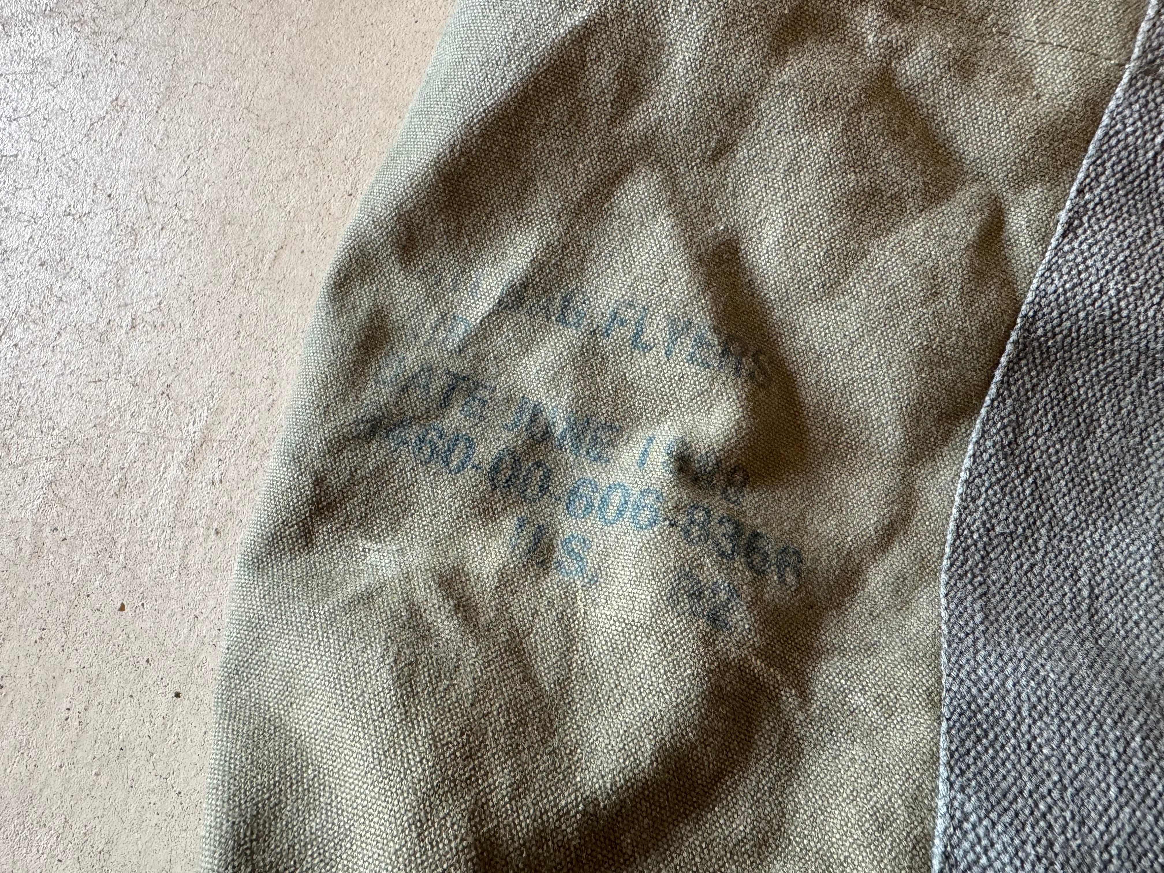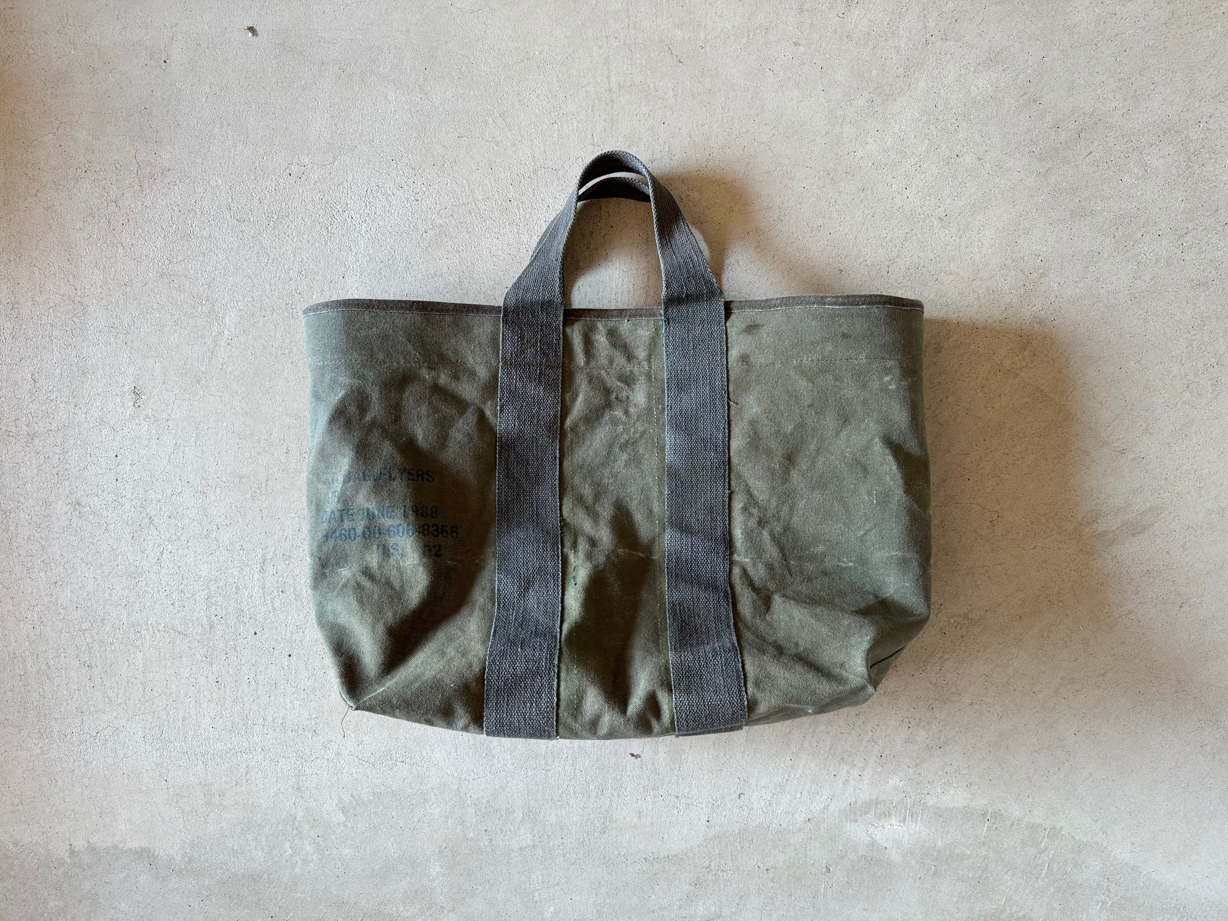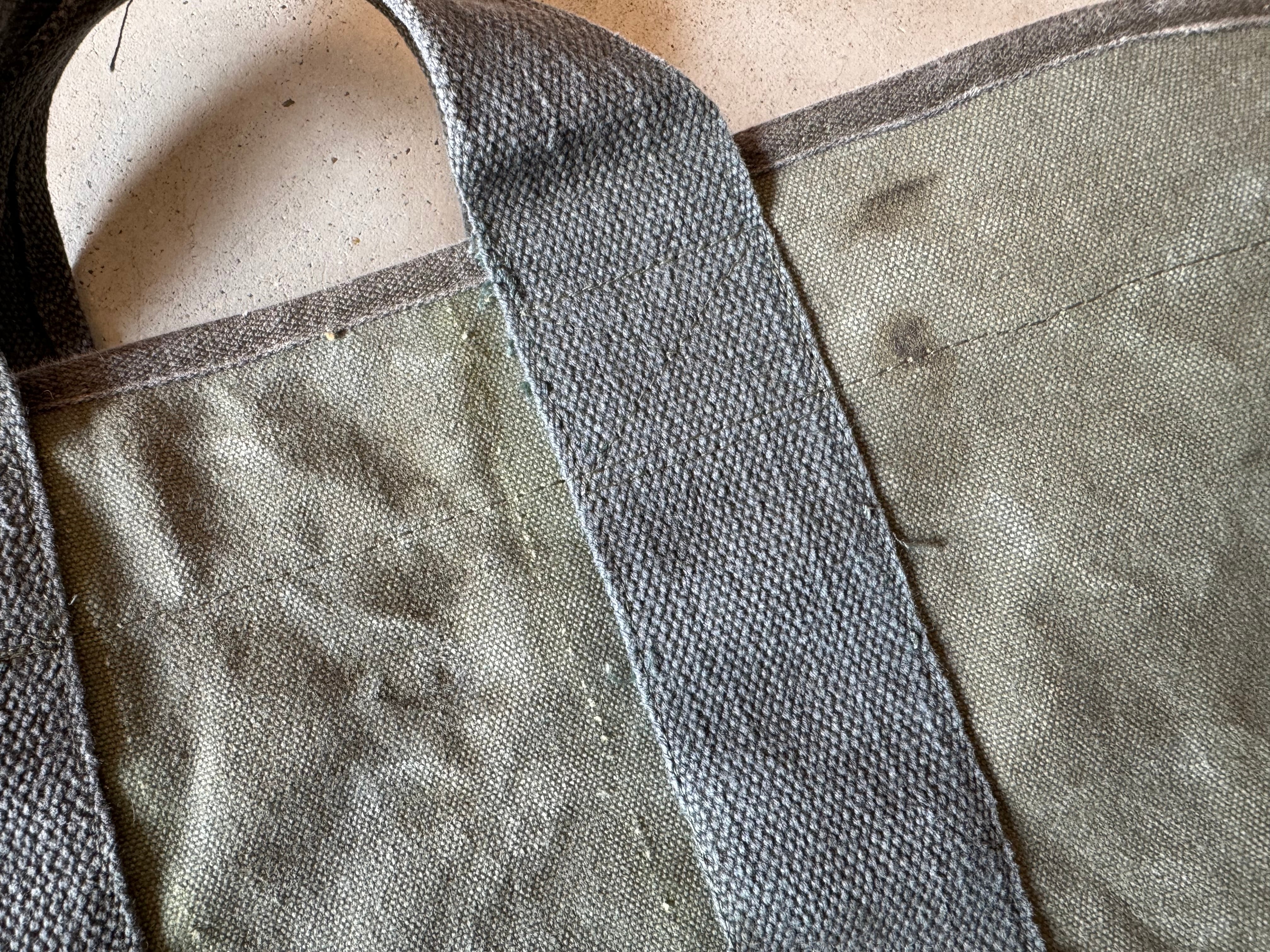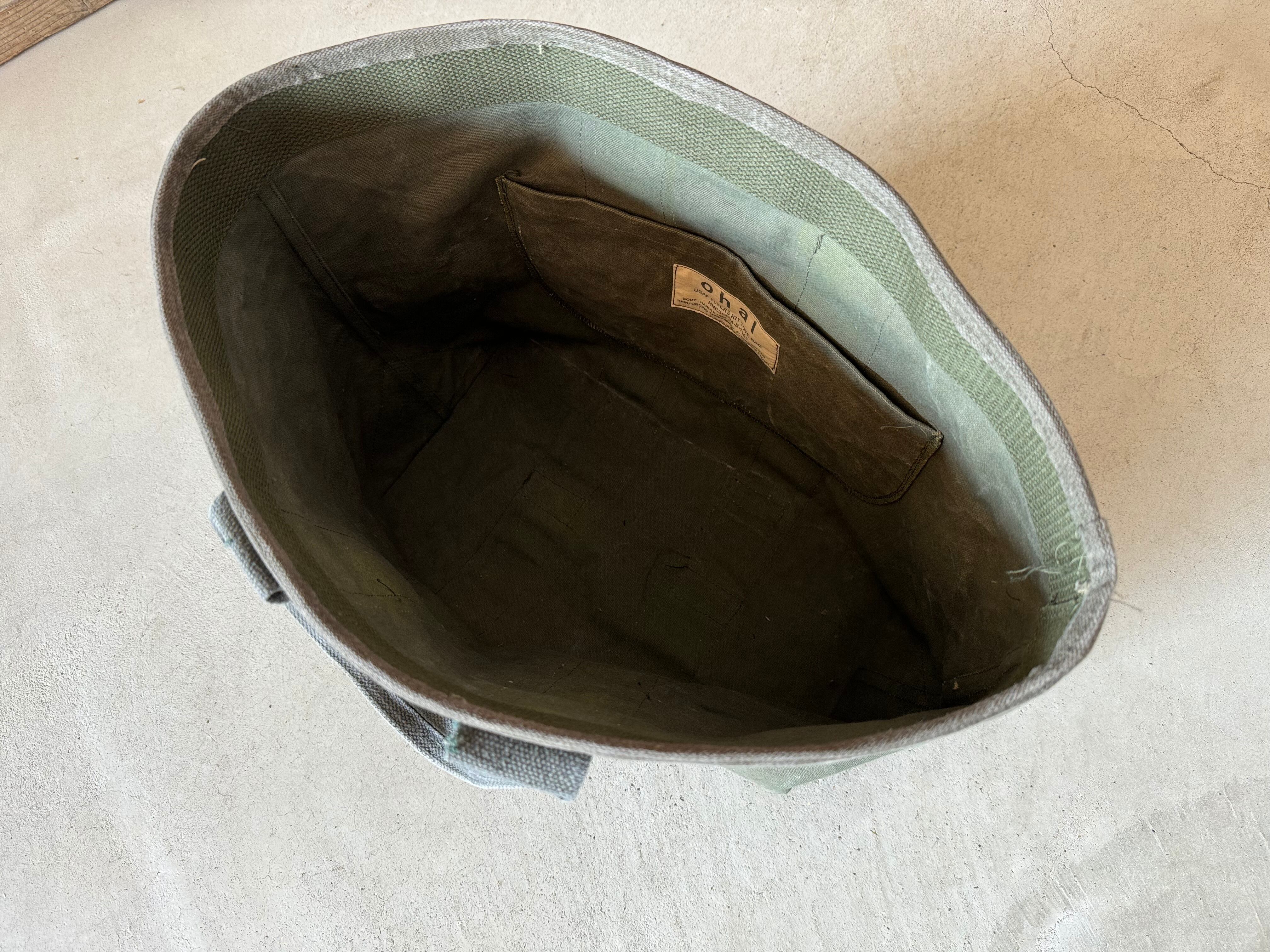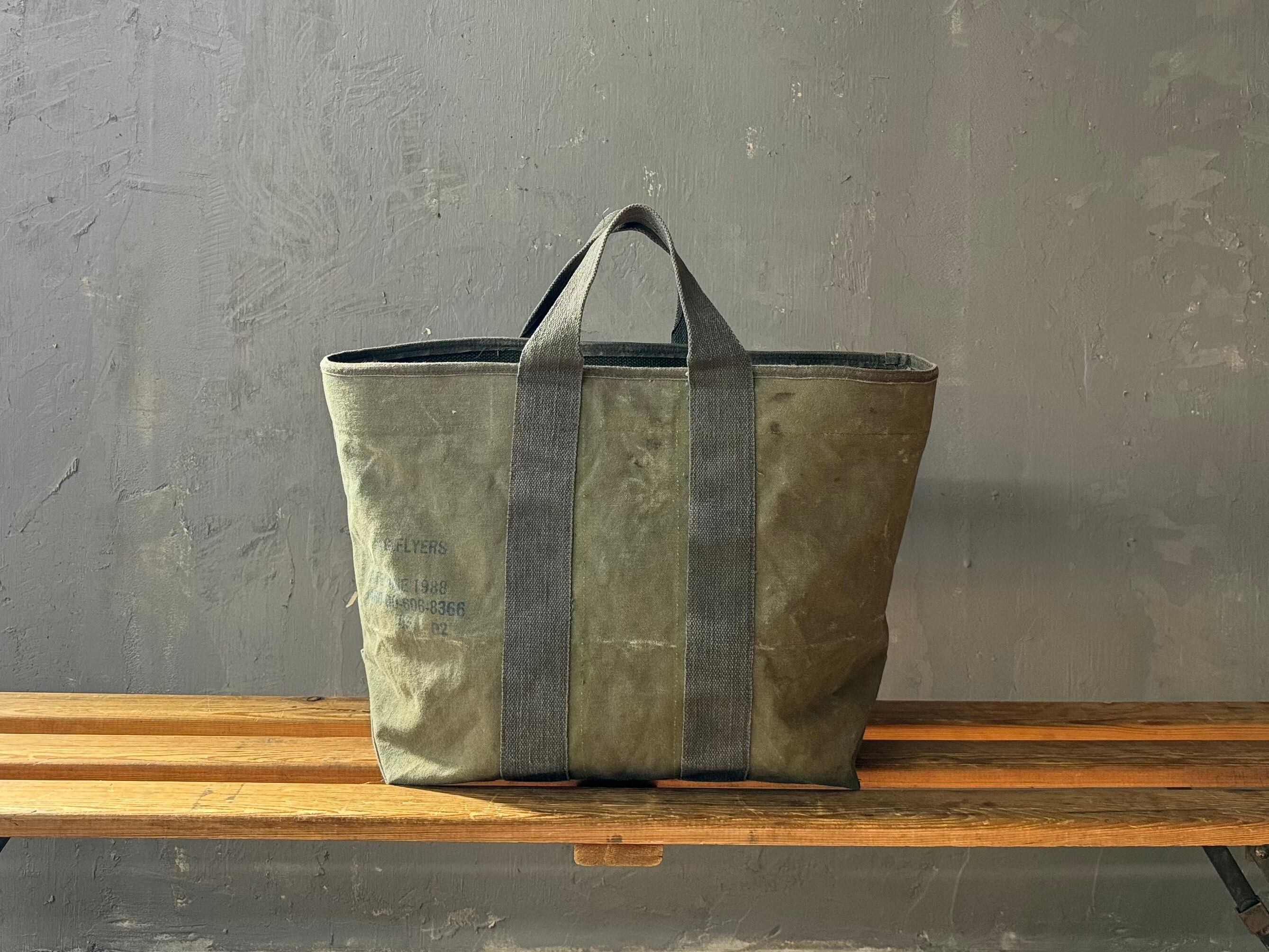 80年代の米軍、フライヤーズキットバッグを解体し、トートバッグを作成しました。開口部のパイピングテープもこのバッグに使われていた物を外し、付け直しております。開口部内側の補強用のキャンバステープは、50年代の同じくアメリカ軍の物です。