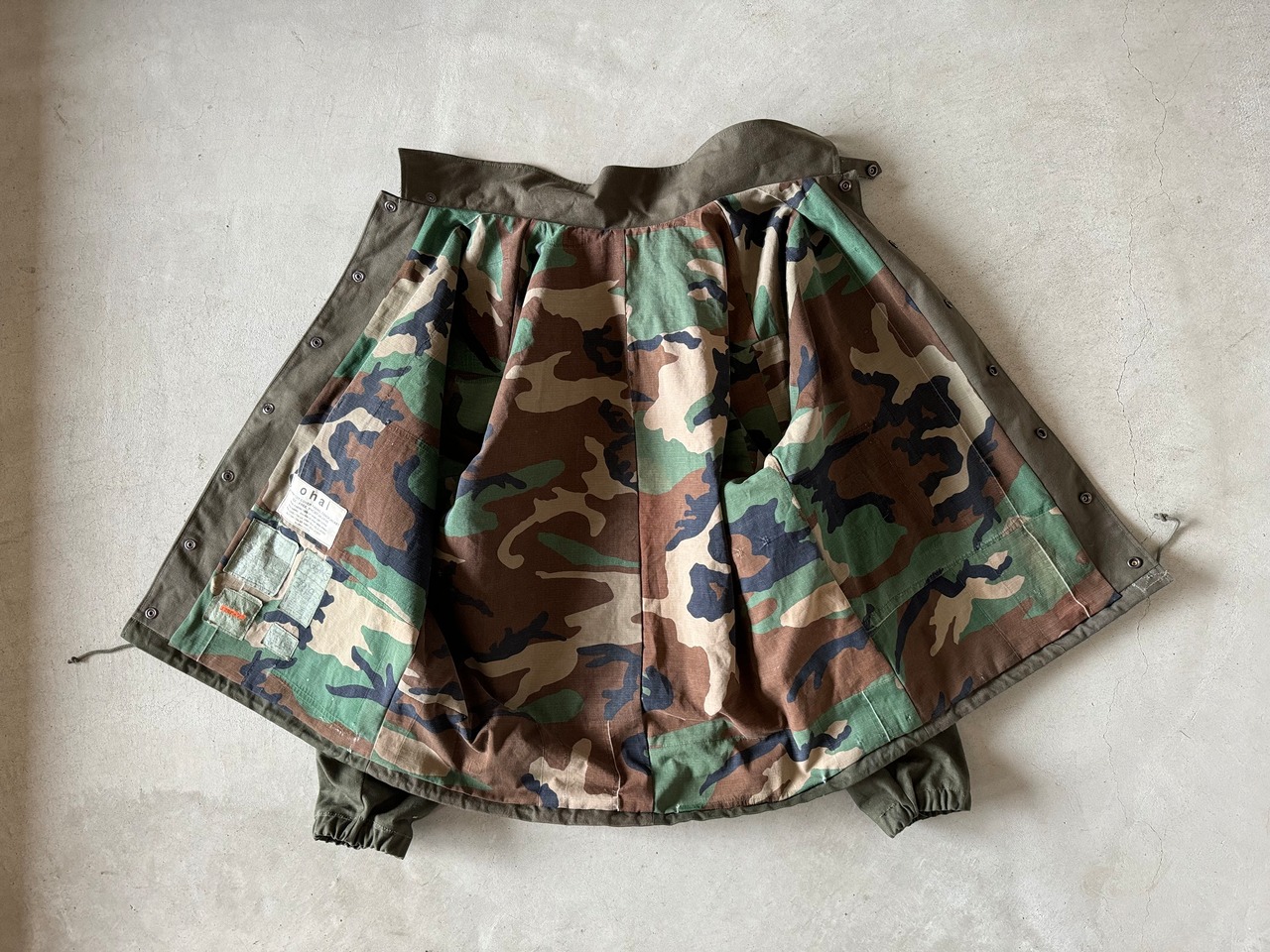 裏地は80〜90年代のアメリカ軍のBDU JACKETを解体してつなぎ合わせた生地を使用しています。BDUジャケットにつけられていたタグを前身頃の裏側につけております。