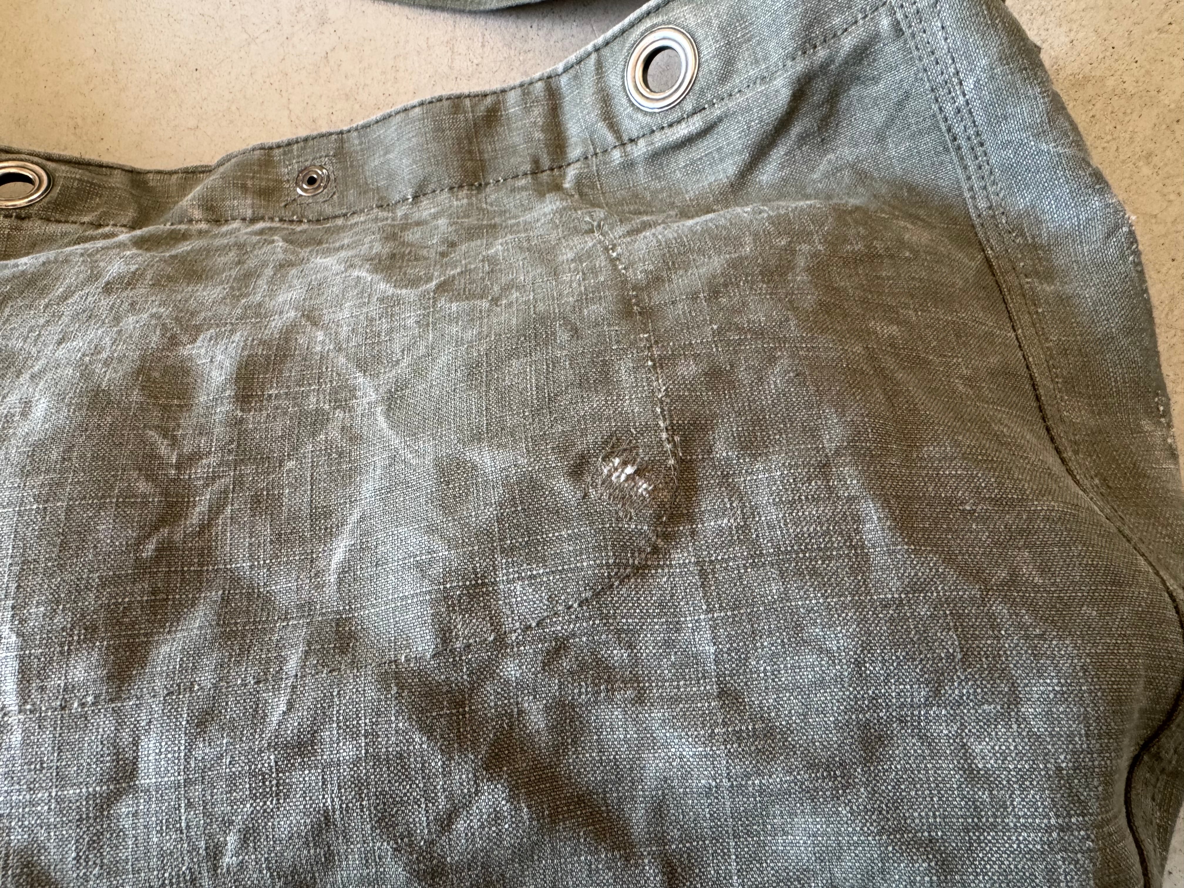 ボディーの生地は60〜70年代頃、フランス軍のダッフルバッグ。リネン素材で、独特のクタッとした素材感、そして開口部についているハトメなど、ヴィンテージを感じさせるディテールが盛り込まれています。内ポケットには微かにステンシルが残っています。