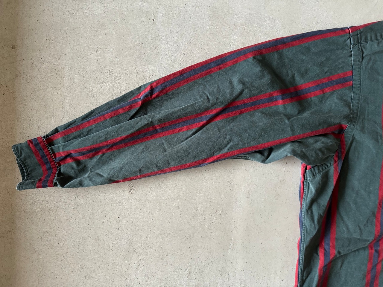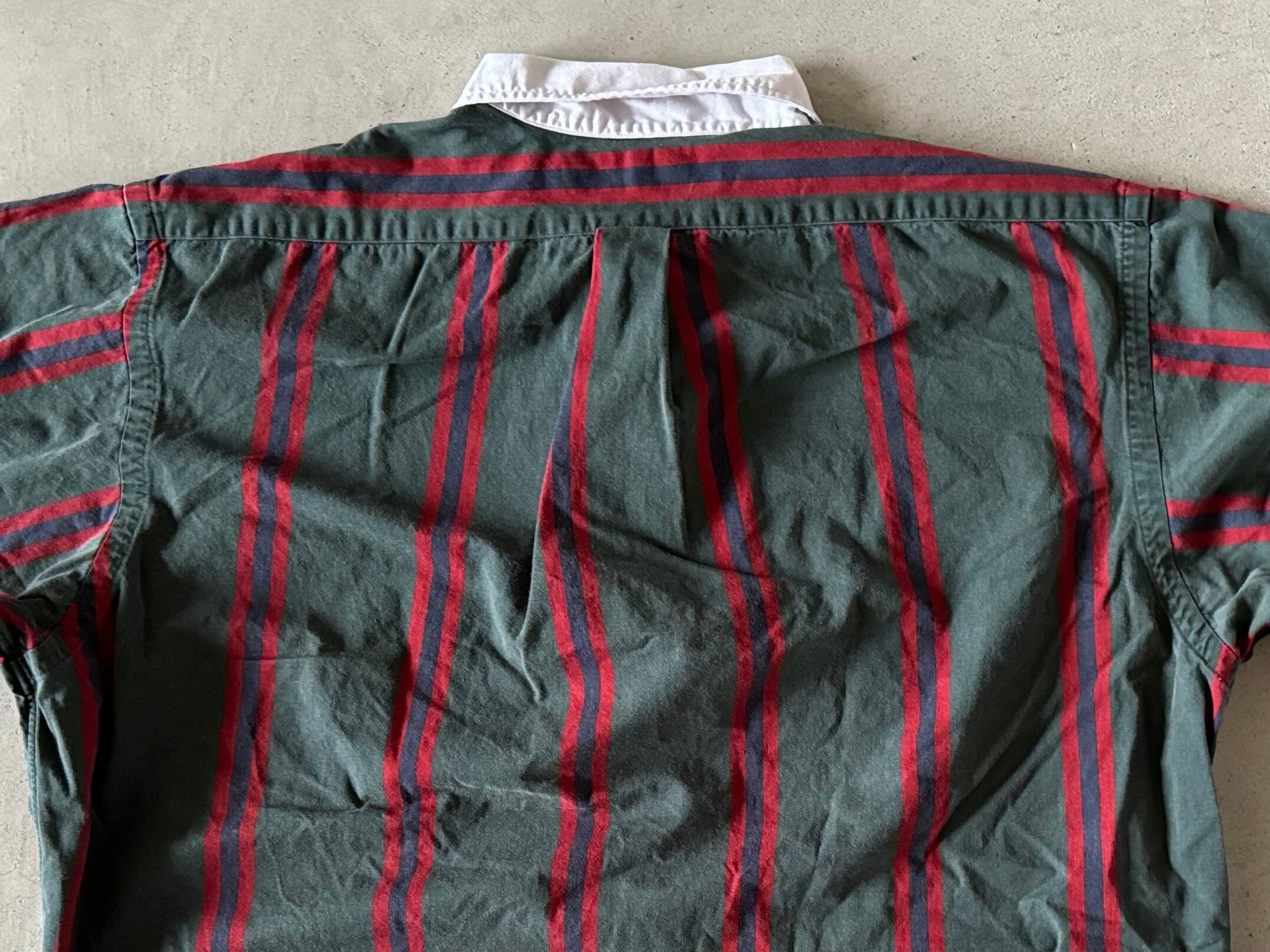 あまり見ないデザイン。シャツ素材で、ラウンドされた裾に、カフスの袖口。パッとした見た目はシャツですが、プルオーバータイプで襟周り、ボタンがラグビー仕様となっております。