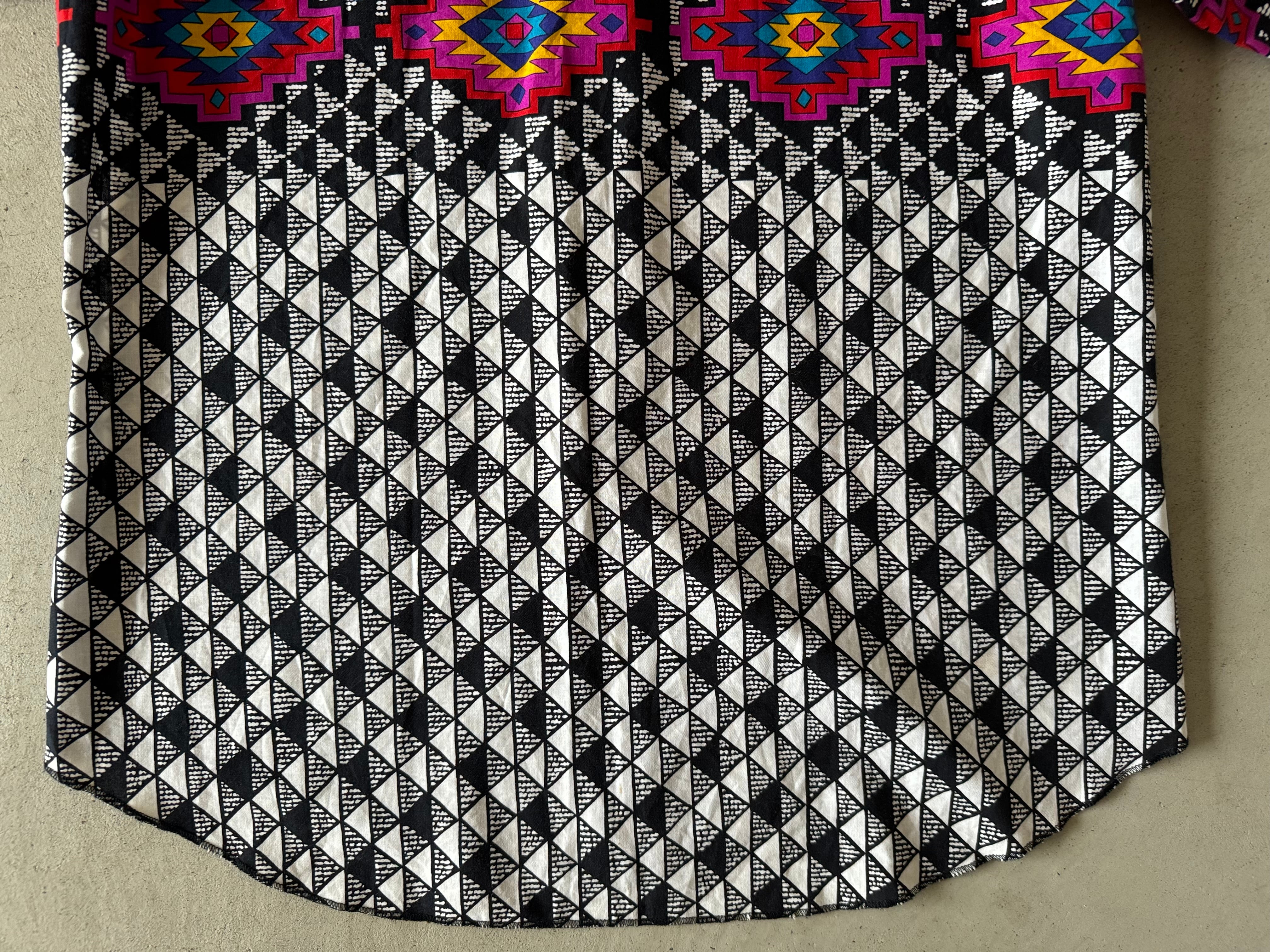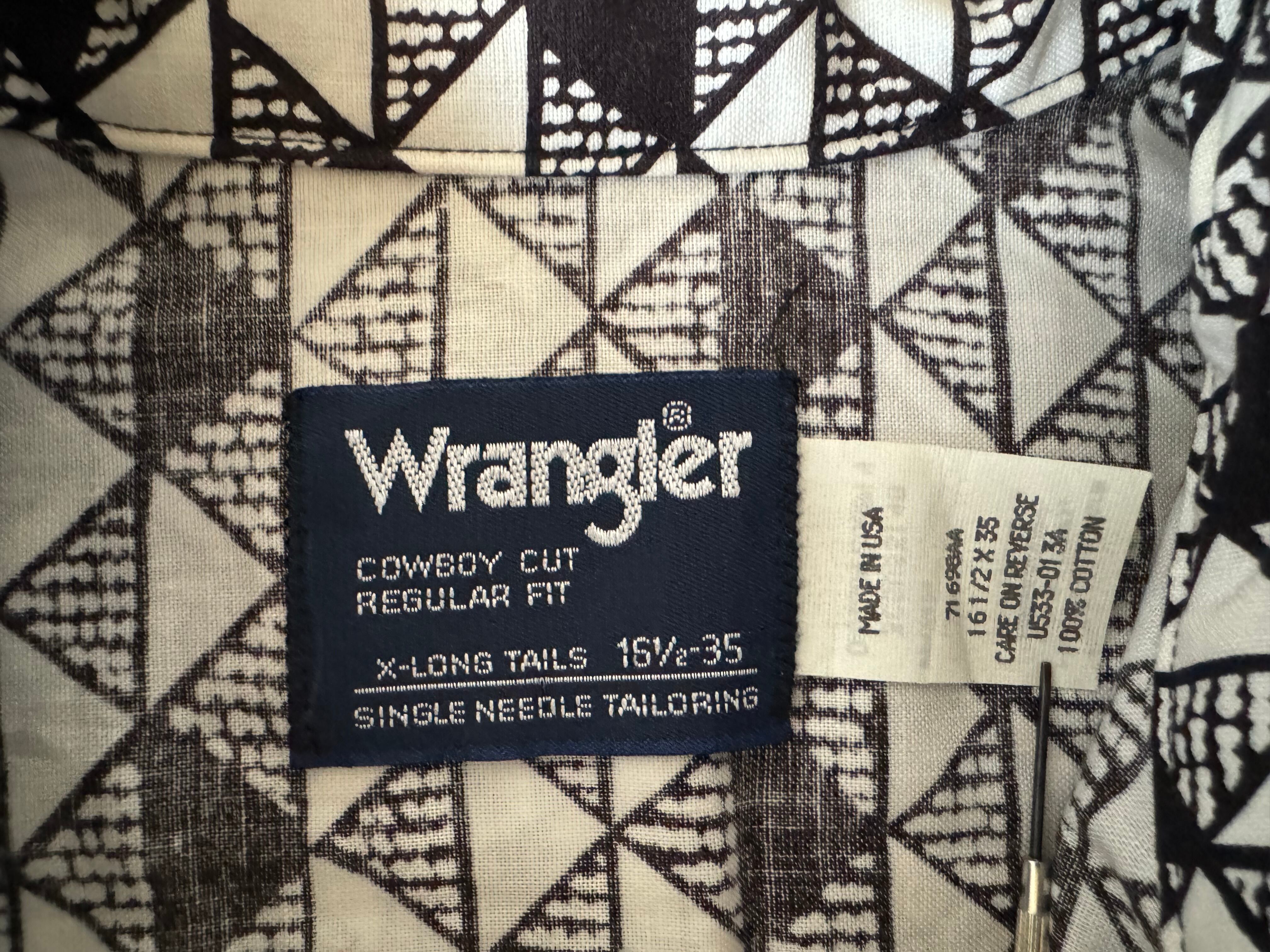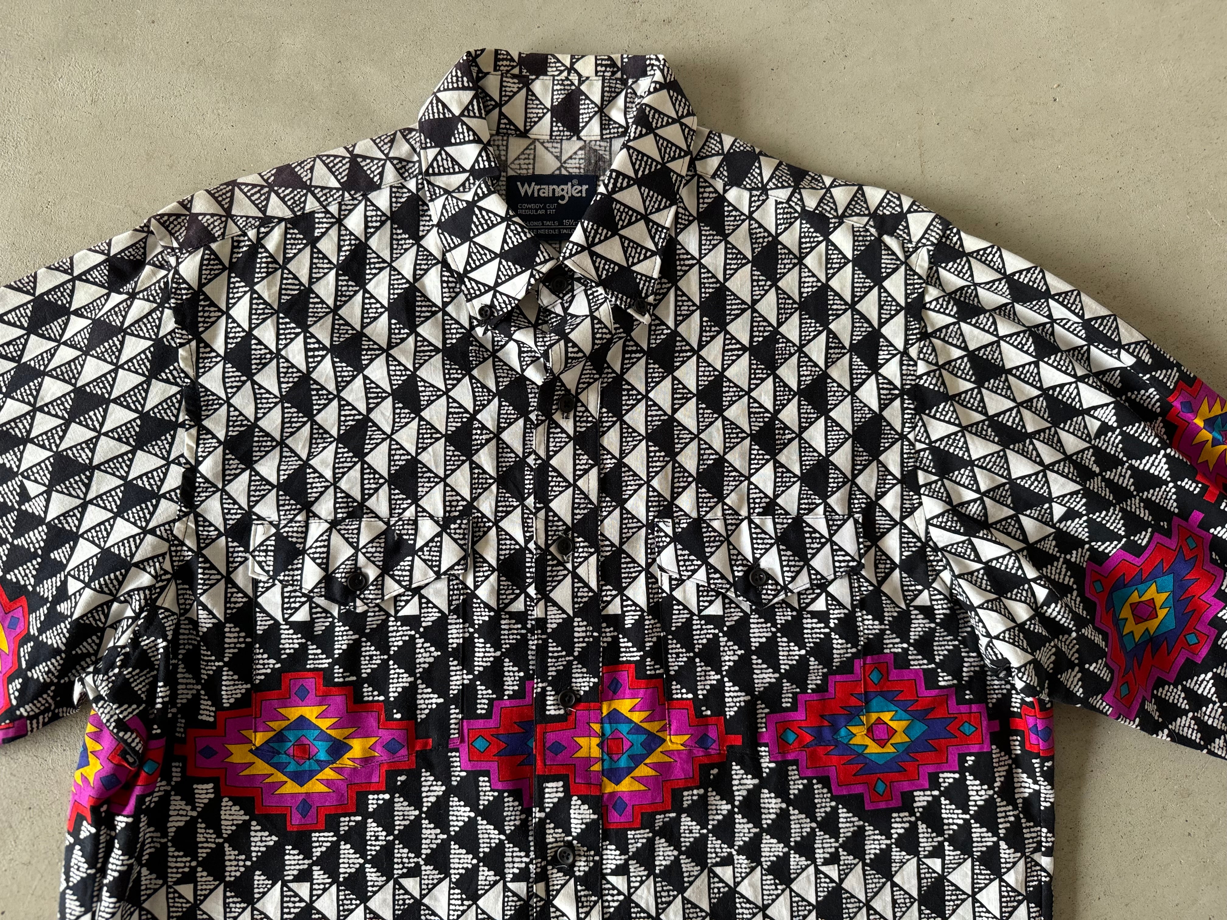白黒の総柄がカッコいい一枚。ラングラーのネイティブ柄物のシャツでこういった白黒をメインとしたシャツはあまり見かけないです。