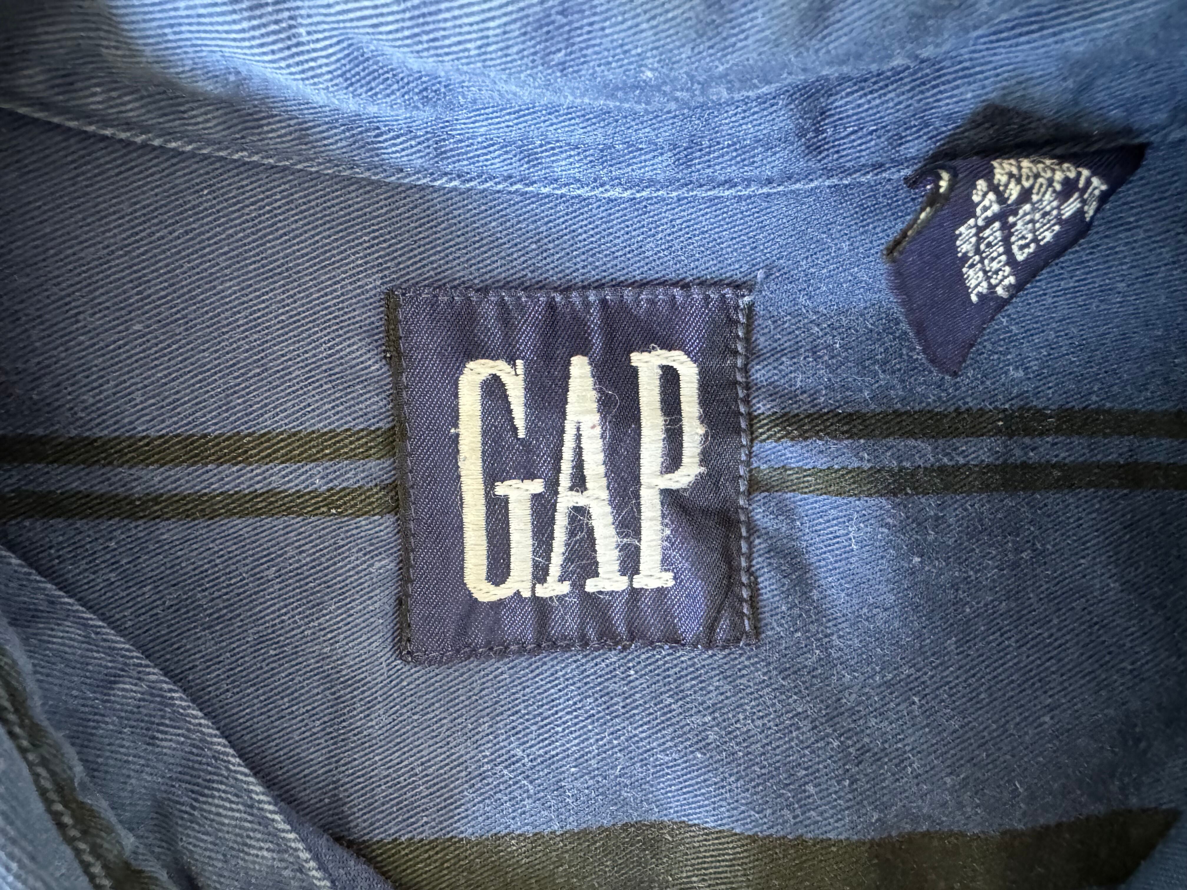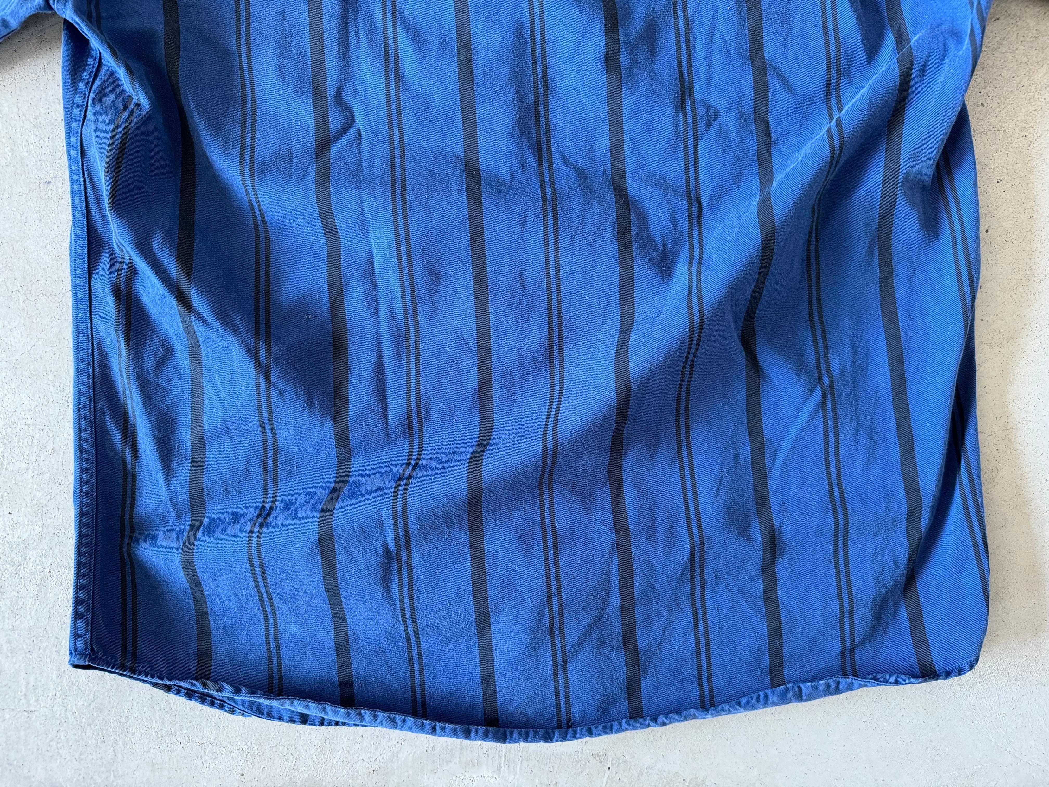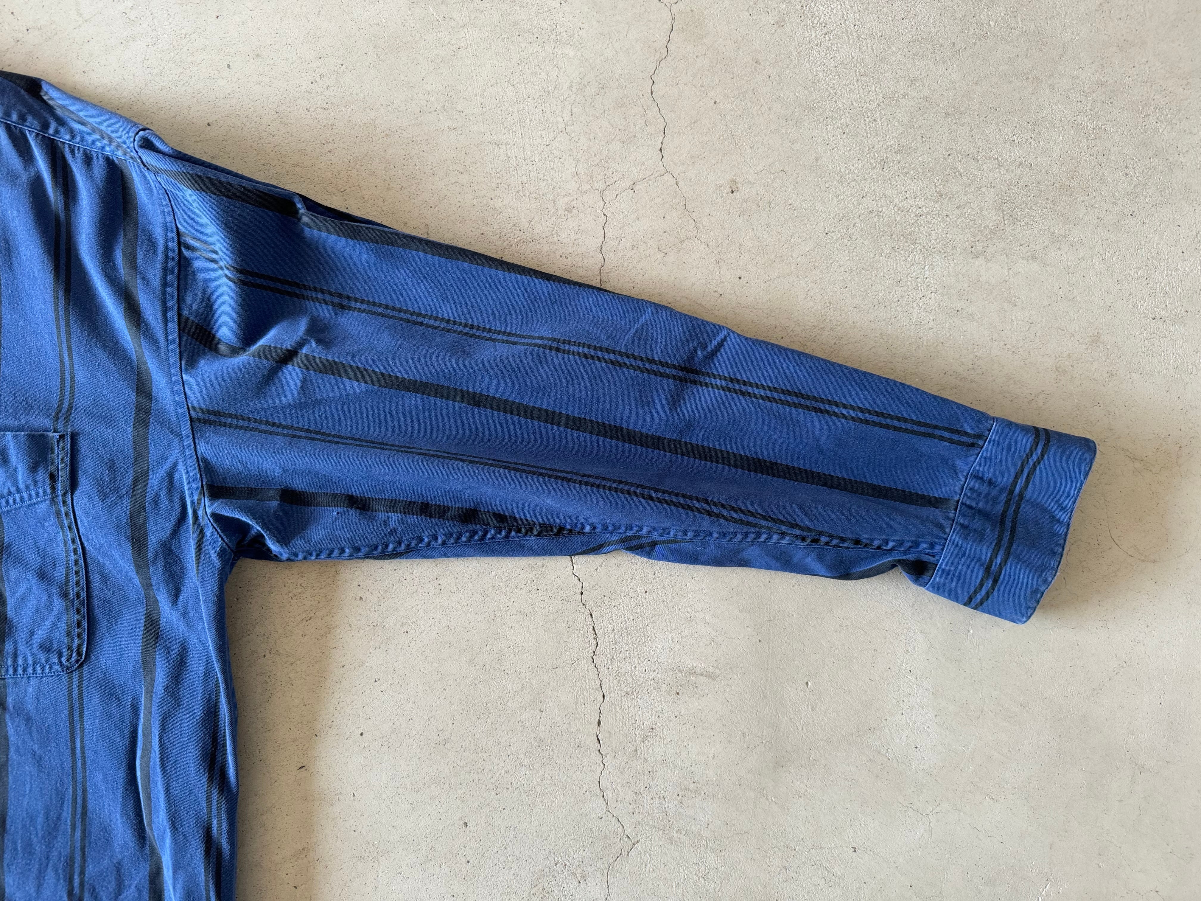 肉厚なコットン素材で濃いネイビーのストライプ柄がカッコいい一枚。