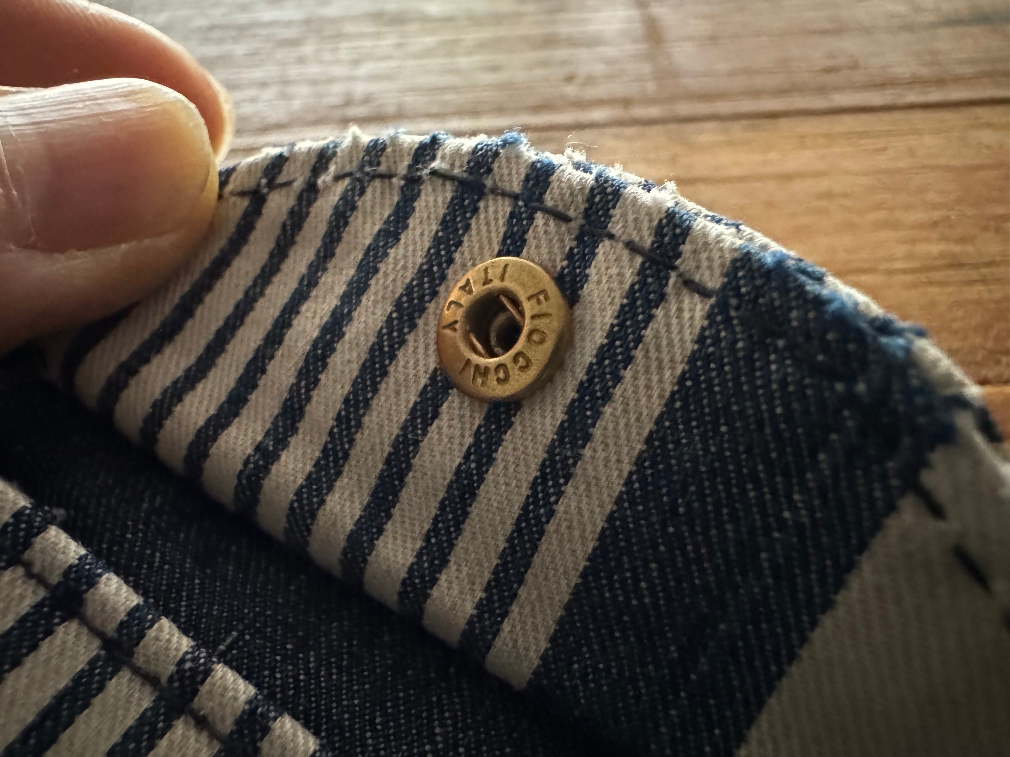 コインポケットのスナップボタンはフィオッキ。イタリア系の高級ブランドが好んで使用していたボタンですが、今は生産されておらず、貴重なデッドストックの物を使用しております。