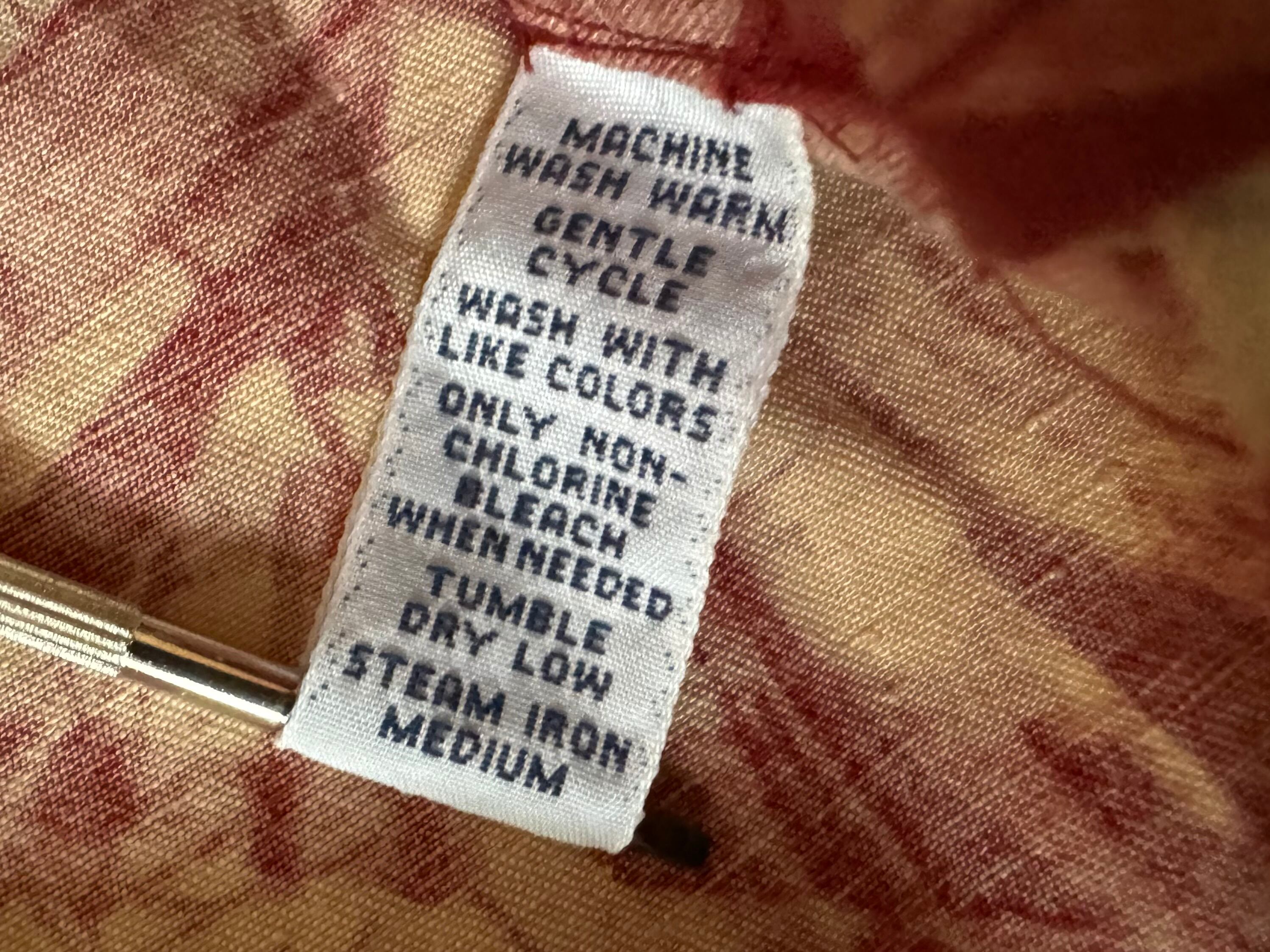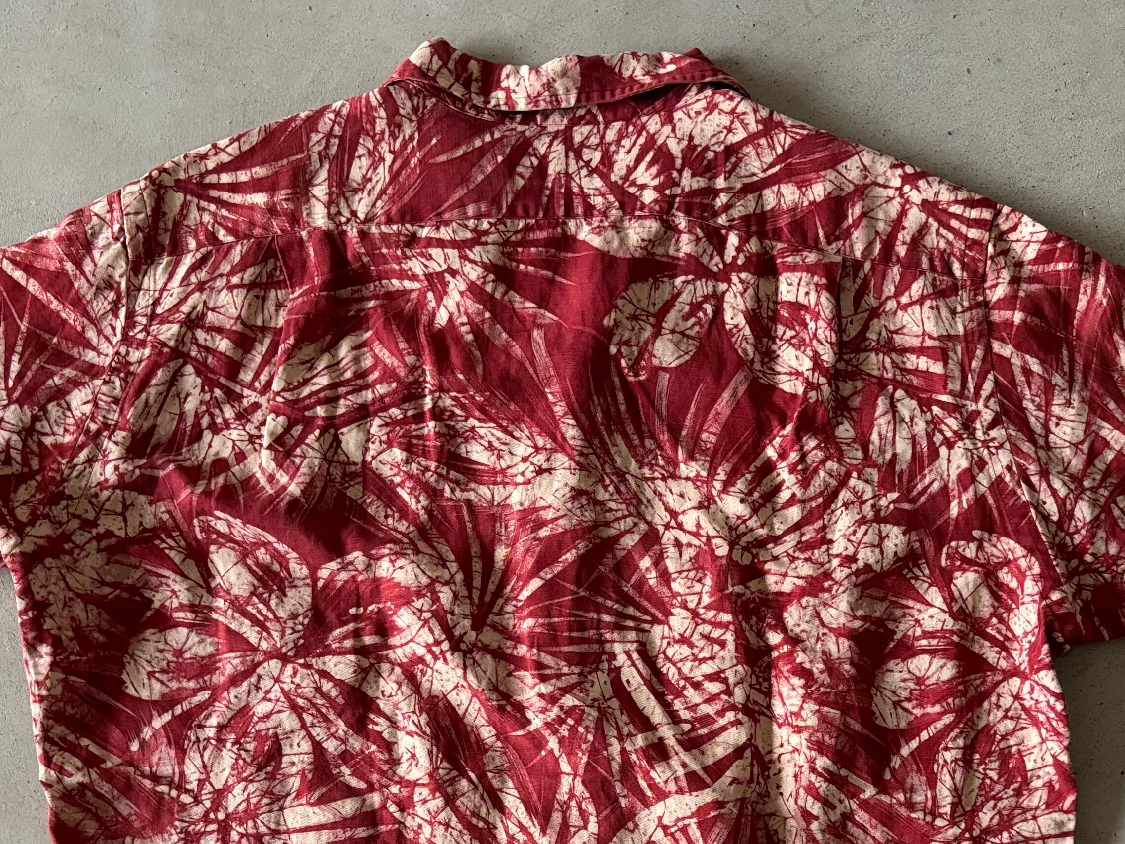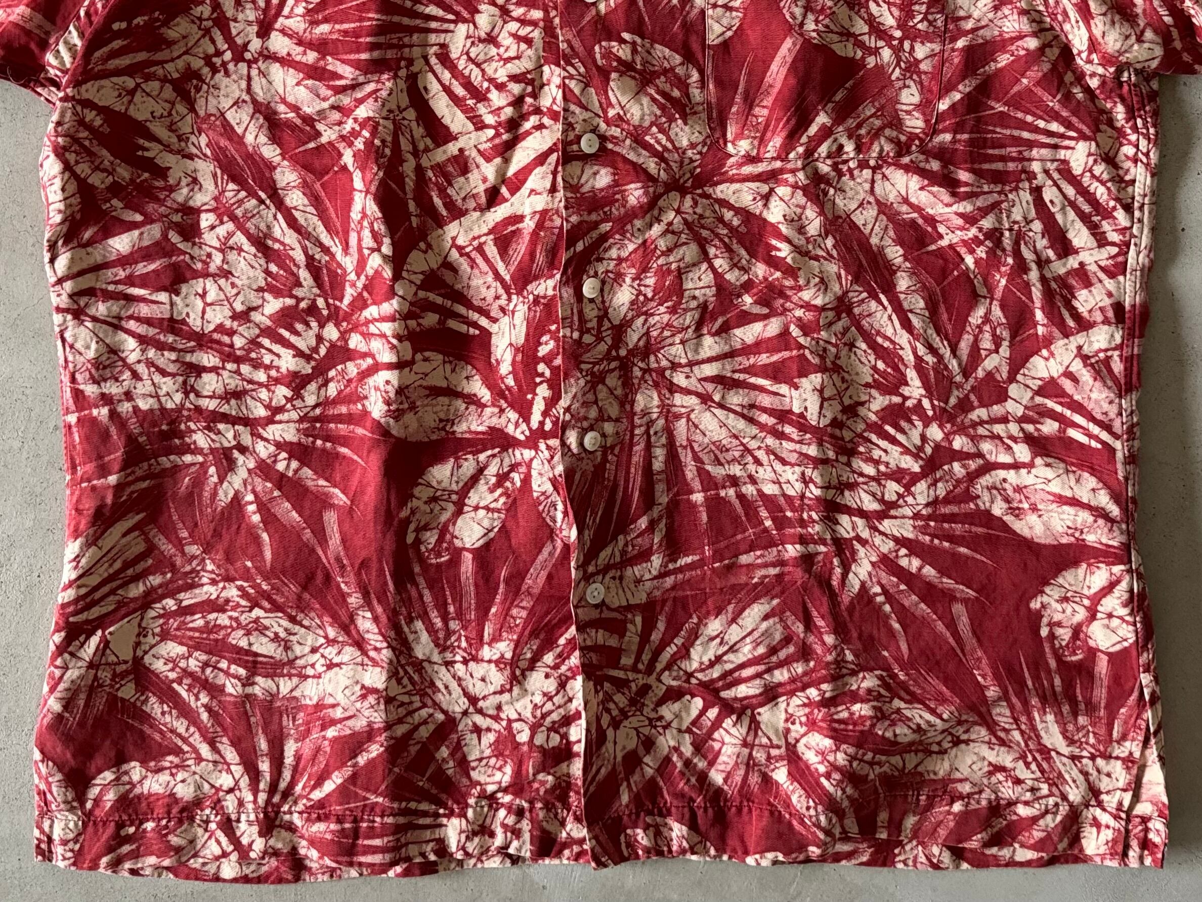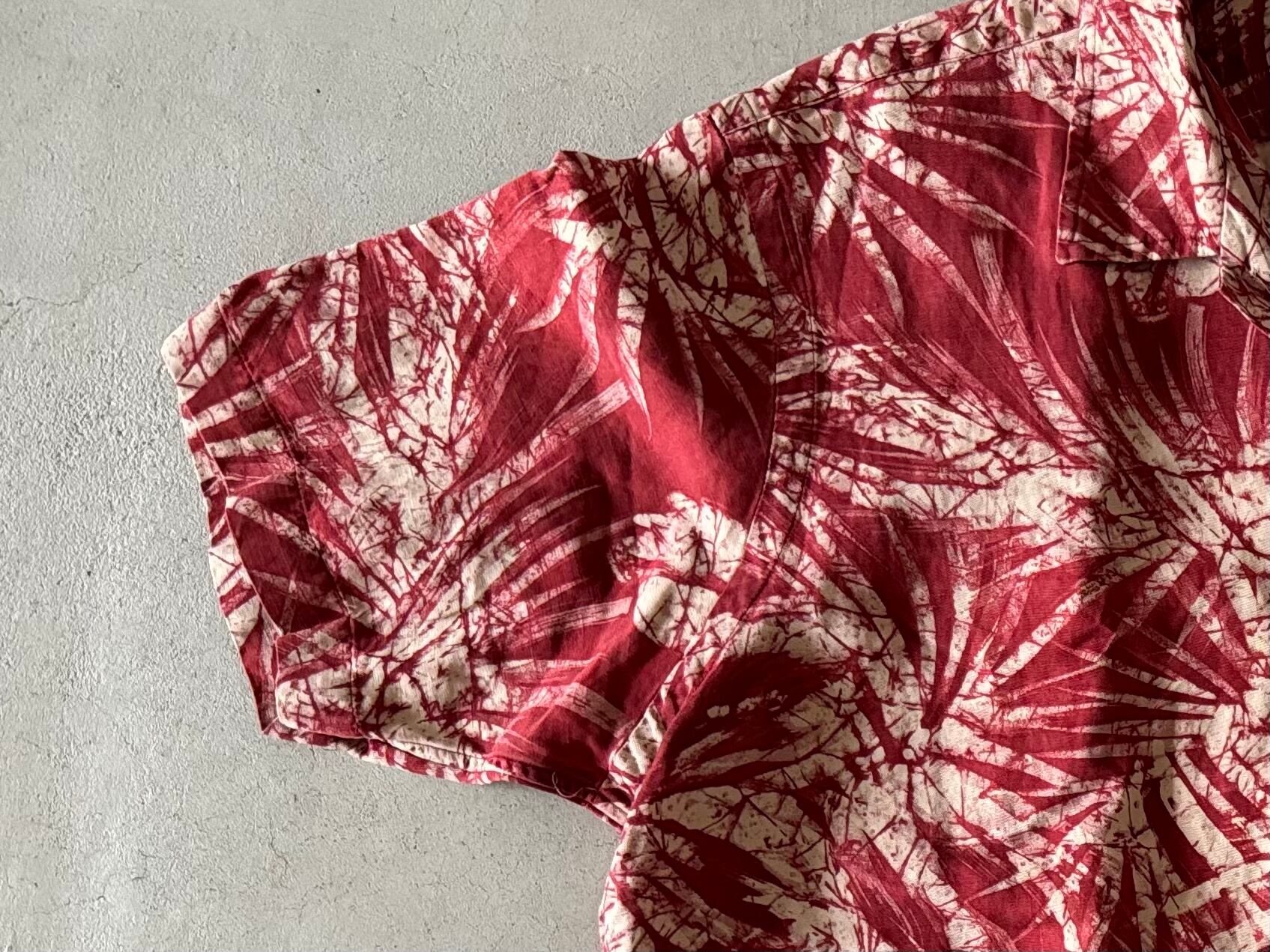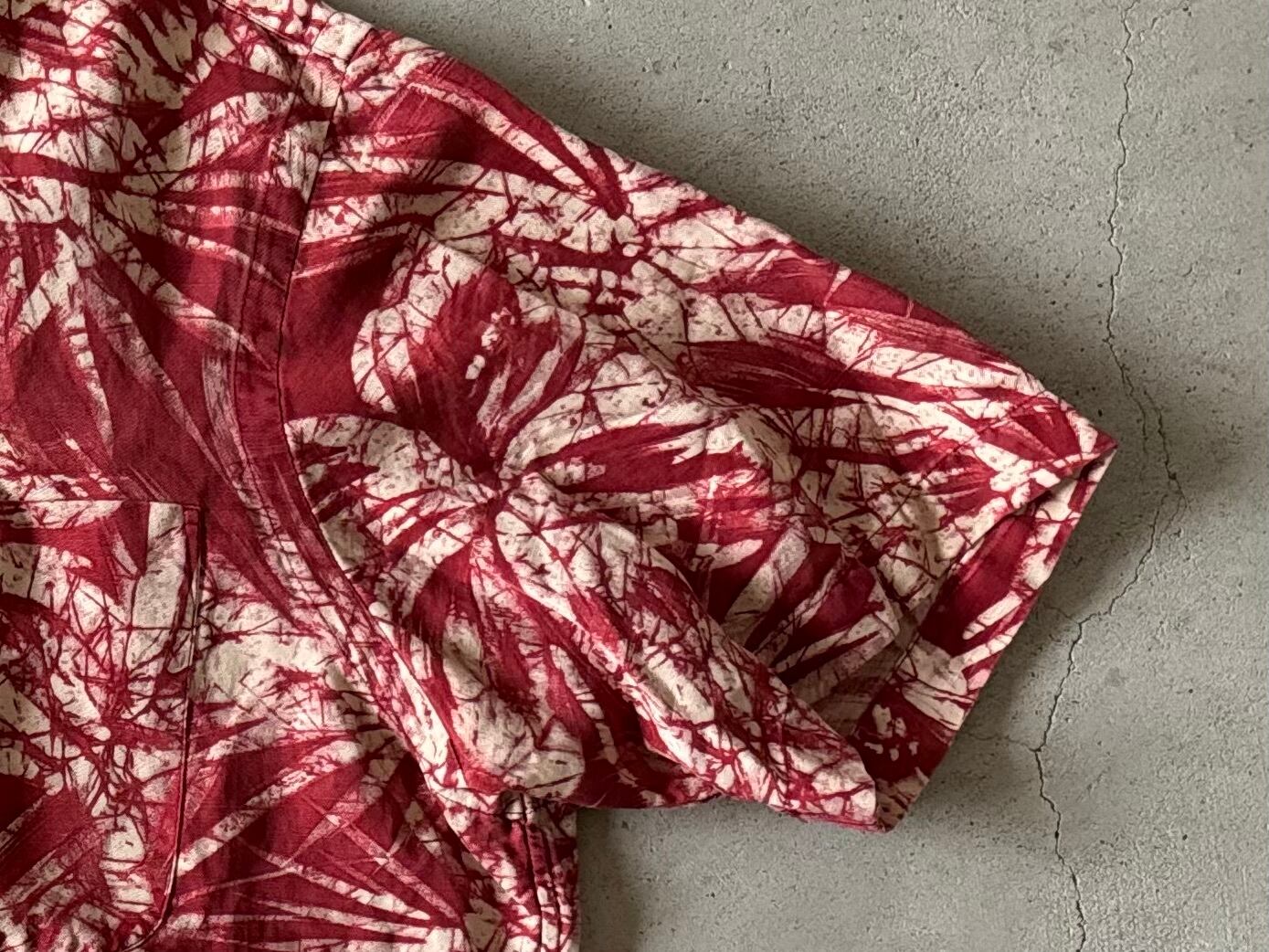 こちらはボタンの1番上が、ループではなくボタンホールの仕様。タイダイ柄のように見えるシダ植物のプリントがインパクト大です。