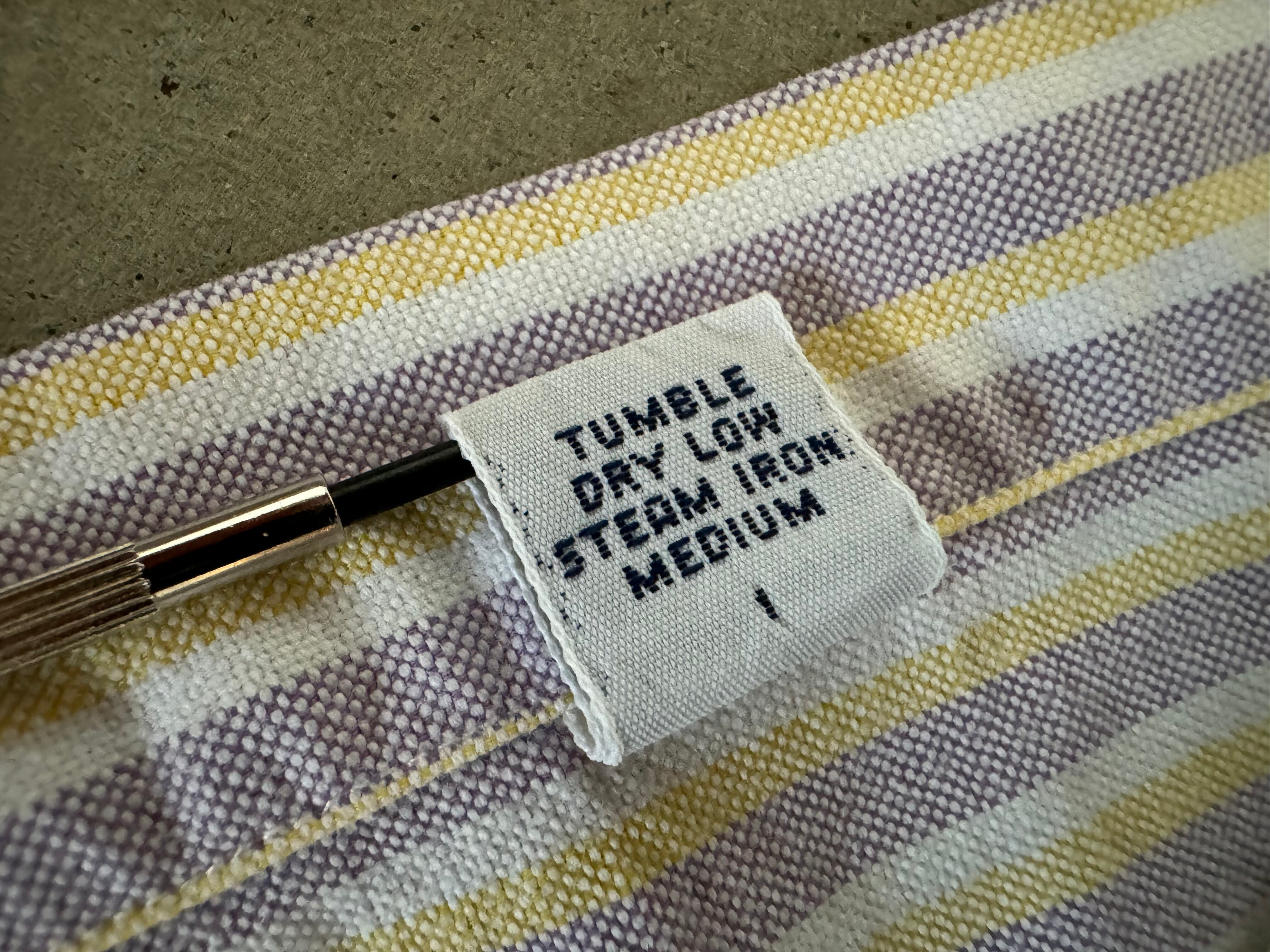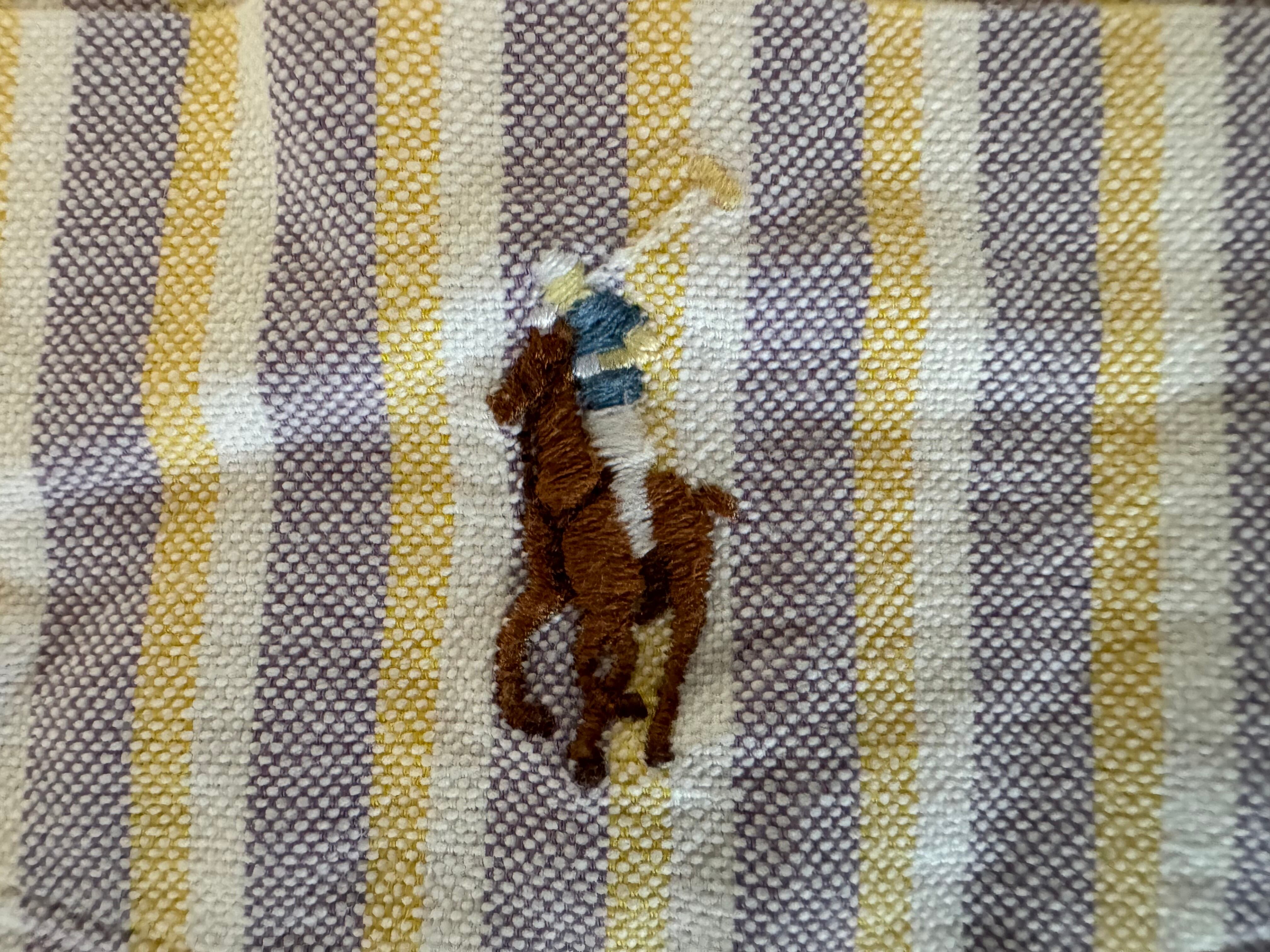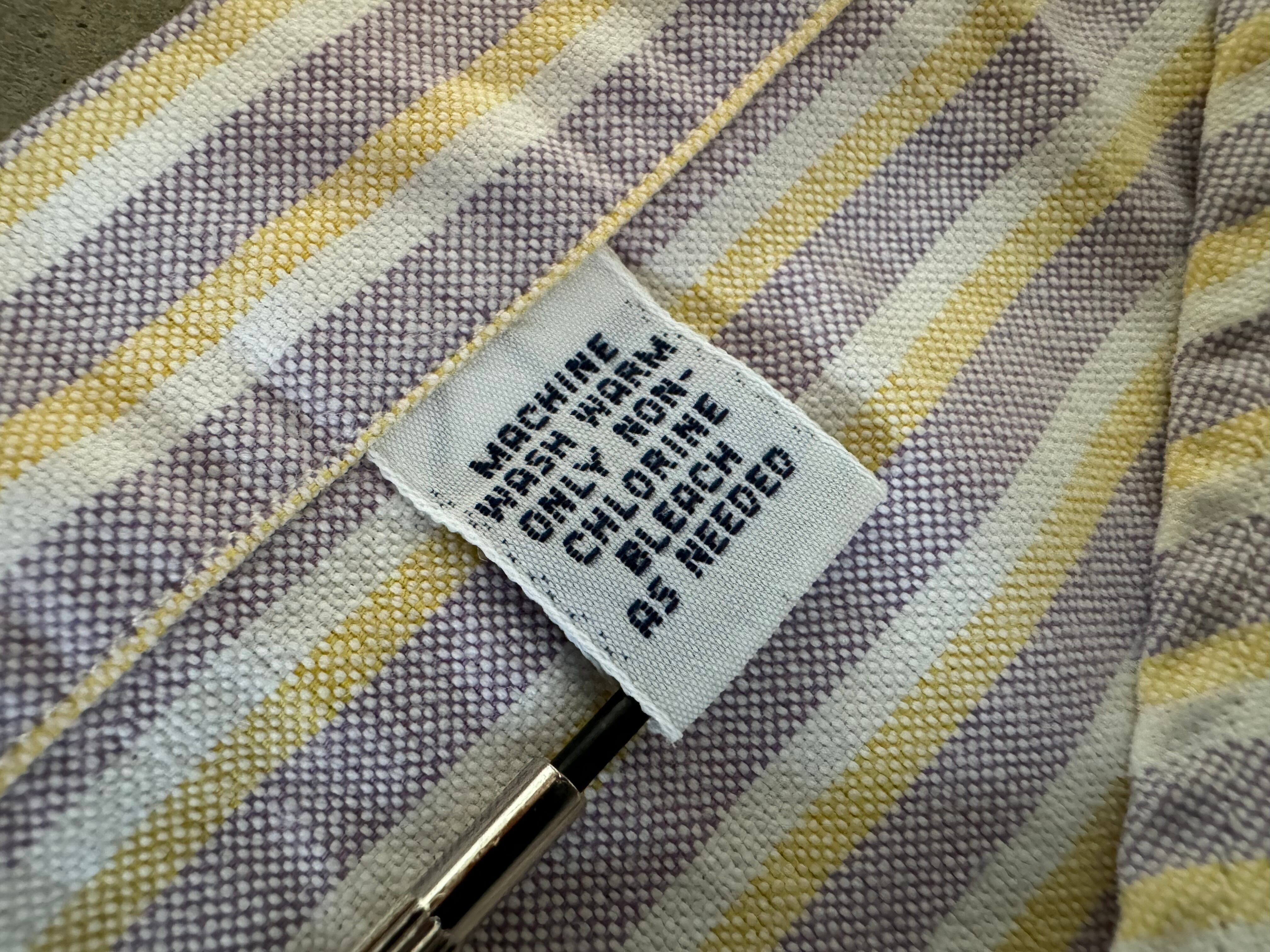 素材はオックスフォード。カラーはパープル、イエロー、ホワイトのマルチストライプ。