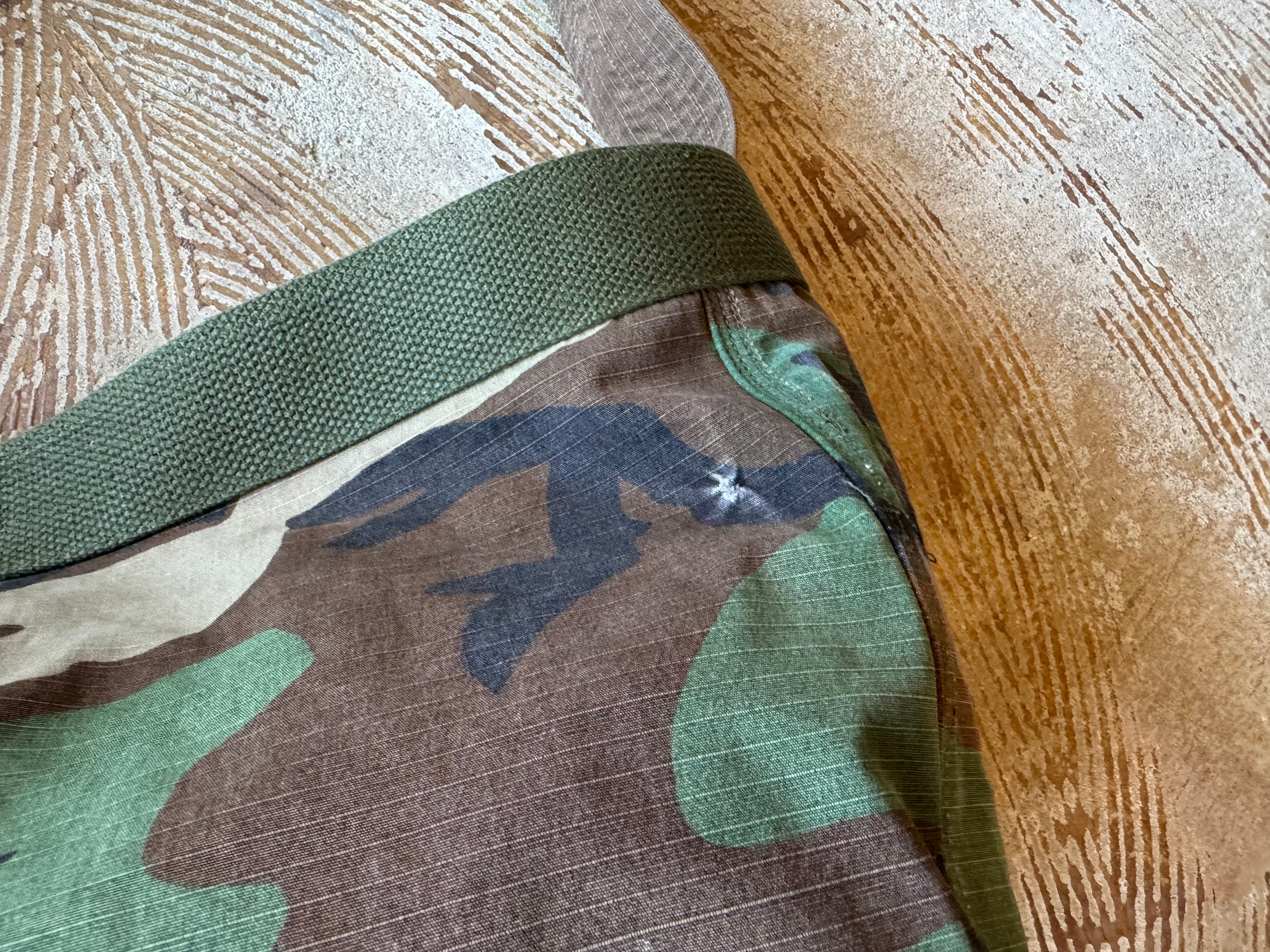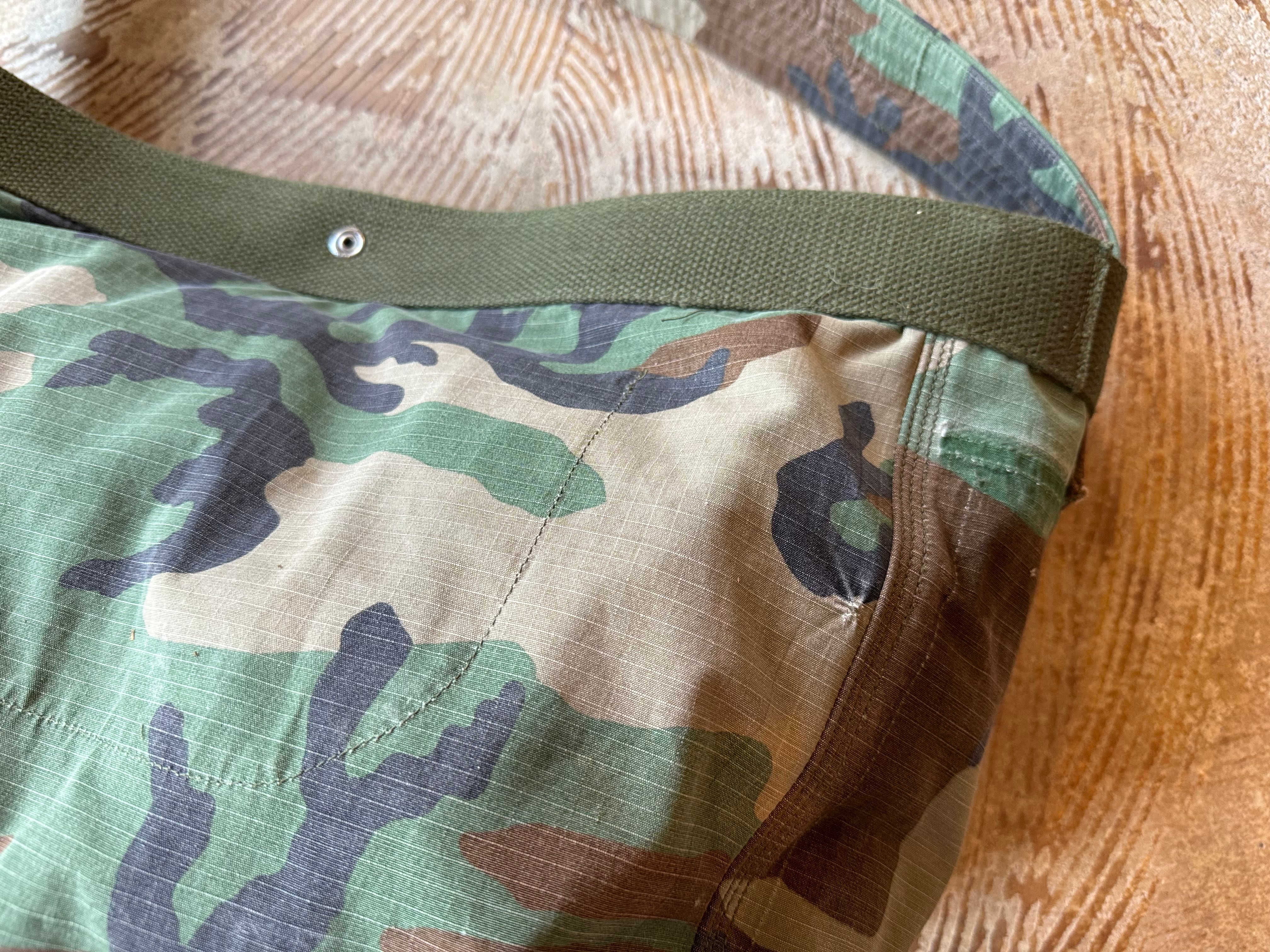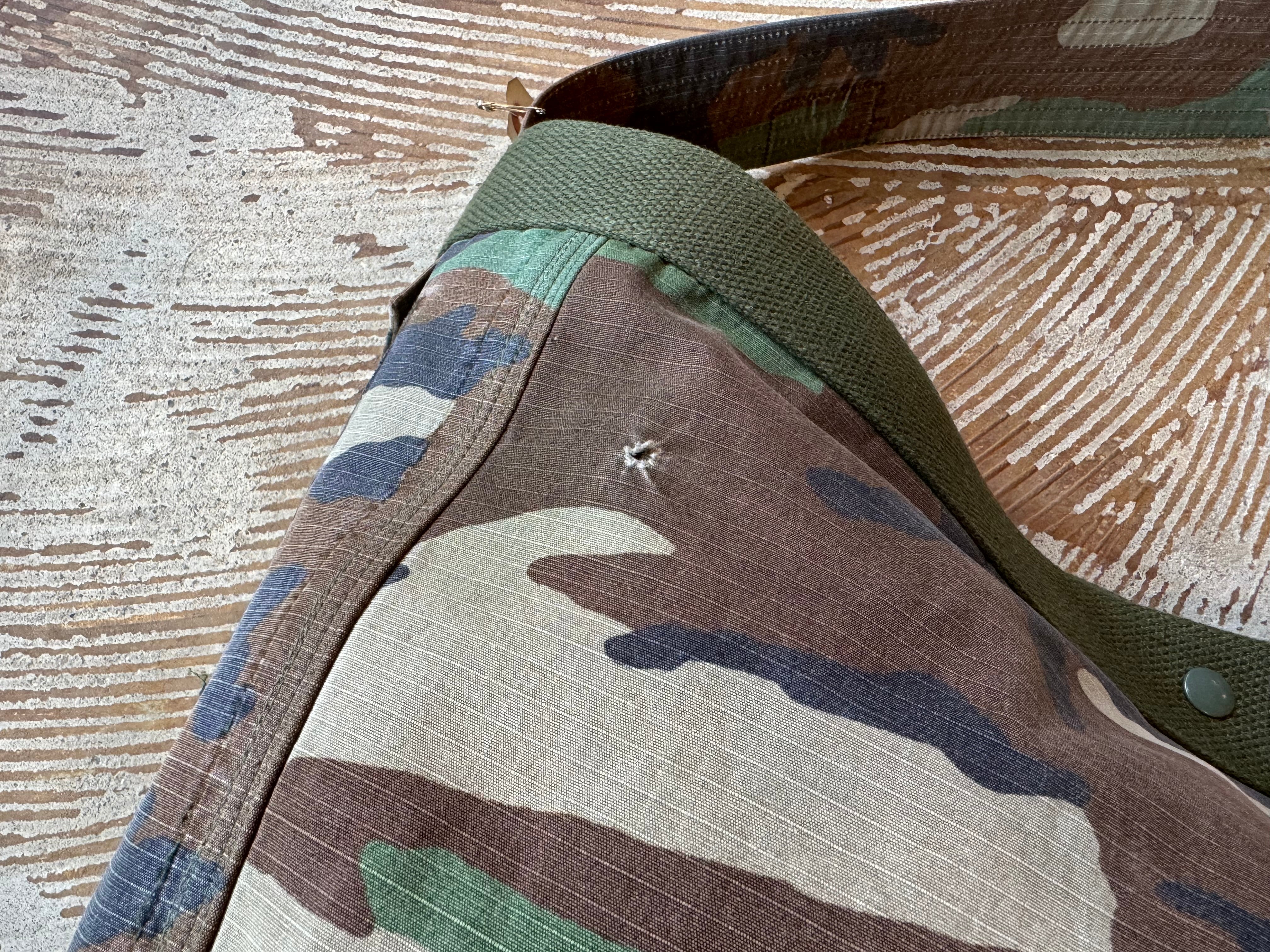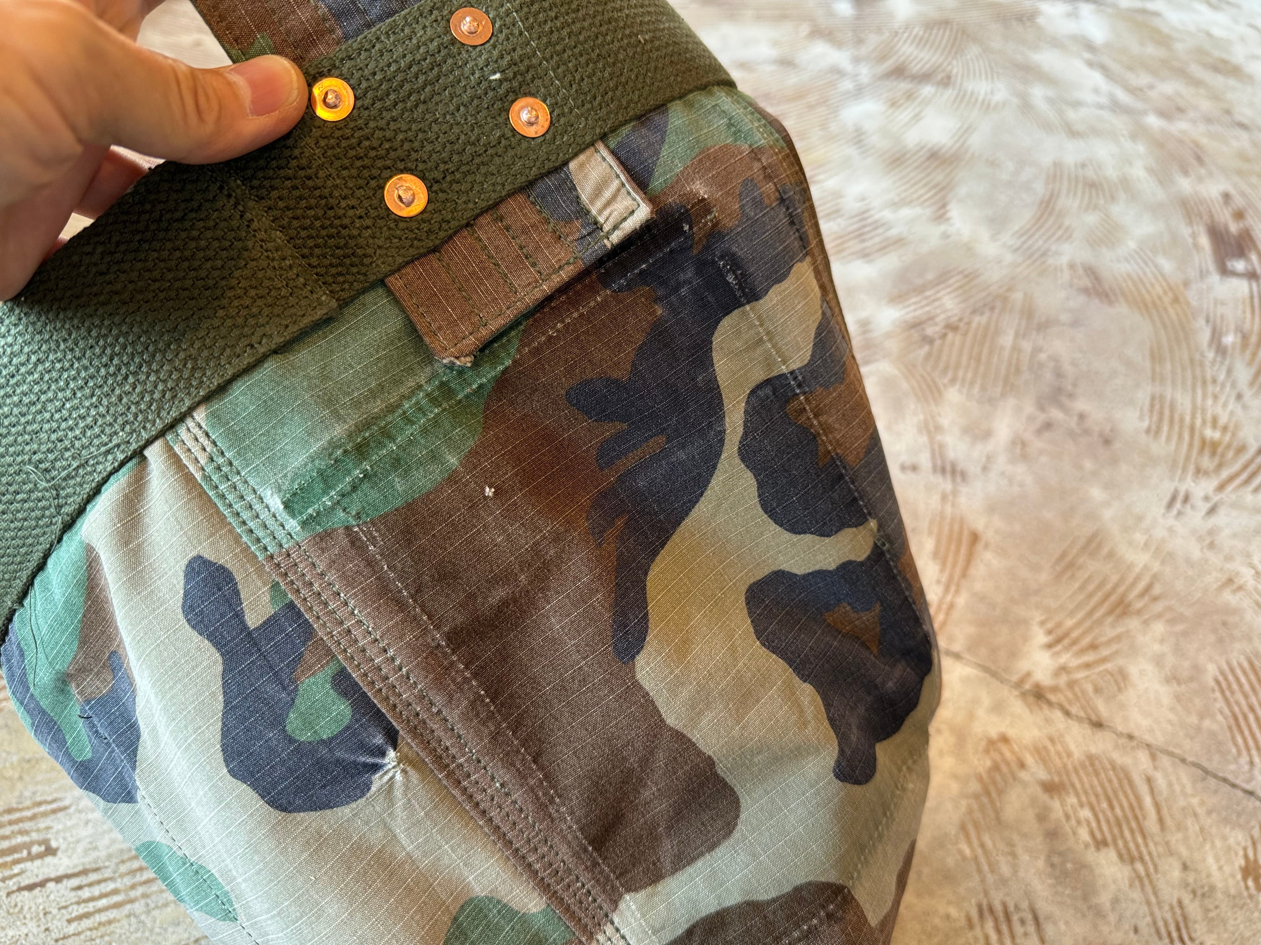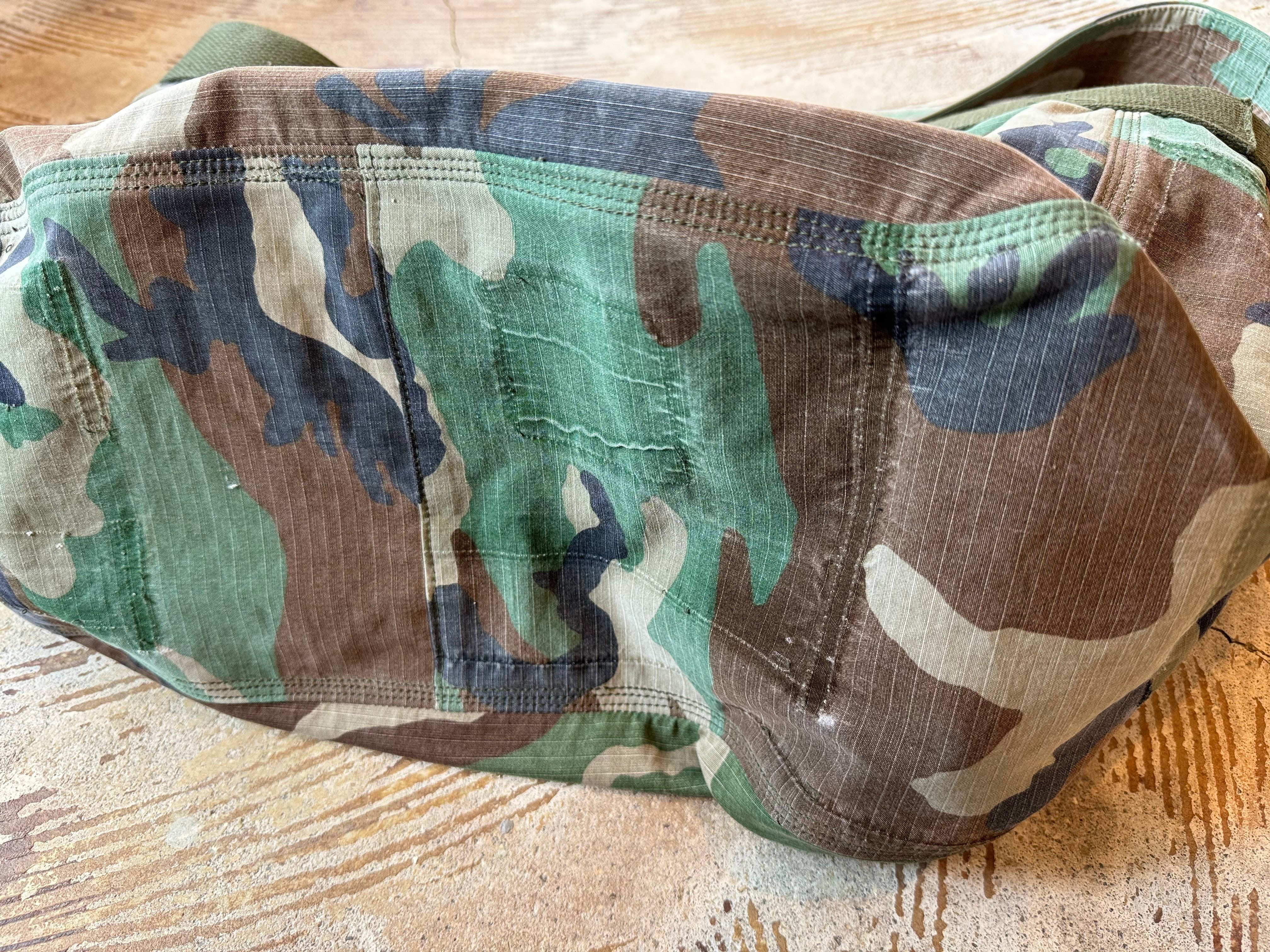 ボディーの生地は87年にアメリカ軍に納入されたリップストップ素材のBDU JACKET。一枚だけでは薄いので裏には、同じくアメリカ軍の80年代頃のフォールディングベッドに装着する頑丈なコットカバーの生地で補強しています。