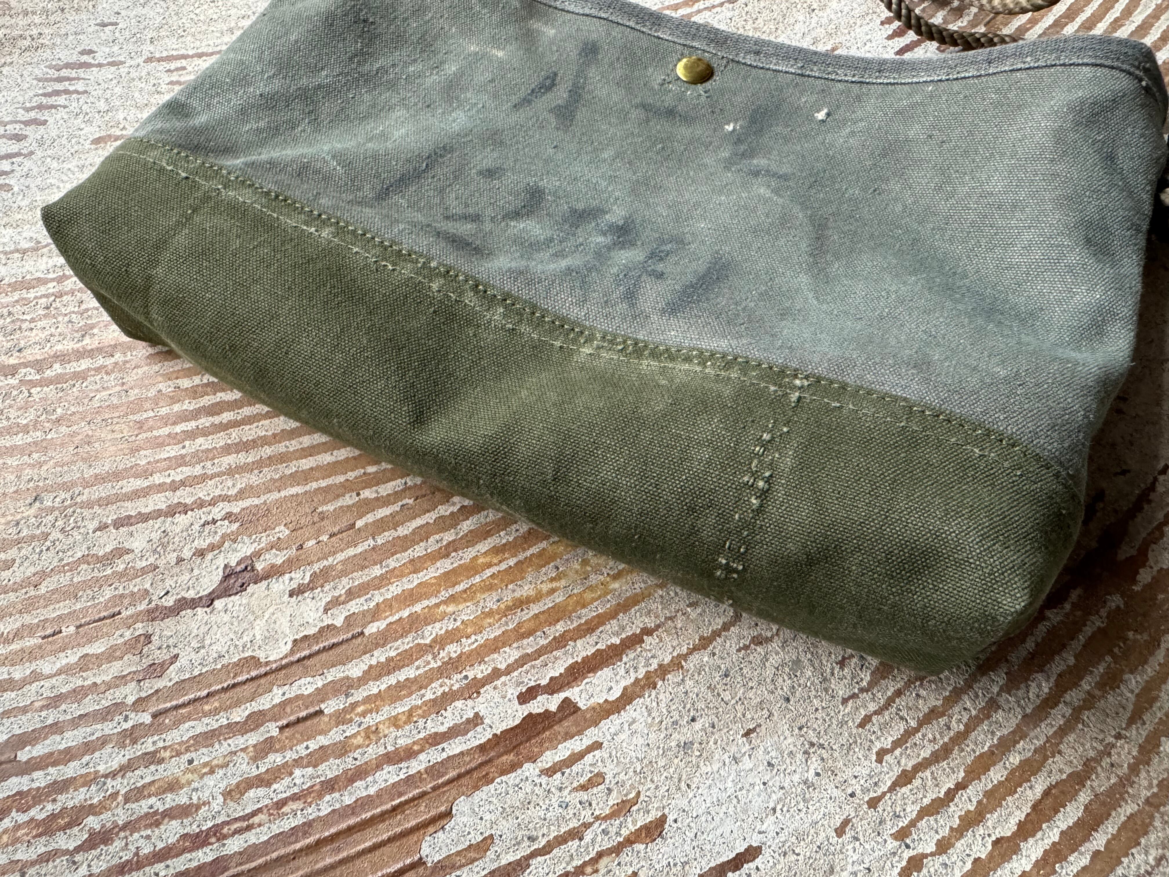 底は50年代のアメリカ軍のダッフルバッグの端切れを使用。あえてカーキの色味が違う物を使うことで上下でメリハリをつけました。