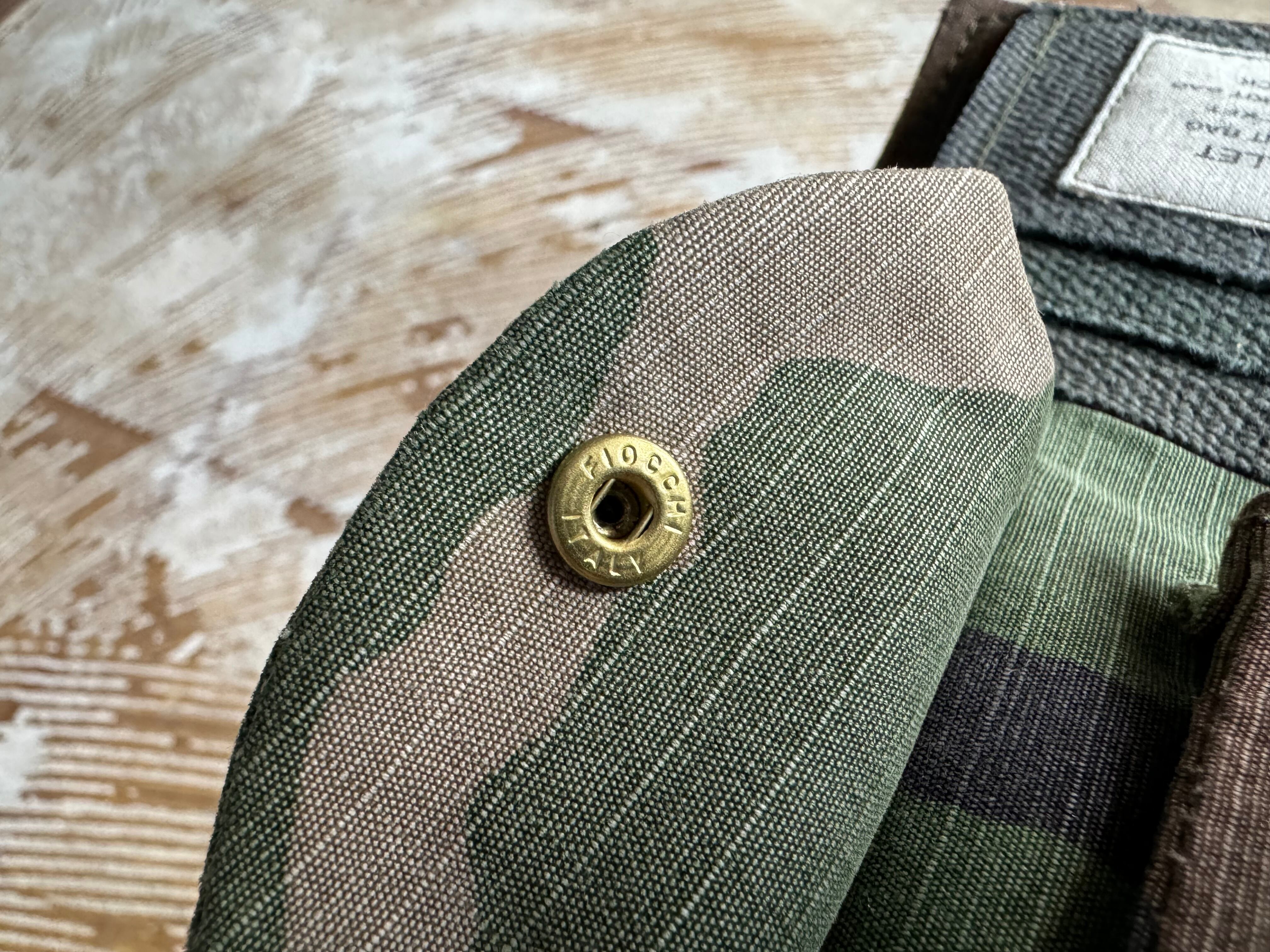 コインポケットのスナップボタンはフィオッキ。イタリア系の高級ブランドが好んで使用していたボタンですが、今は生産されておらず、貴重なデッドストックの物を使用しております。