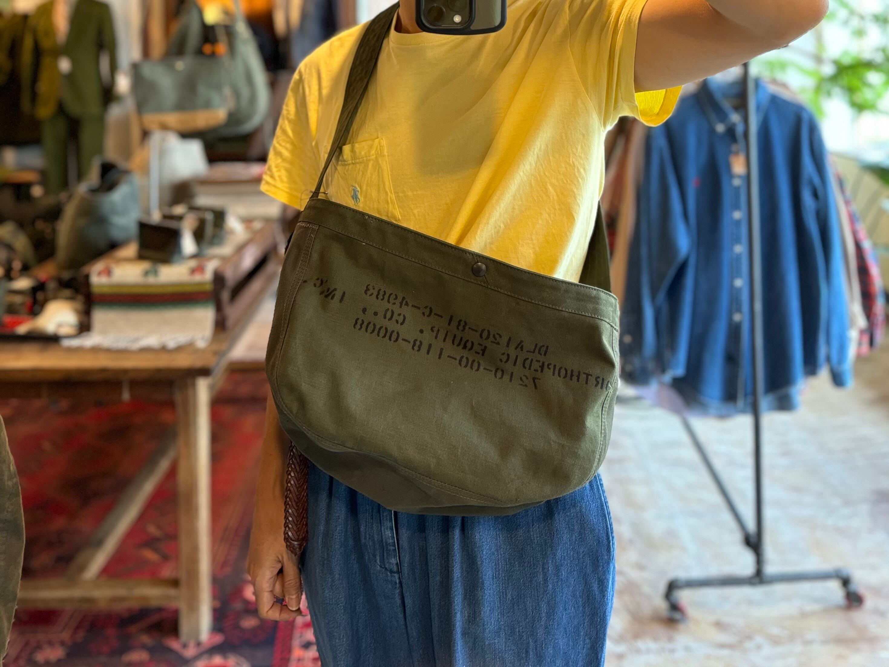 昔、新聞配達をする時に使用されていたバッグをサンプリングしております。ヴィンテージなどで見かけるニュースペーパーバッグよりも少し小さめで女性でも合わせやすいサイズ感。もちろん男性でも使いやすいサイズ感です。