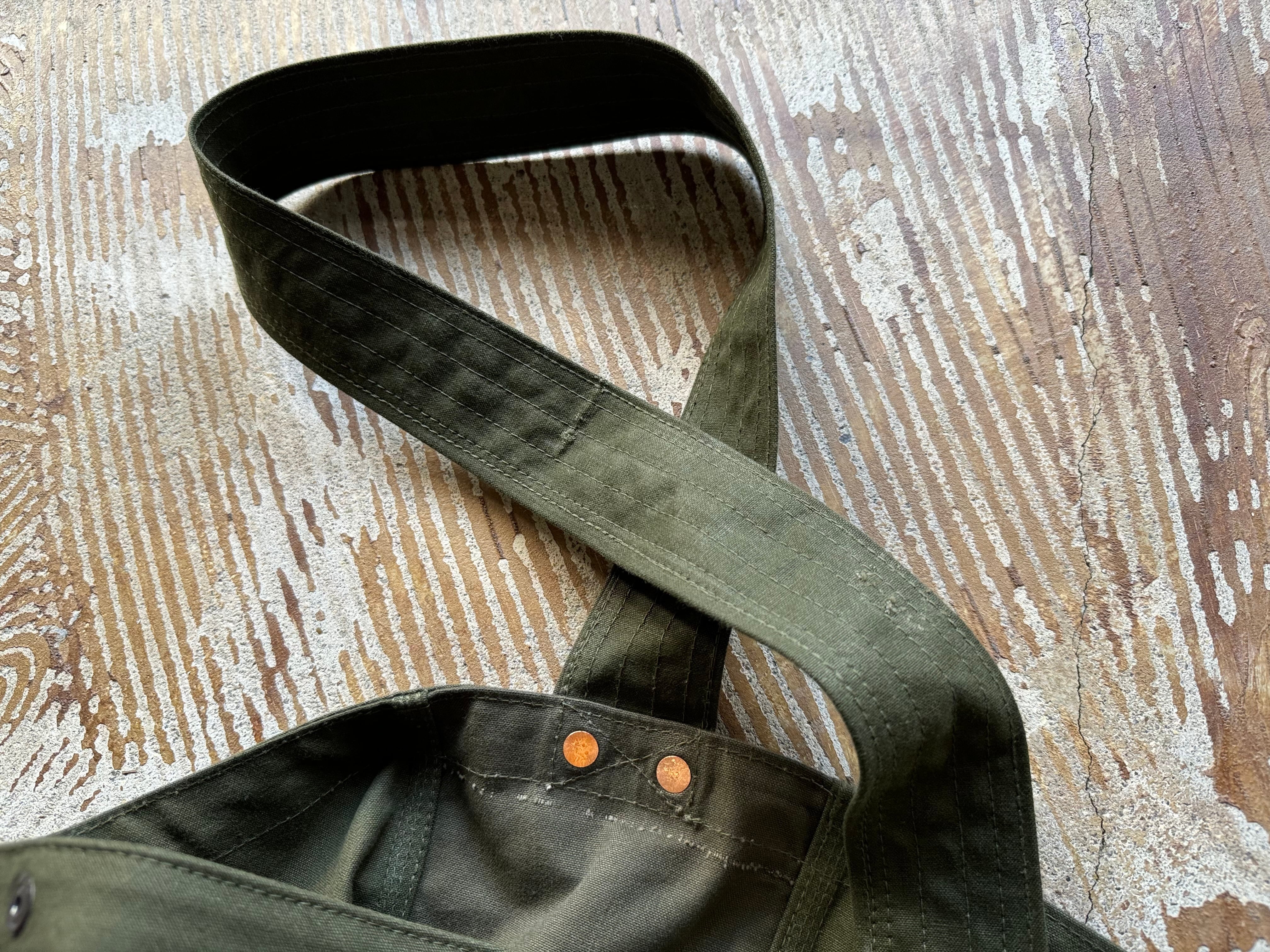 ボディーの生地は80年代、アメリカ軍のフォールディングベッドに装着するコットカバーのデッドストックの生地。生地感はガッシリとしたコットンで、カーハートなどのカバーオールに使われているダック生地のような素材感です。