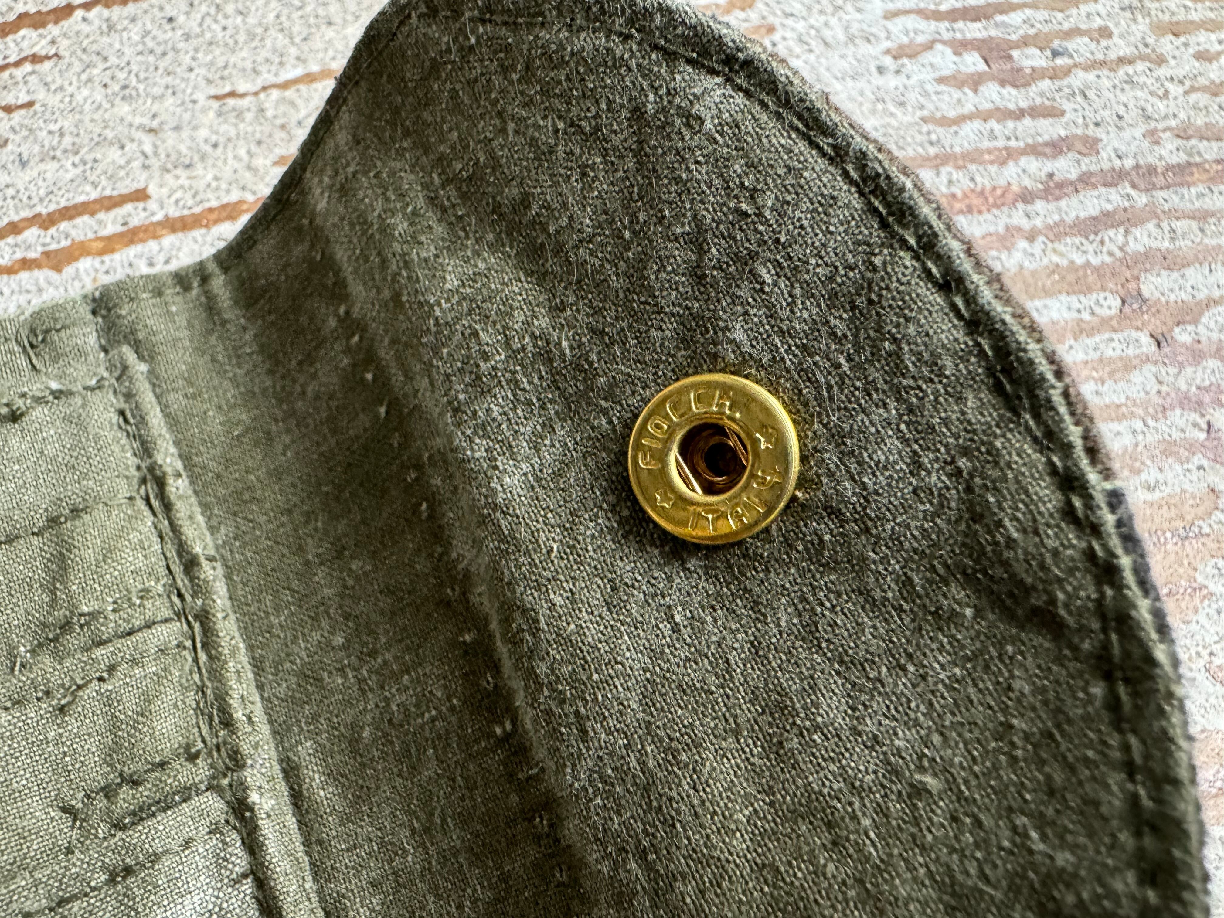 フラップのスナップボタンはフィオッキ。イタリア系の高級ブランドが好んで使用していたボタンですが、今は生産されておらず、貴重なデッドストックの物を使用しております。