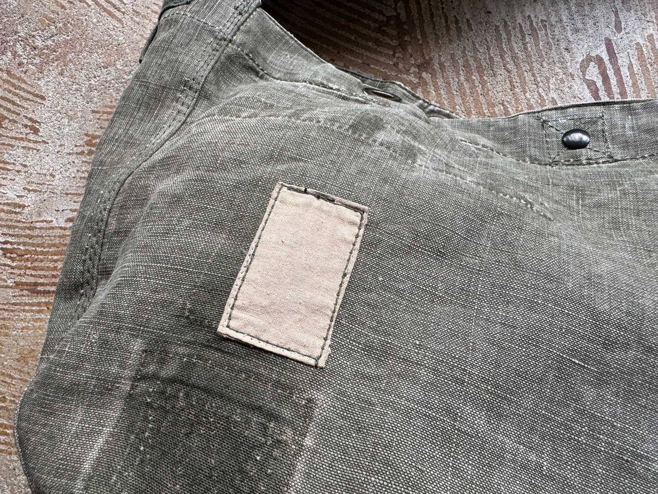 穴があいた、破れた、糸がほつれた、などのトラブルは、ヴィンテージ生地でのパッチワークや、ミシンでたたいて補修をします。ボタンやスナップボタンなどの付属品が取れてしまった、カバンのストラップがちぎれたなどの場合は、似寄りの物で対応させていただきます。