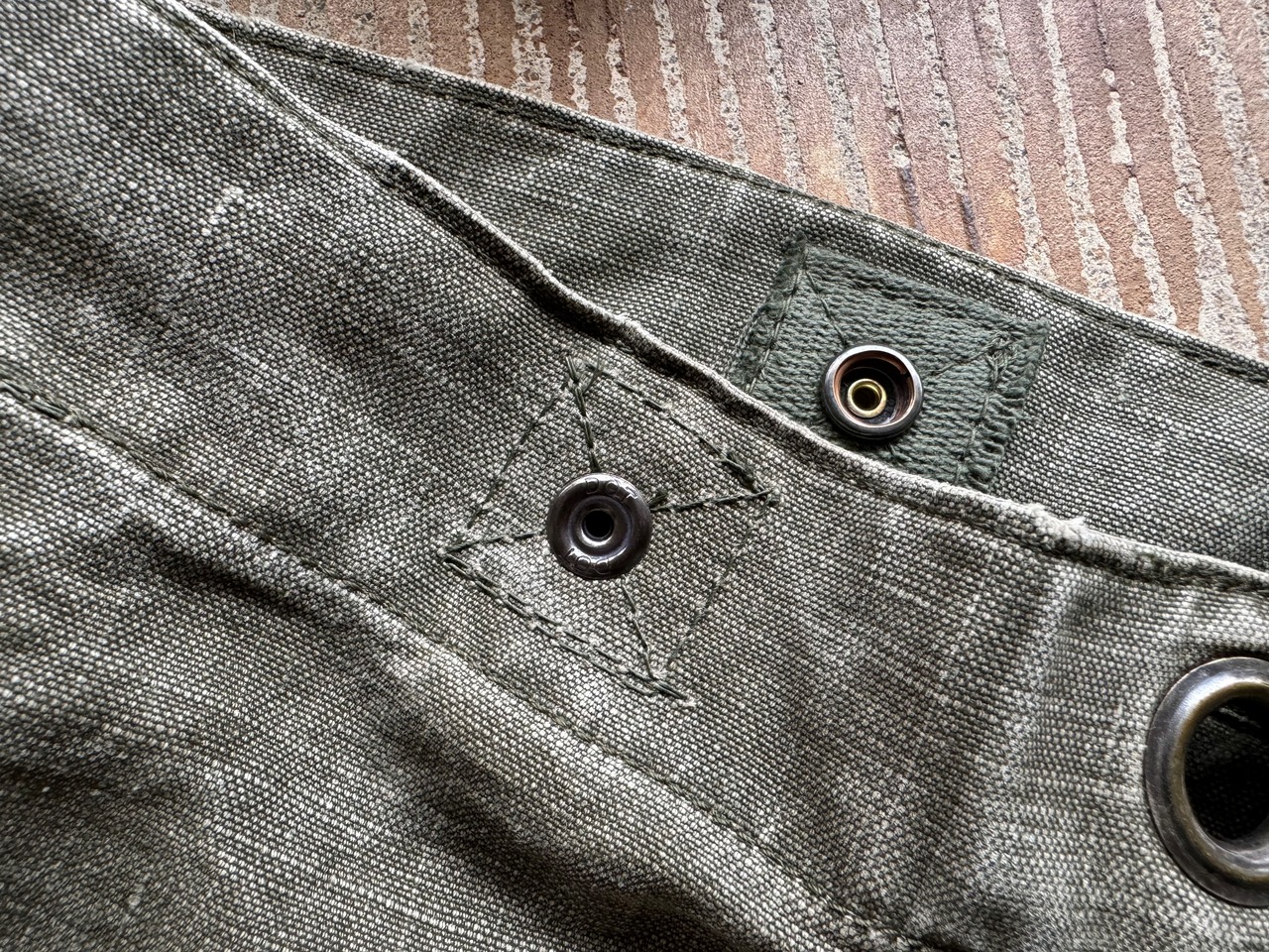 開口部についているスナップボタンは、70年代、スコービル社が米軍に納入したデッドストックのドットボタンを使用してます。『DOT』の刻印も玄人にはグッとくるところかと。。。