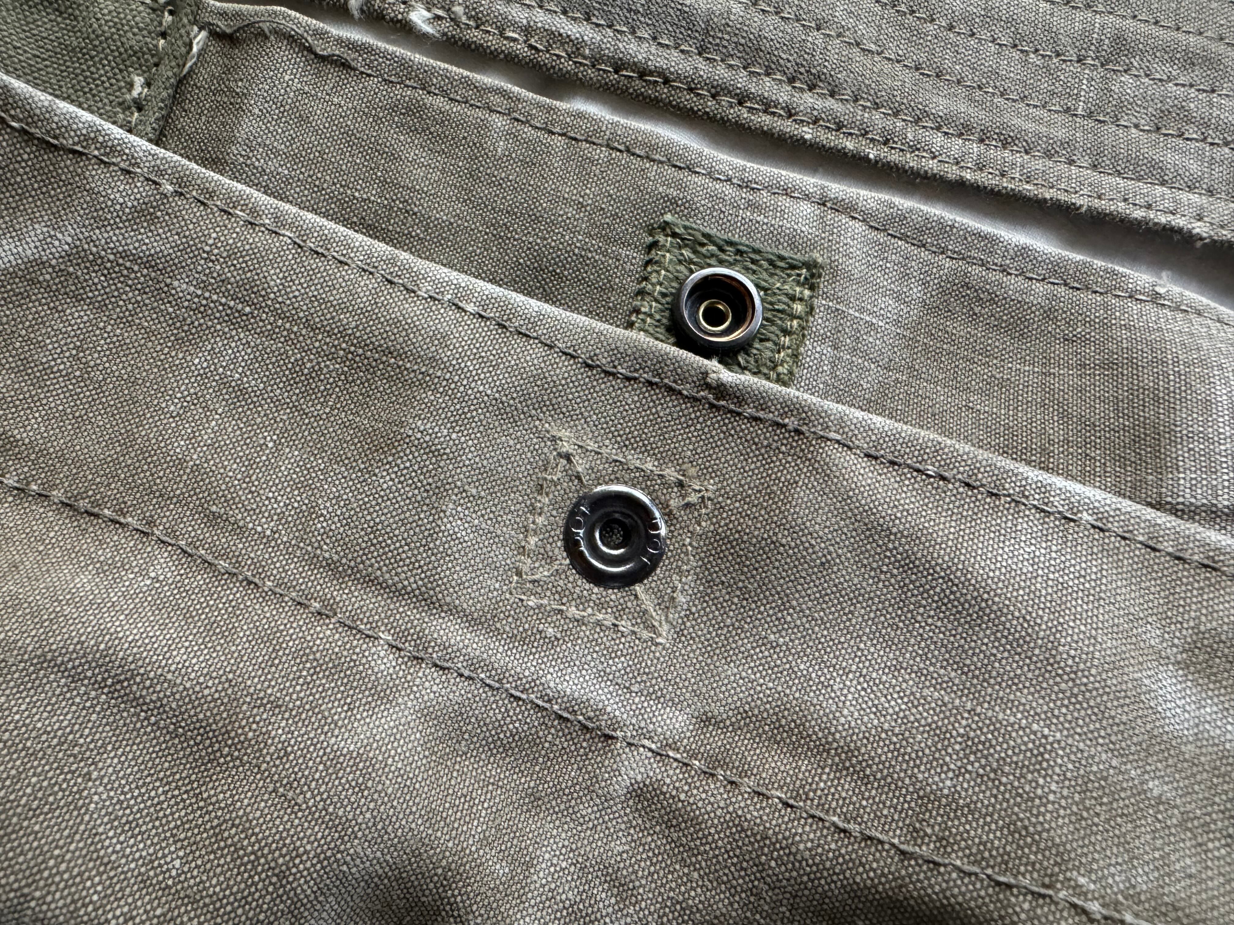 開口部についているスナップボタンは、70年代、スコービル社が米軍に納入したデッドストックのドットボタンを使用してます。『DOT』の刻印も玄人にはグッとくるところかと。。。