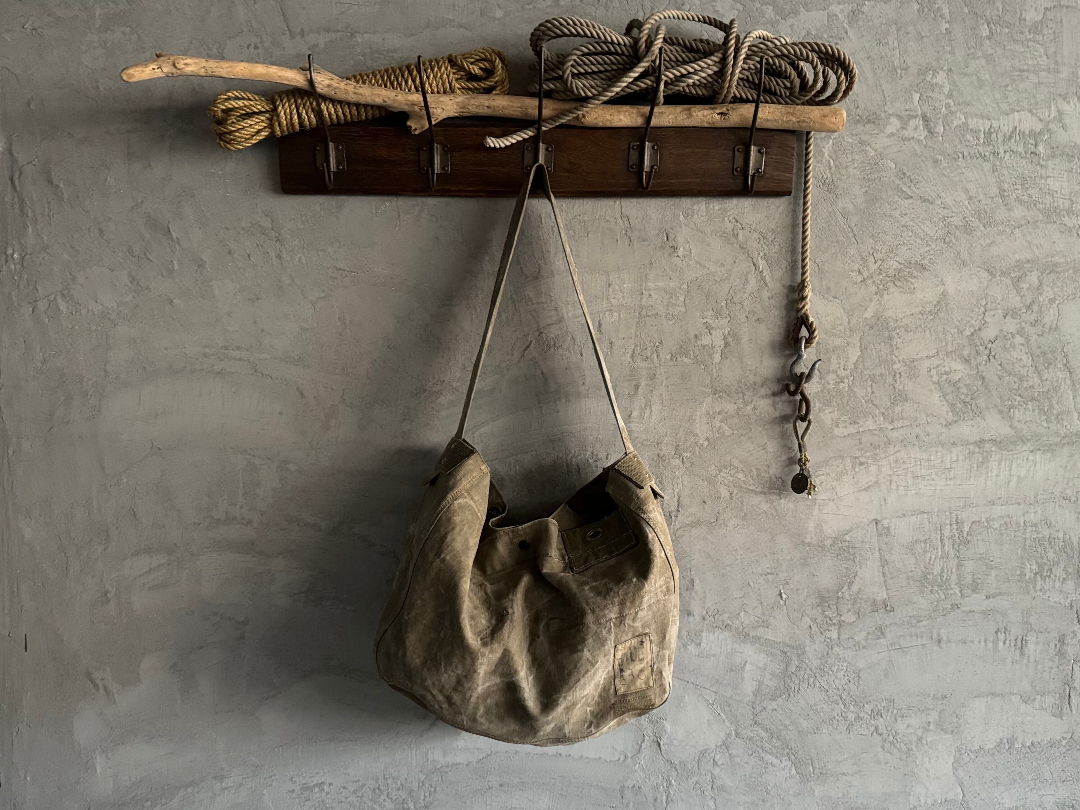 ボディーの生地は50年代頃、フランス軍のダッフルバッグ。リネン素材で、独特のクタッとした素材感、そして開口部についている楕円形のハトメ、インナーポケットのステンシルなど、ヴィンテージを感じさせるディテールが盛り込まれています。