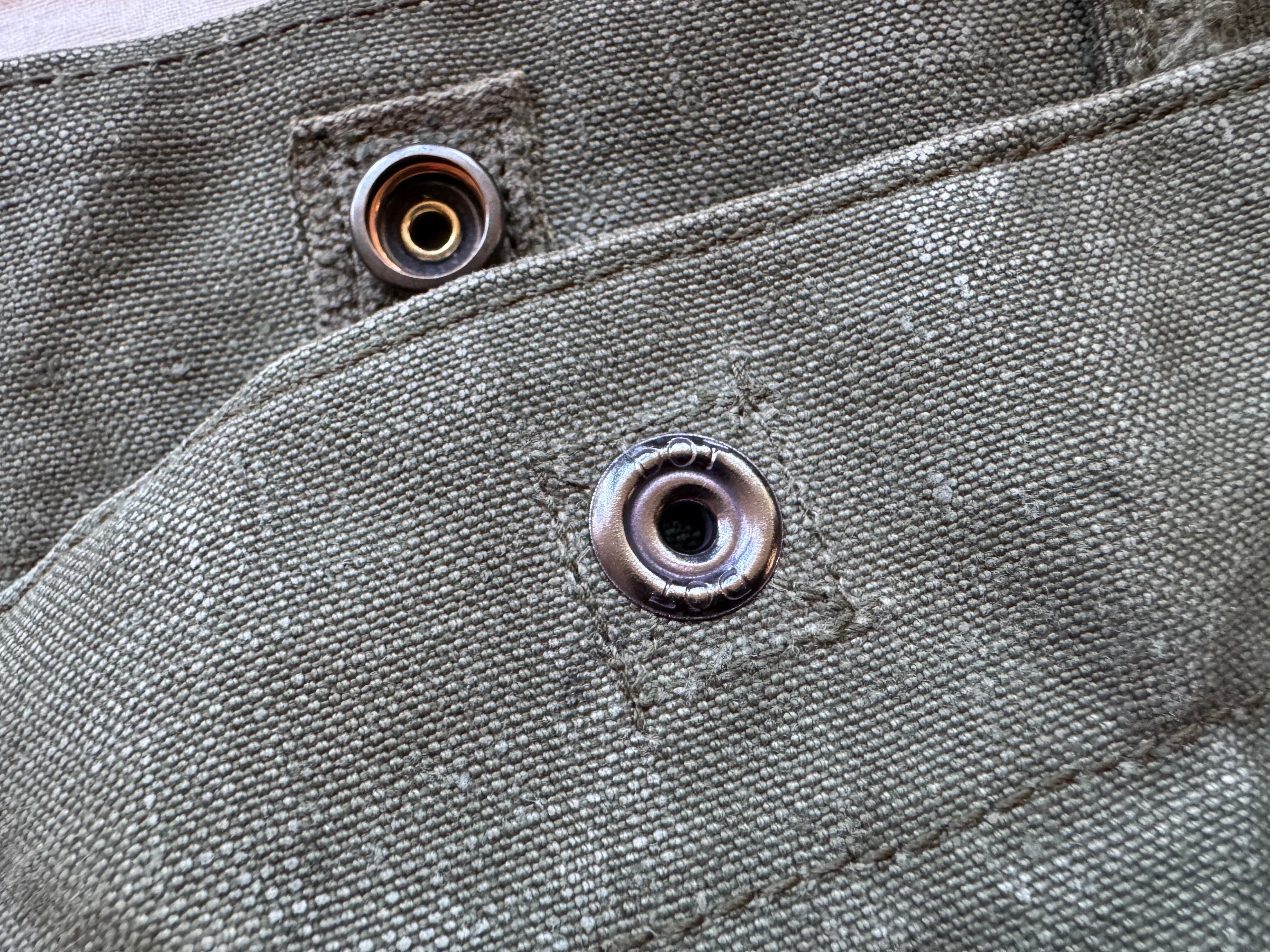開口部についているスナップボタンは、70年代、スコービル社が米軍に納入したデッドストックのドットボタンを使用してます。『DOT』の刻印も玄人にはグッとくるところかと。。。