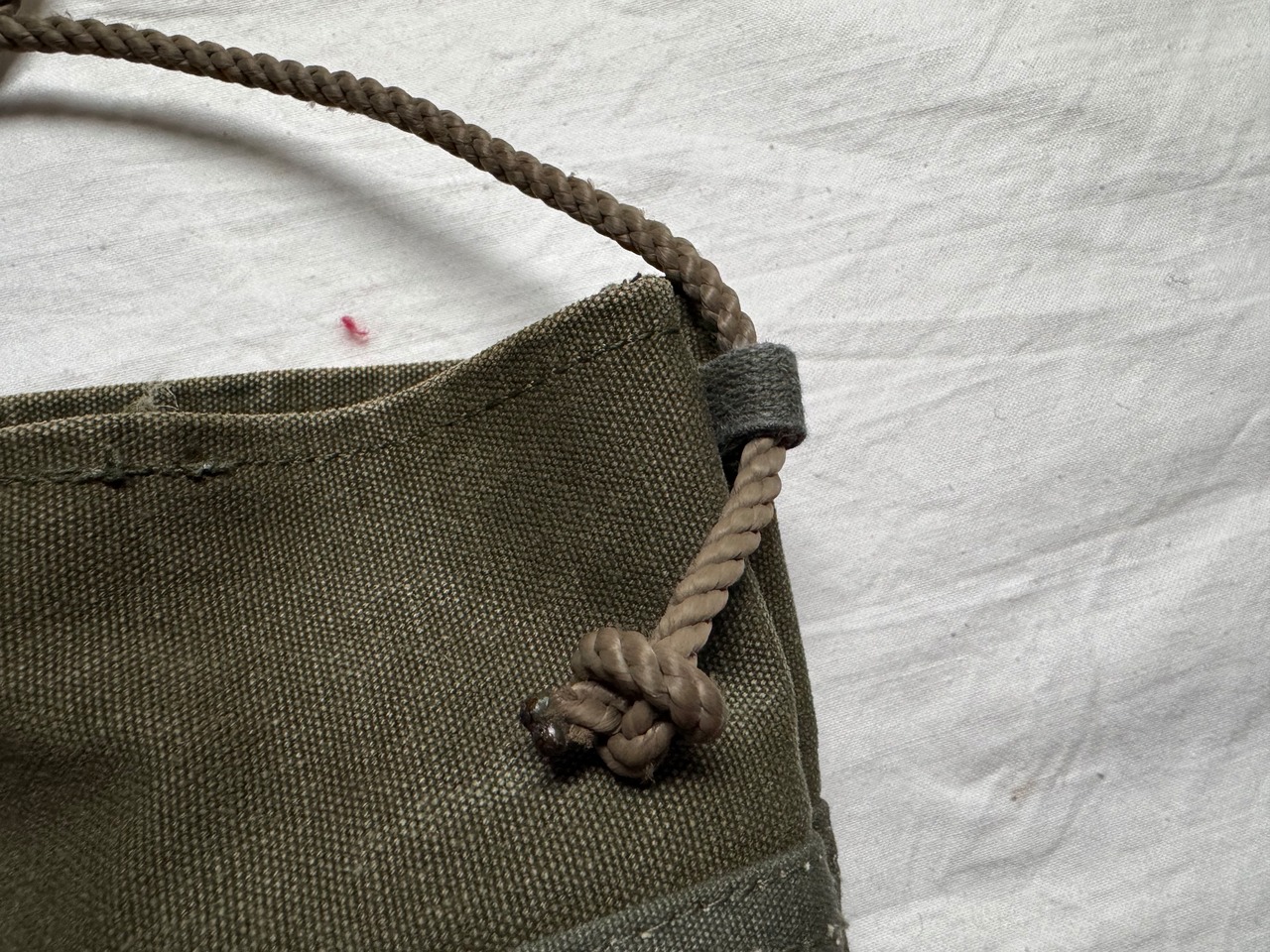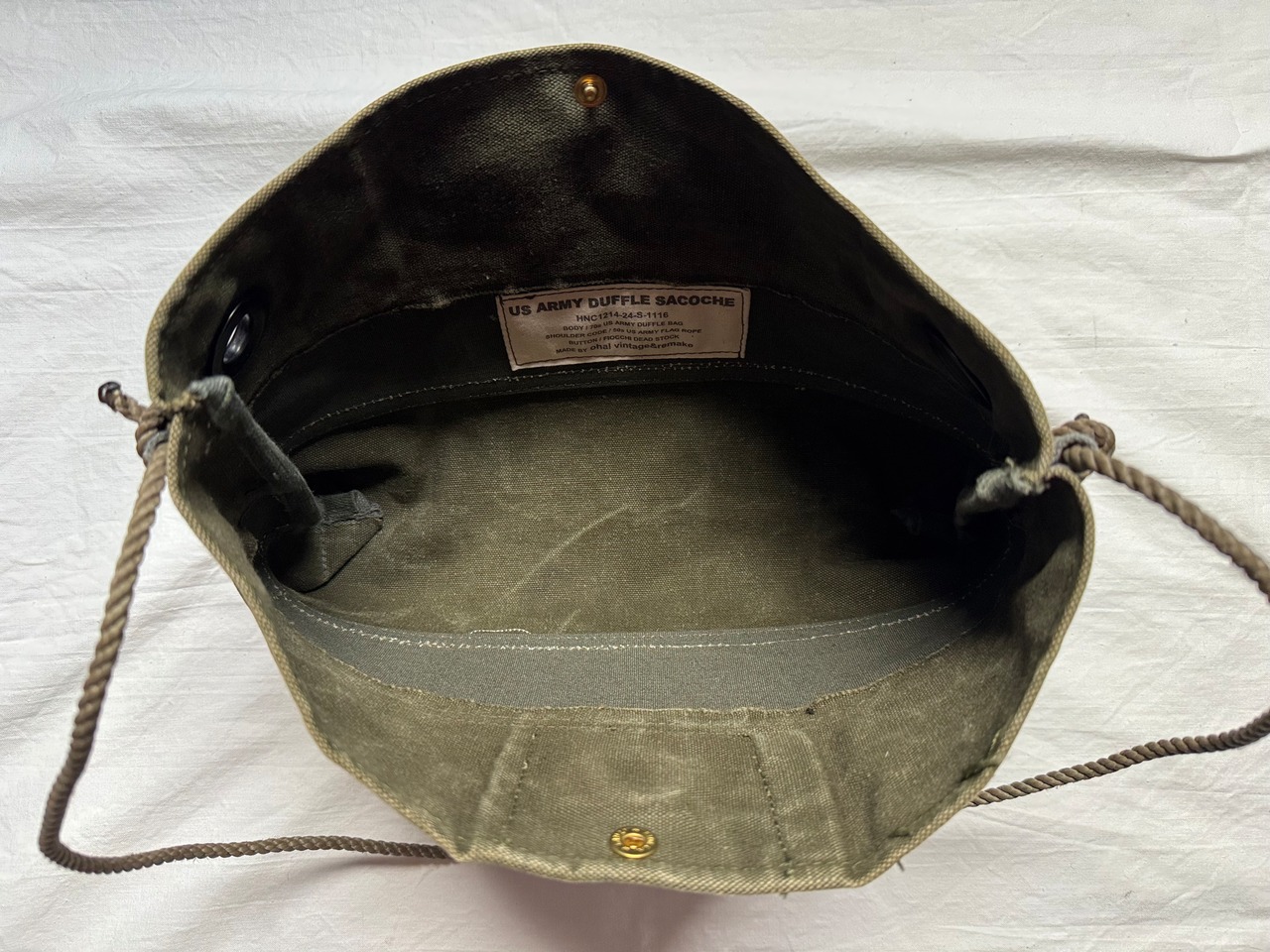 ボディーは70年代、アメリカ軍のダッフルバッグのキャンバス生地です。開口部はダッフルバッグの名残りであるハトメ部分を使用しています。その内側にはうっすらとミルスペックが残っており74年に軍へ納入されたことがわかります。