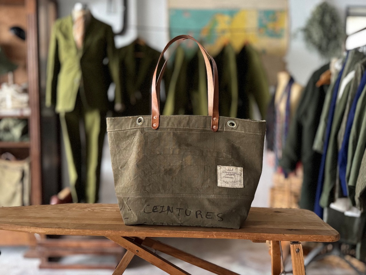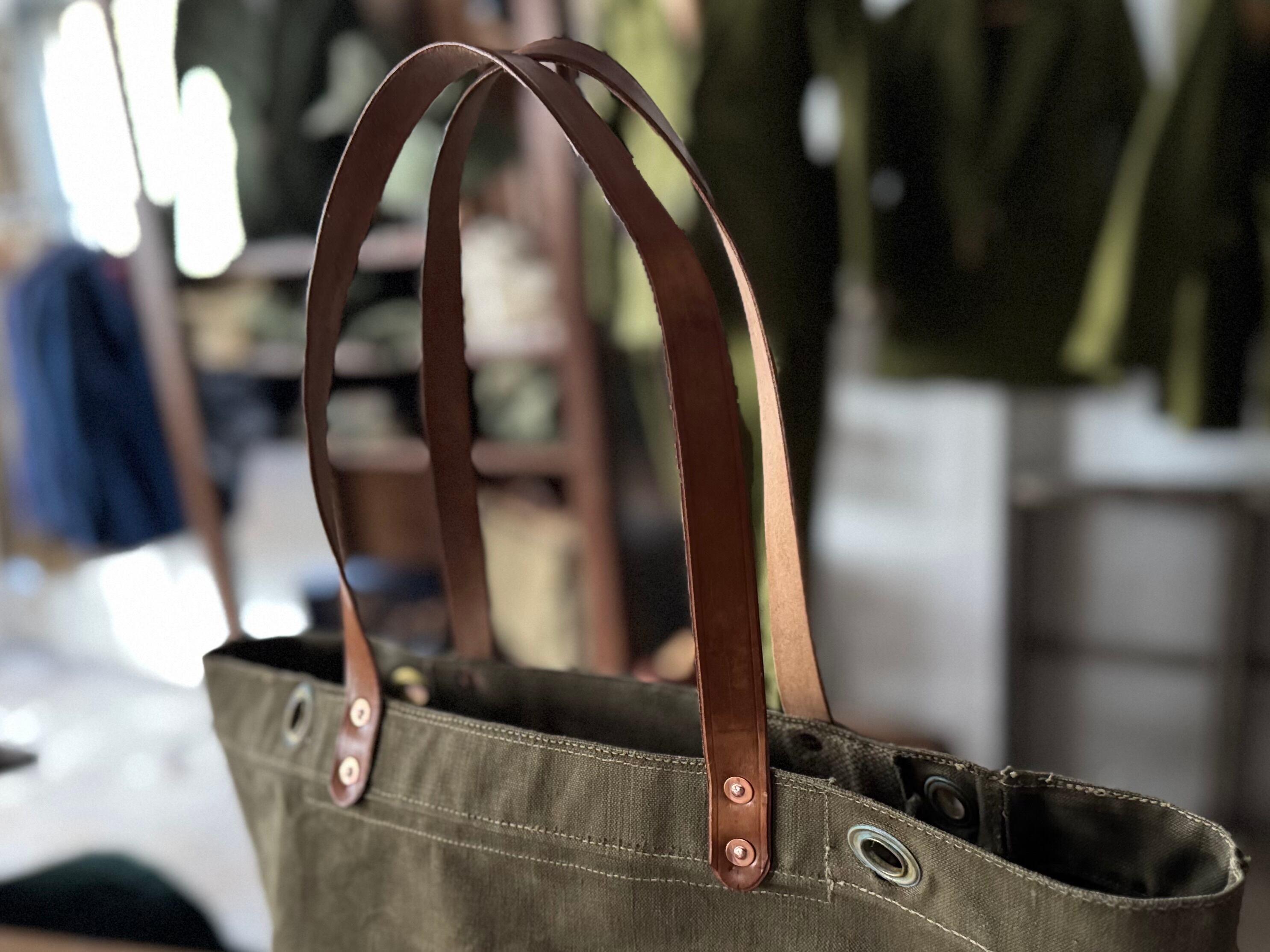 ボディーは1950年代のフランス軍で使用されていたダッフルバッグ。麻のような素材を含んだ、ガッシリとしたキャンバス。L.L.Beanのトートバッグ程の硬さはありませんが、中に何も入れずとも自立するくらいしっかりとしています。