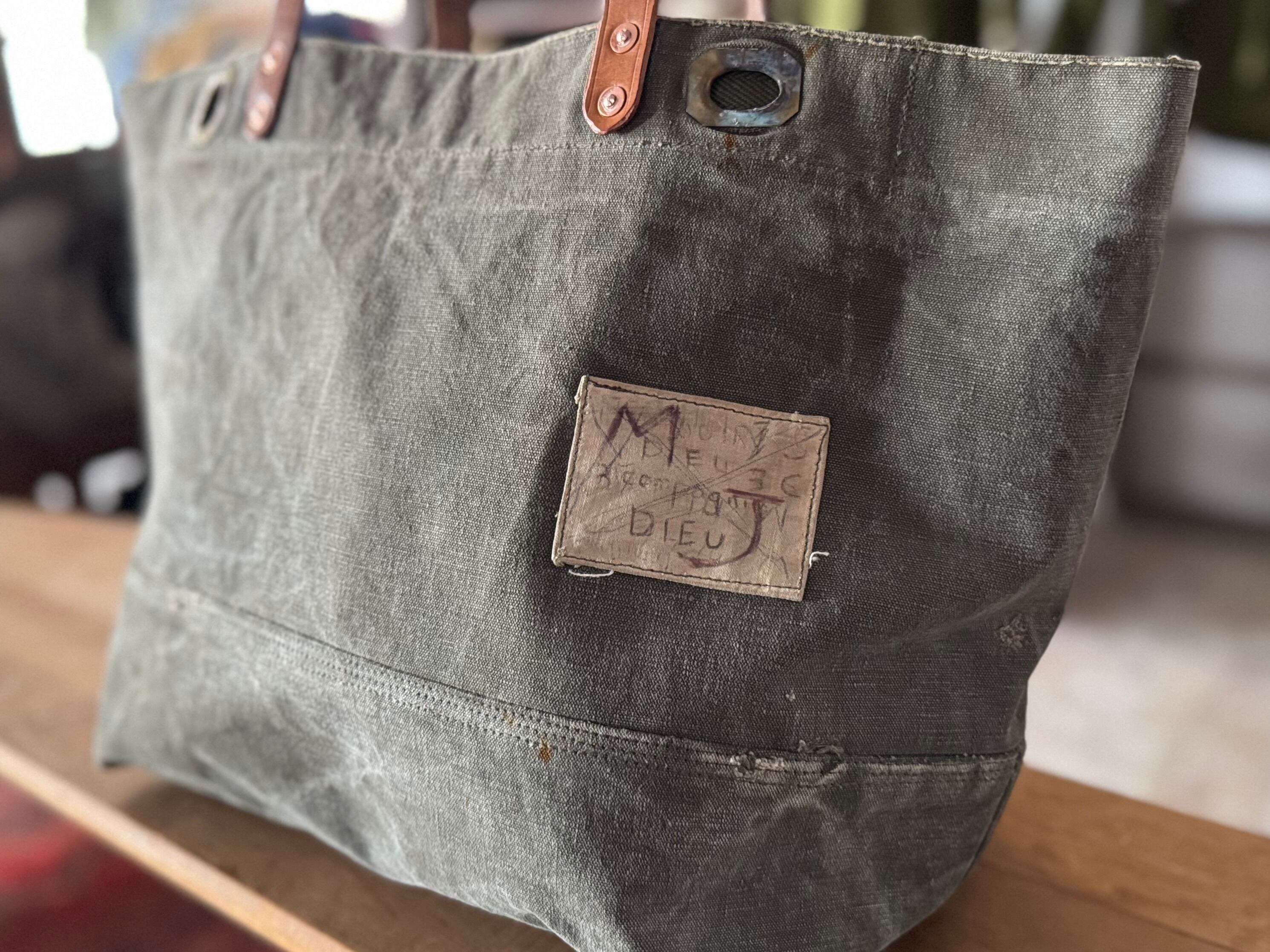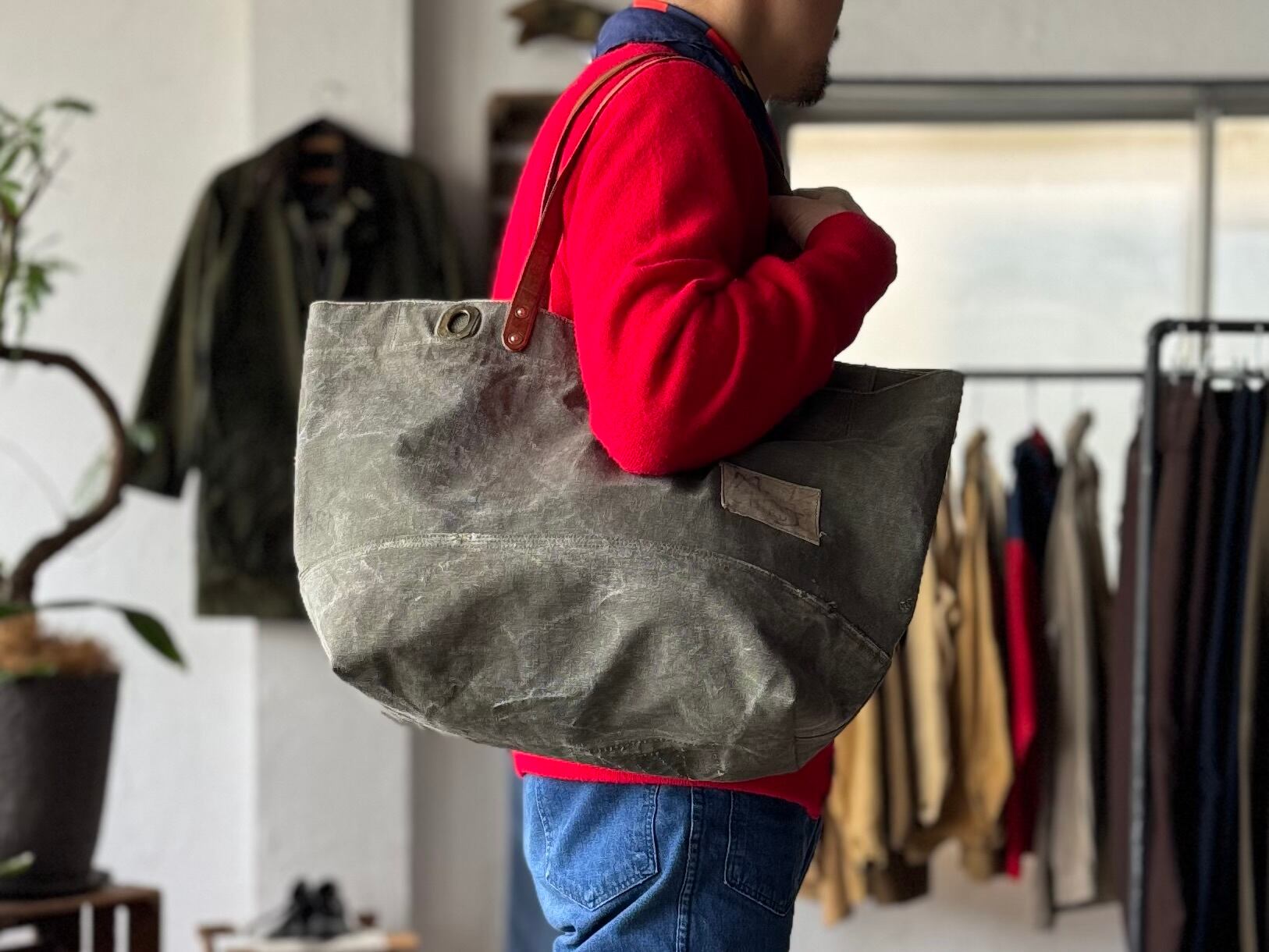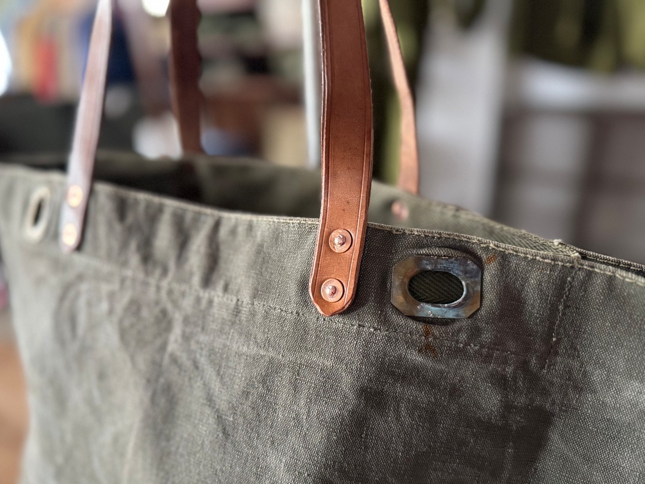 ボディーは1950年代のフランス軍で使用されていたダッフルバッグ。あまり見かけない形をしたハトメ、そして麻を含んだような、独特な雰囲気を醸し出す素材でヴィンテージ感満載です。